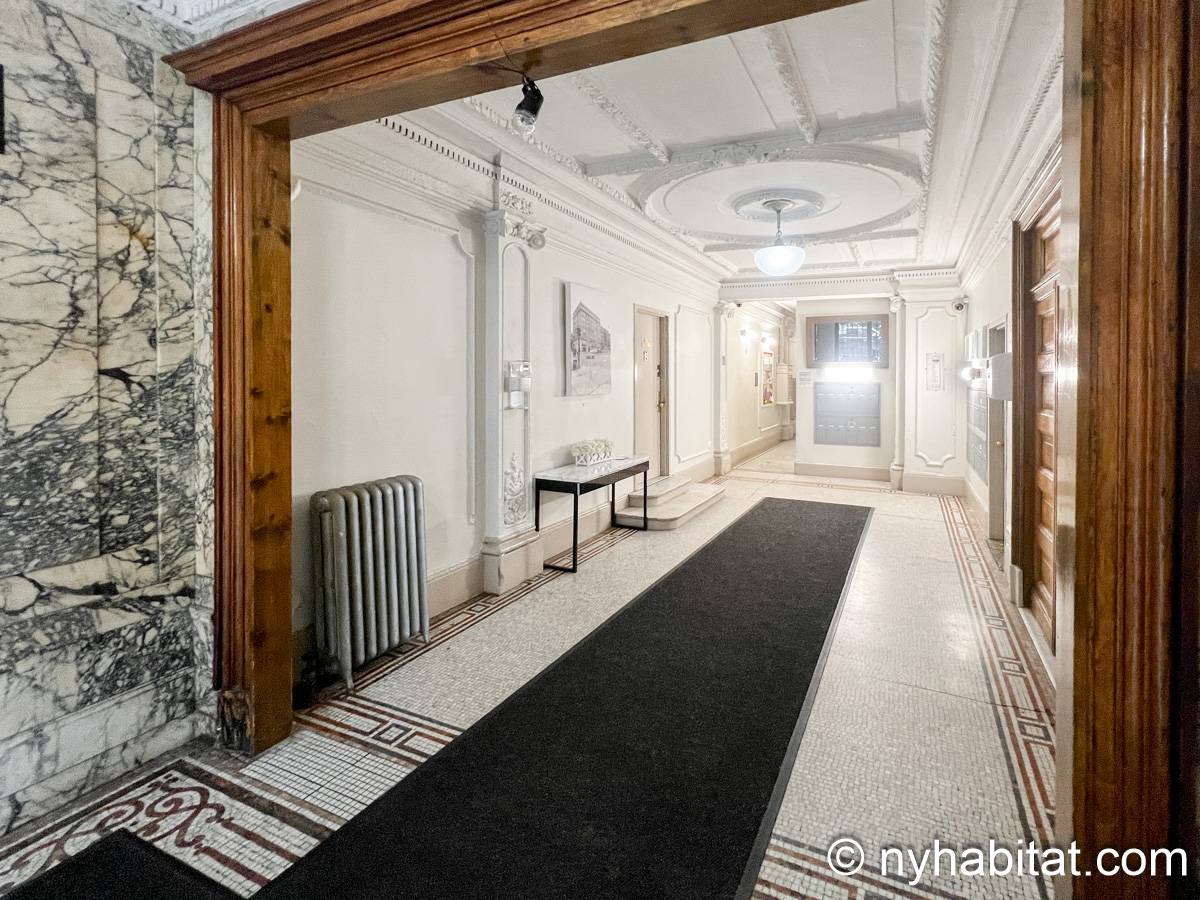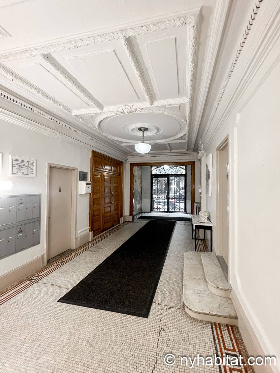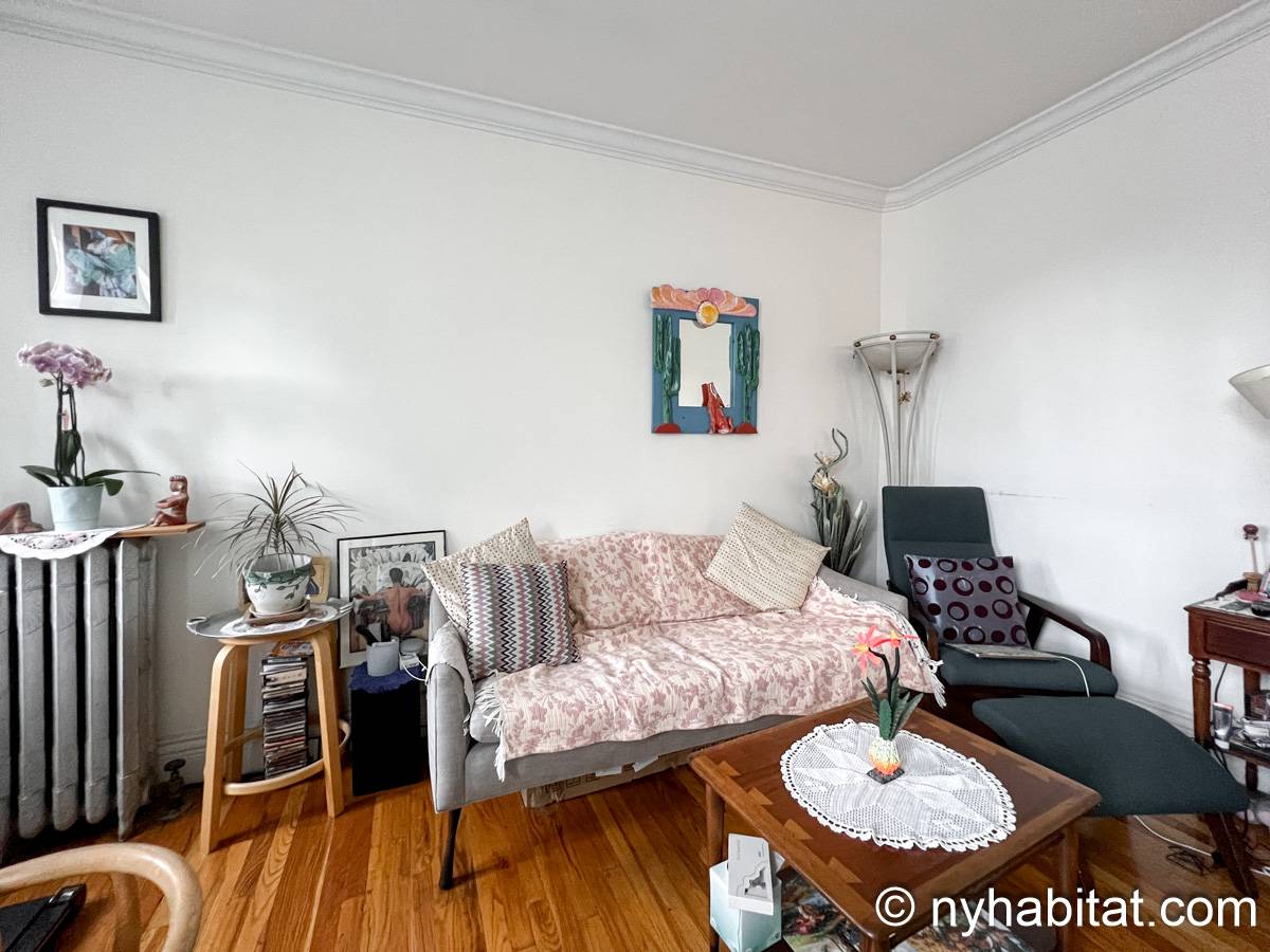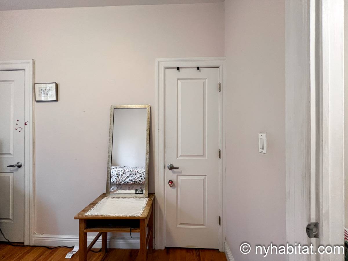 This furnished bedroom is in a shared apartment in Harlem, just off of the popular Lenox Avenue in uptown Manhattan, New York. The three-bedroom apartment is in a low-rise building with an elevator, found on the 4th floor. There is a buzzer/intercom system for easy entry for guests.