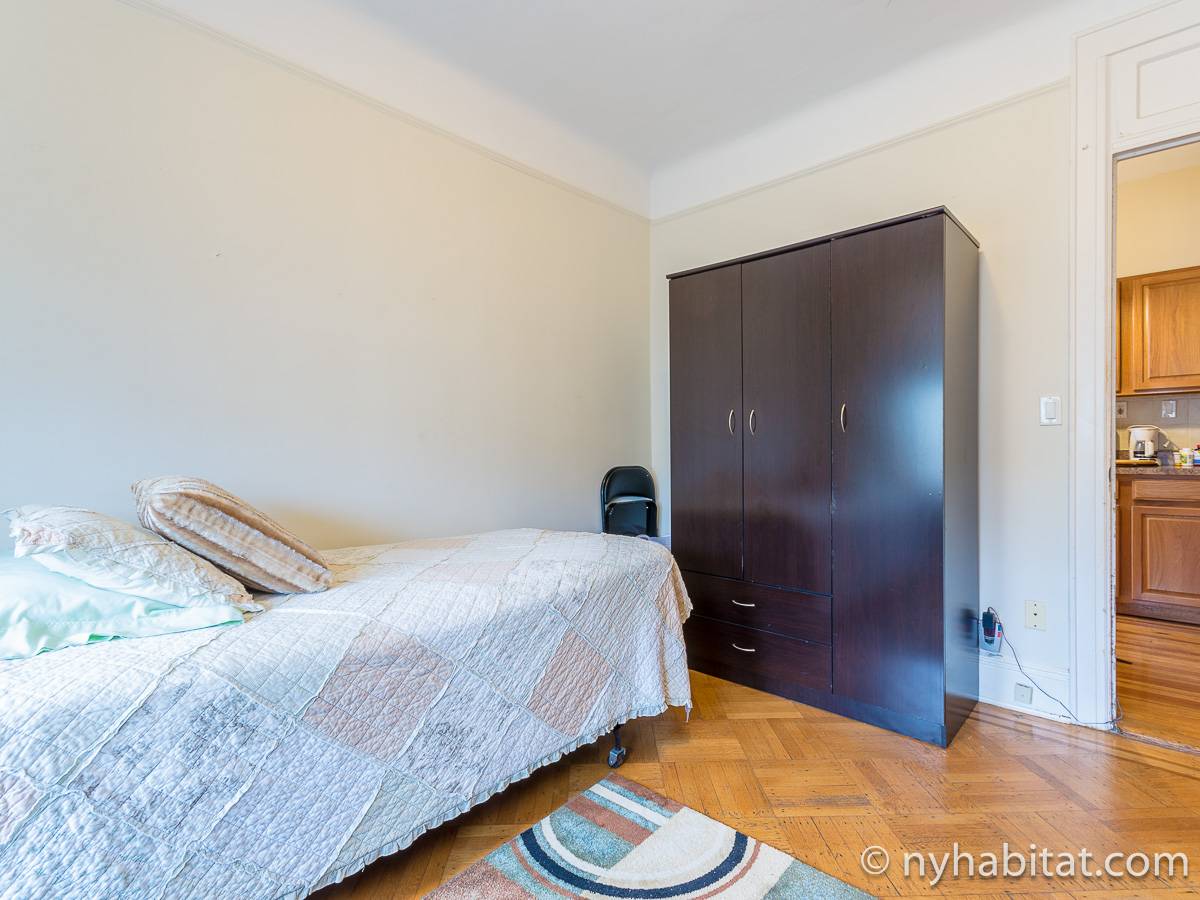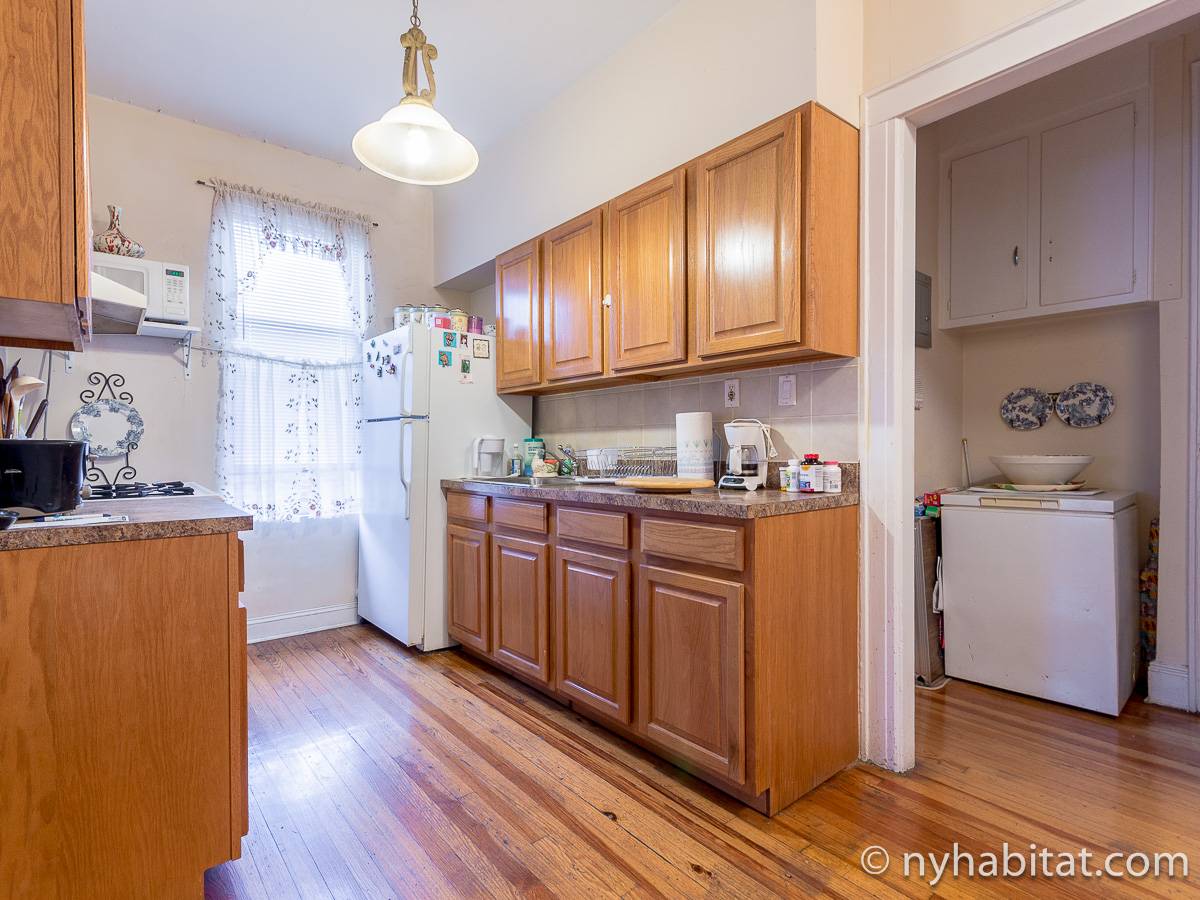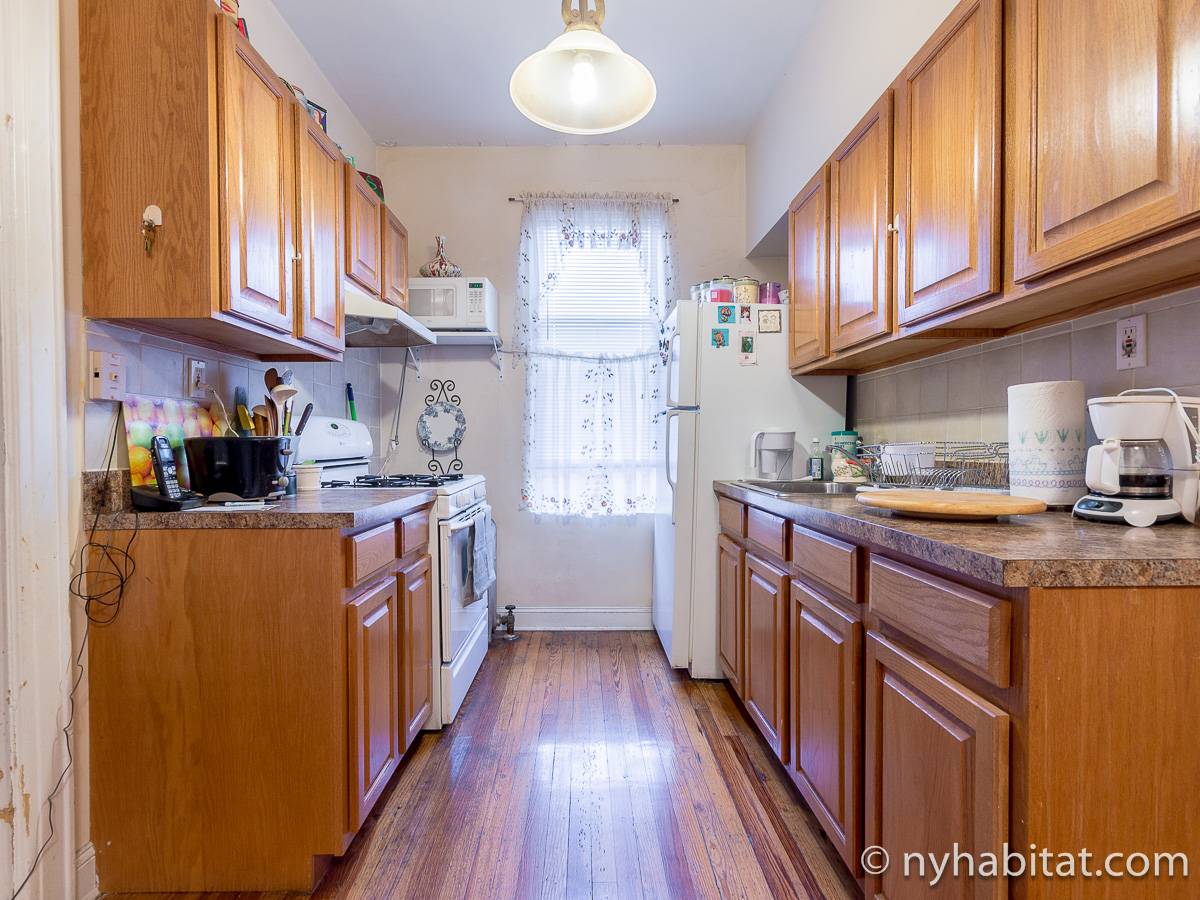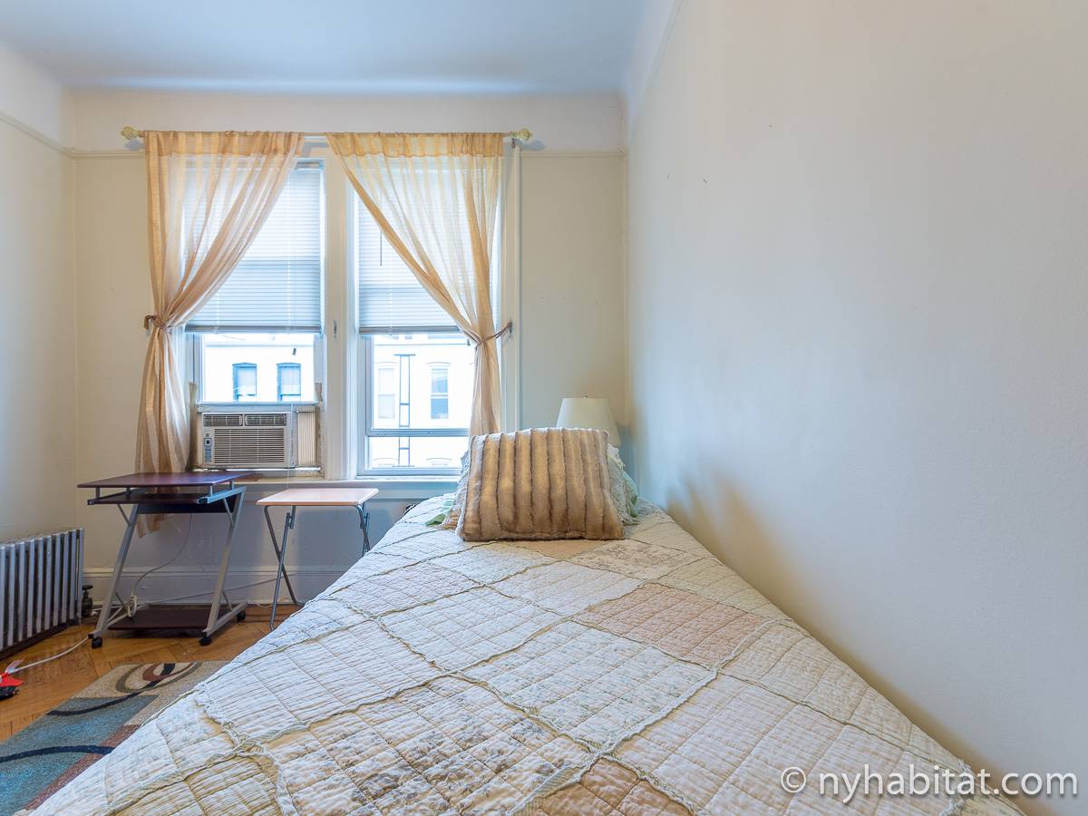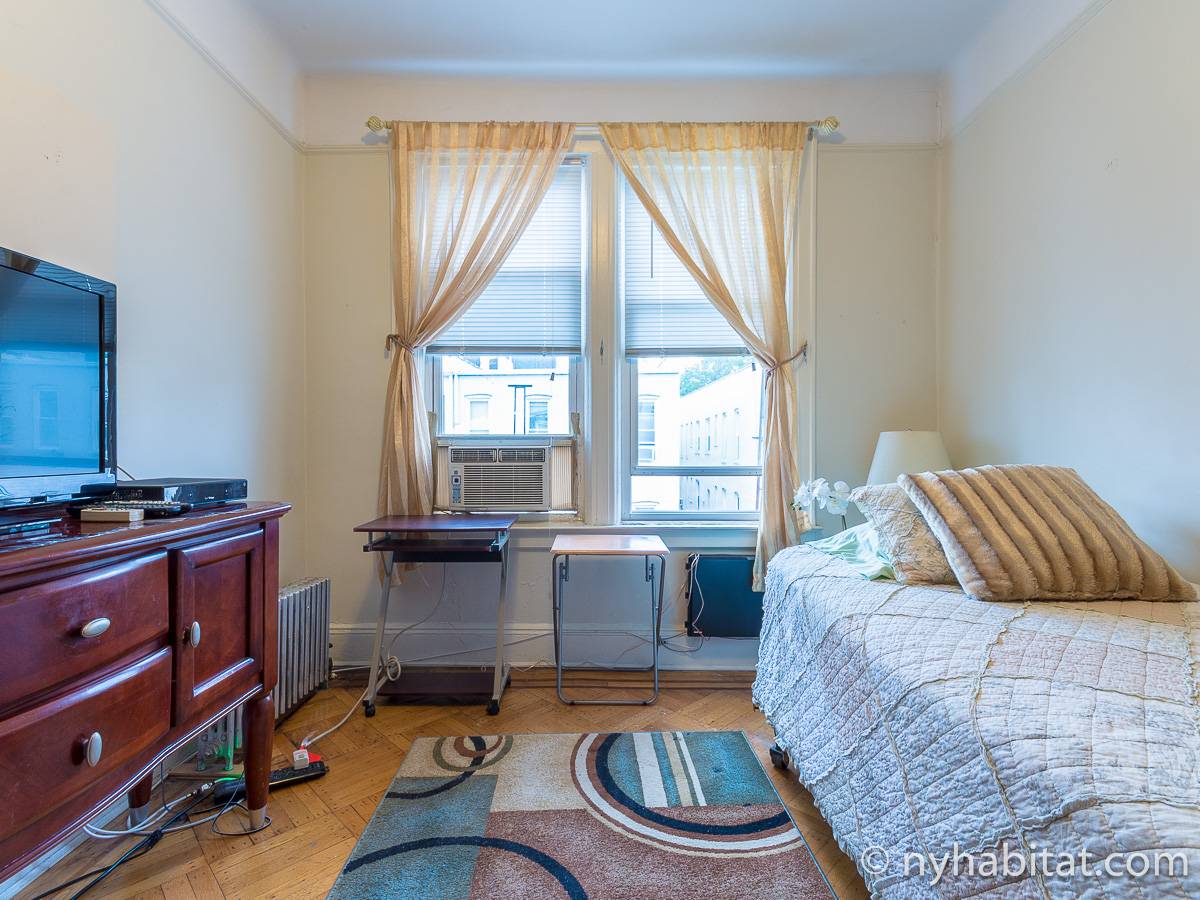 Bedroom #1 is the available bedroom for rent, and benefits from having a double set of windows that overlooks the backyard garden, to the rear of the building. These windows looks westward and have rolling blinds that can be used when privacy is preferred over natural light. The room has more than basic furnishings, with a mini fridge and flat screen television in addition to the single size bed and armoire. There is also an air conditioning unit to allow you to fully enjoy NYC's infamous hot summers! This apartment share works to maximize the amount of light in every room. The other room of this two bedroom apartment is occupied by the owner, while the kitchen and bathroom are shared. The kitchen has warm wood tones and white appliances, with a dining table as well as a window. In the bathroom, you will find a combination bathtub/shower with another window!