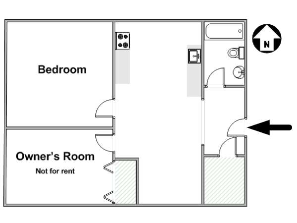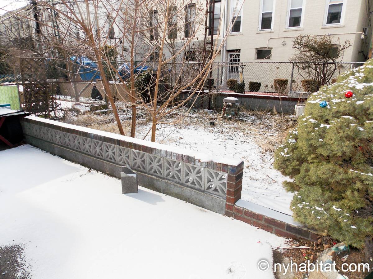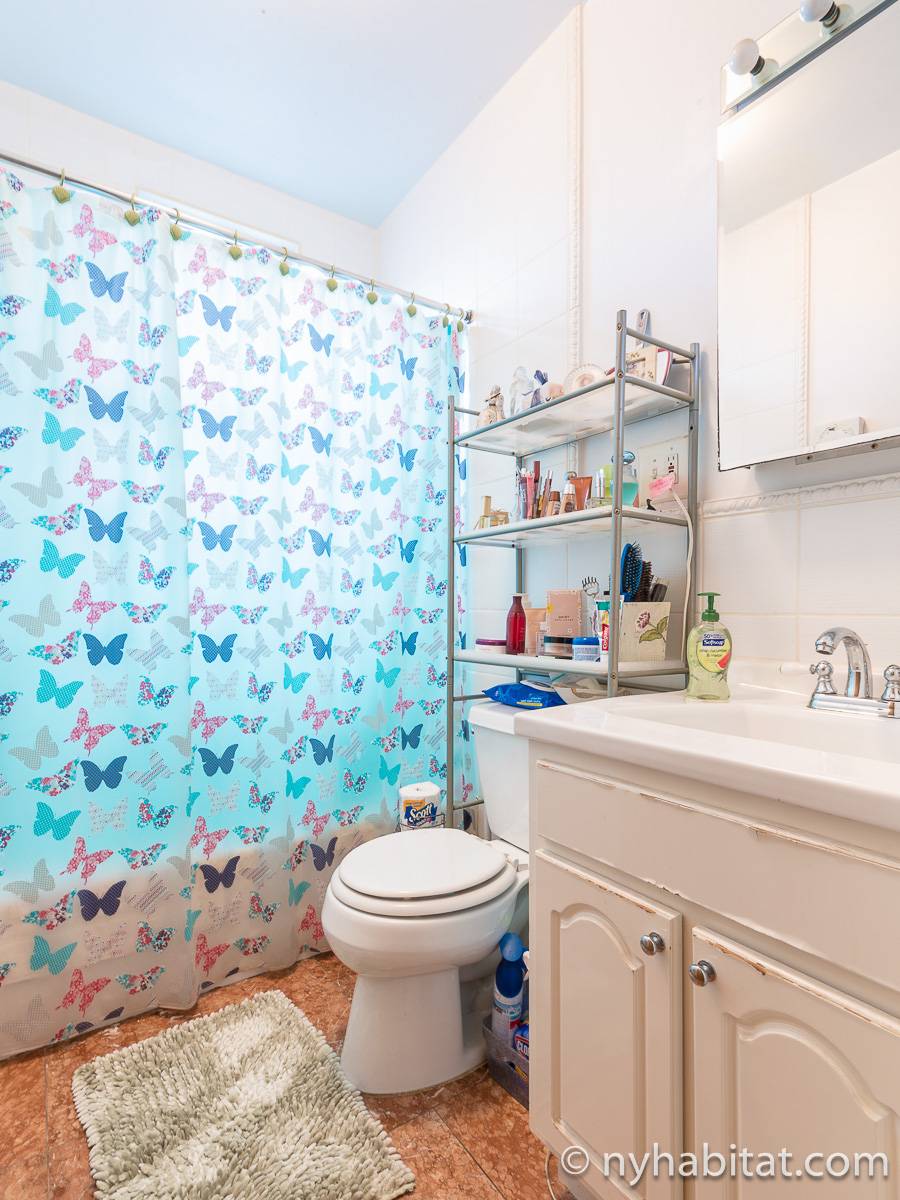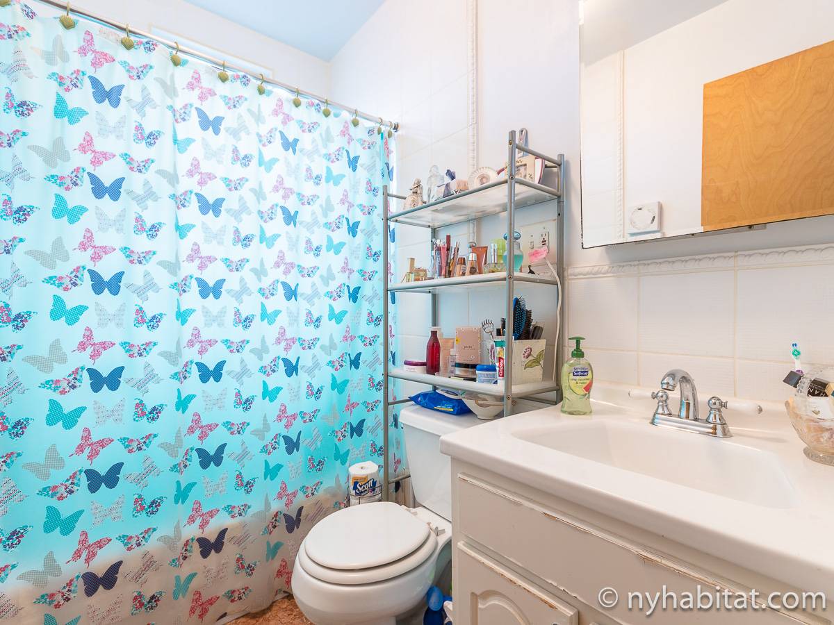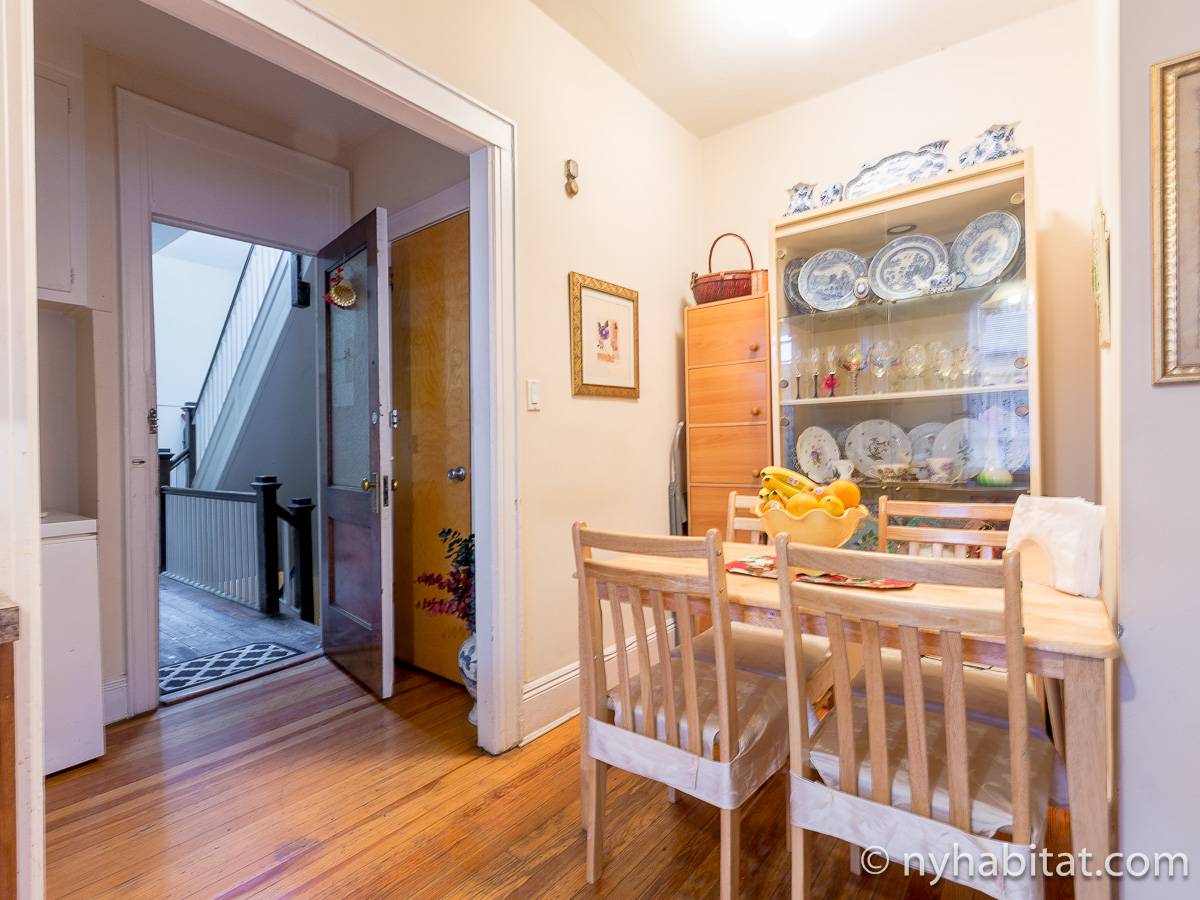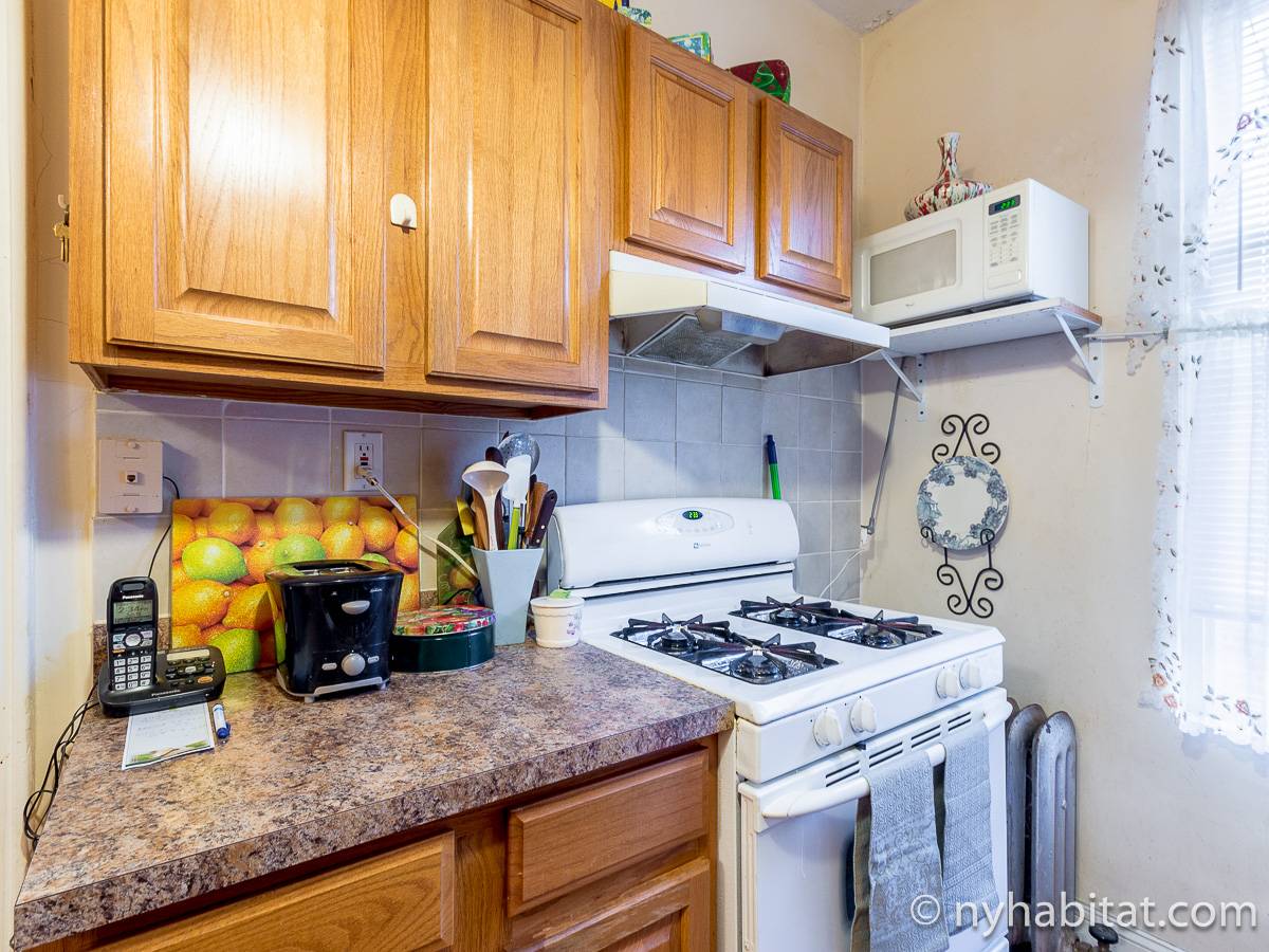 Bedroom #1 is the available bedroom for rent, and benefits from having a double set of windows that overlooks the backyard garden, to the rear of the building. These windows looks westward and have rolling blinds that can be used when privacy is preferred over natural light. The room has more than basic furnishings, with a mini fridge and flat screen television in addition to the single size bed and armoire. There is also an air conditioning unit to allow you to fully enjoy NYC's infamous hot summers! This apartment share works to maximize the amount of light in every room. The other room of this two bedroom apartment is occupied by the owner, while the kitchen and bathroom are shared. The kitchen has warm wood tones and white appliances, with a dining table as well as a window. In the bathroom, you will find a combination bathtub/shower with another window!