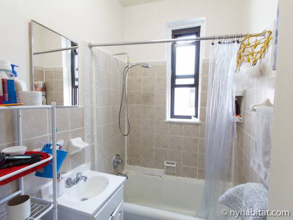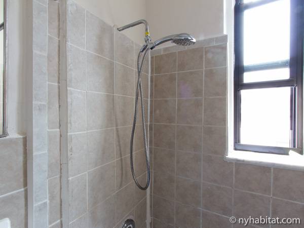 The shared, separate kitchen presents tiled floors and a large window for ventilation. One long dining table and most necessary cooking appliances are provided. The shared bathroom includes a full-sized tub/shower with curtain and a window for ventilation.