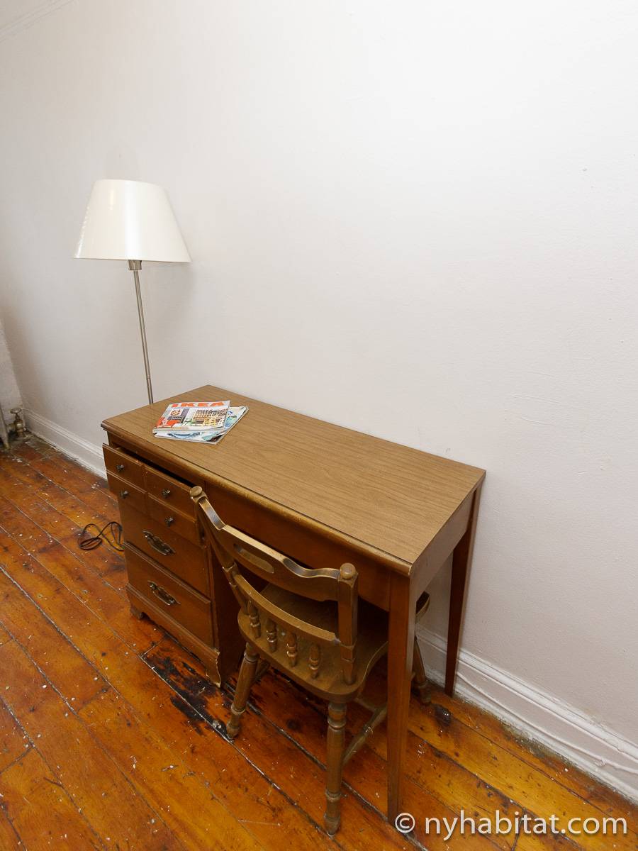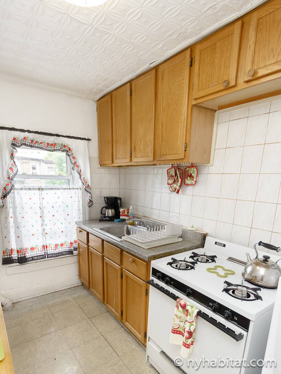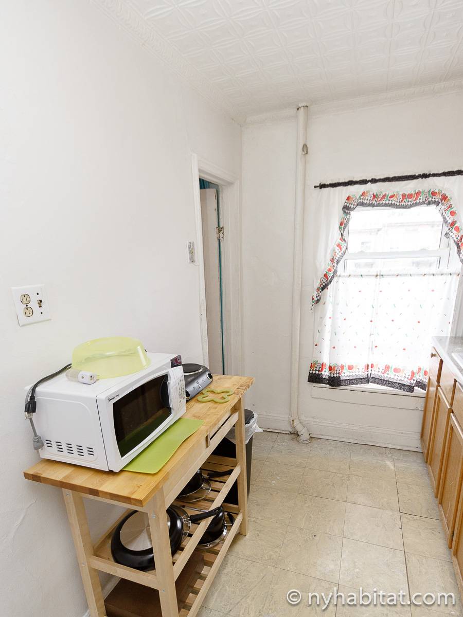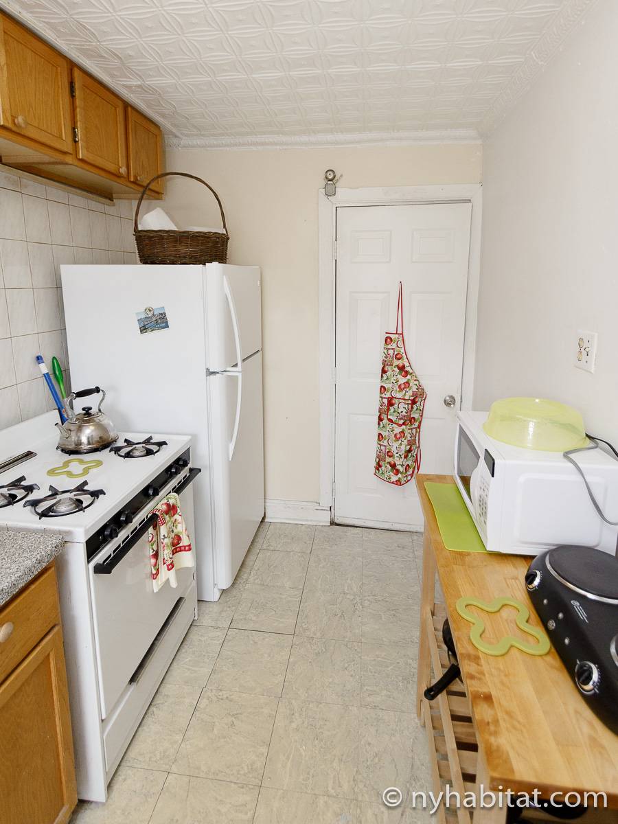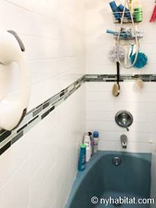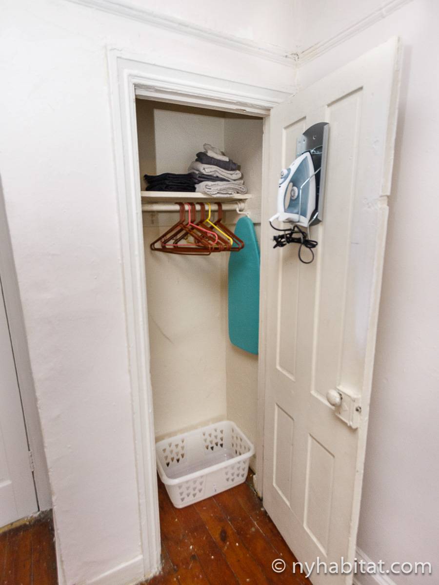 With its long, thin hardwood floors and high ceilings, this NYC apartment share is a great option for single travelers and students. There are two private bedrooms for rent: Bedroom 1 spans approximately 167sqft (15.5sqm) and is furnished with a single bed, a TV with a Roku player and two closets for storage. Bedroom 2 spans 193sqft (18sqm), also has a twin bed and offers exclusive access to an office space furnished with another single bed, sofa and desk. Both bedrooms offer plenty of floor space, large windows, and for chests for boom shelves for storage. The remainder of the apartment is shared with a roommate and includes a kitchen with all essential cooking appliances and cabinetry, and a full-sized bathroom with a large tub that includes a showerhead.