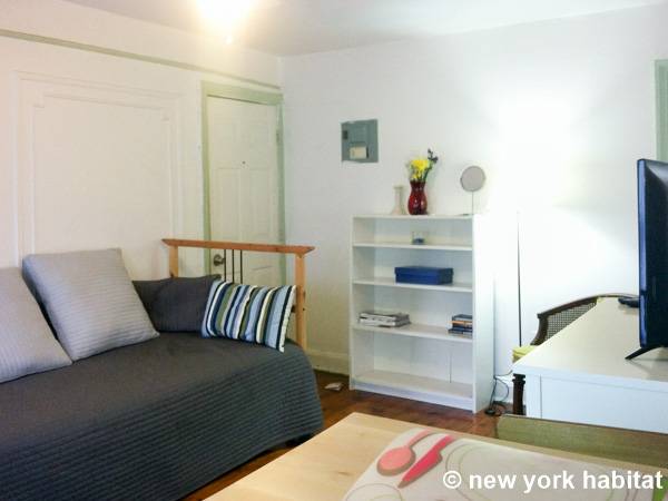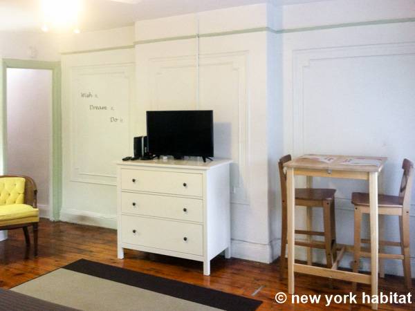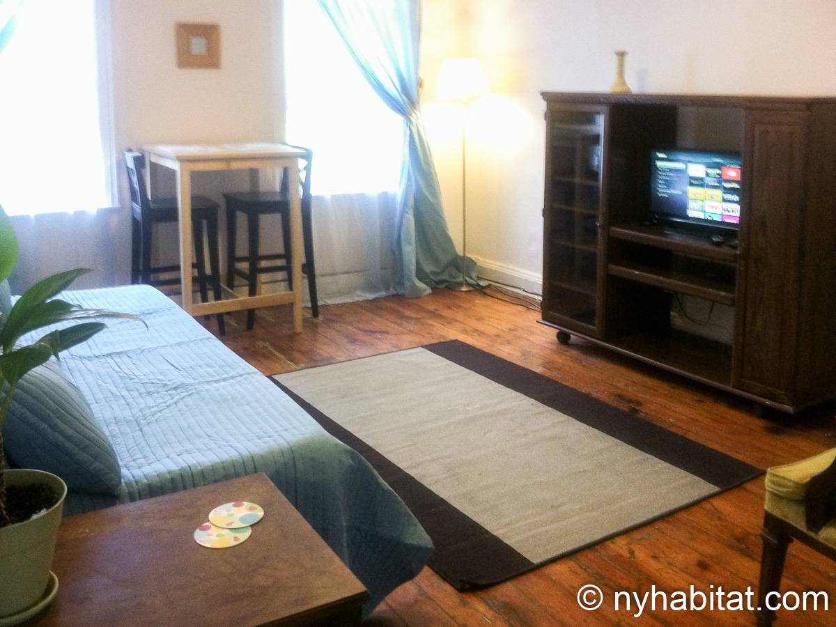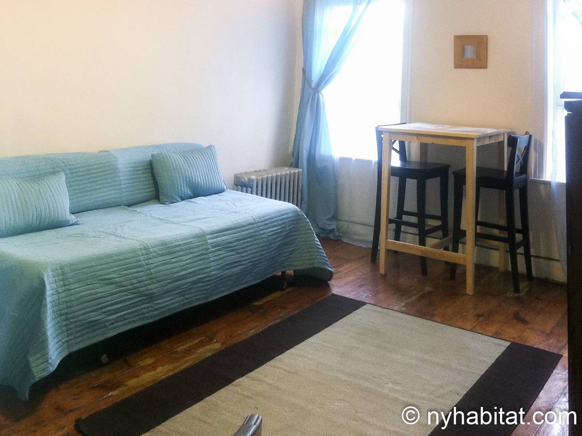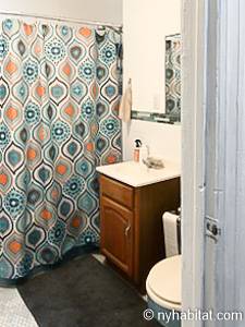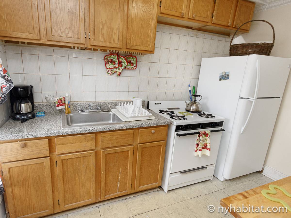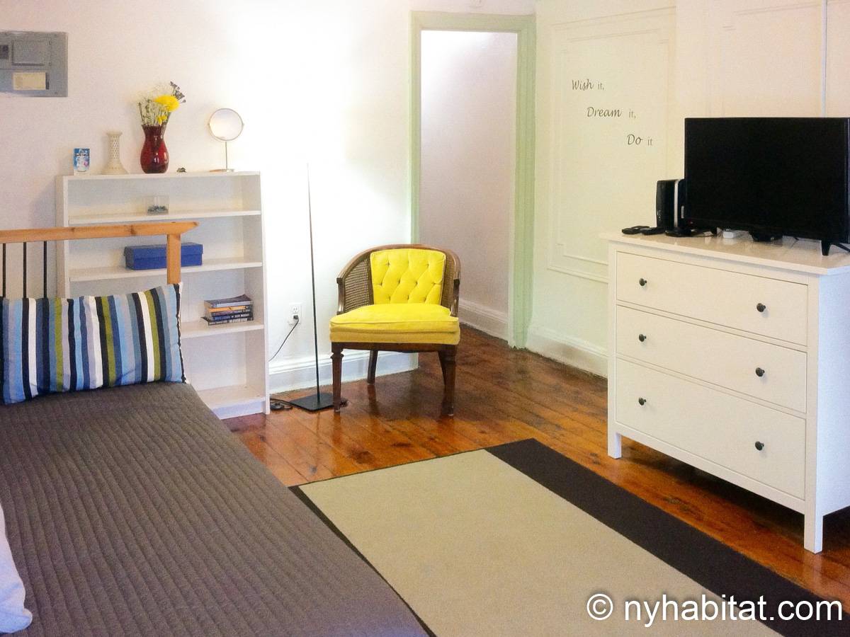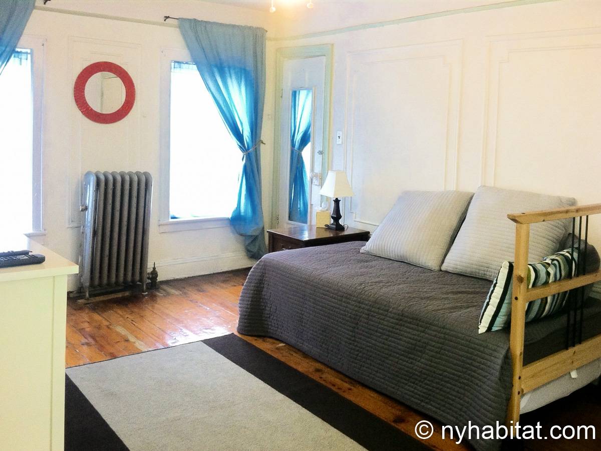 With its long, thin hardwood floors and high ceilings, this NYC apartment share is a great option for single travelers and students. There are two private bedrooms for rent: Bedroom 1 spans approximately 167sqft (15.5sqm) and is furnished with a single bed, a TV with a Roku player and two closets for storage. Bedroom 2 spans 193sqft (18sqm), also has a twin bed and offers exclusive access to an office space furnished with another single bed, sofa and desk. Both bedrooms offer plenty of floor space, large windows, and for chests for boom shelves for storage. The remainder of the apartment is shared with a roommate and includes a kitchen with all essential cooking appliances and cabinetry, and a full-sized bathroom with a large tub that includes a showerhead.