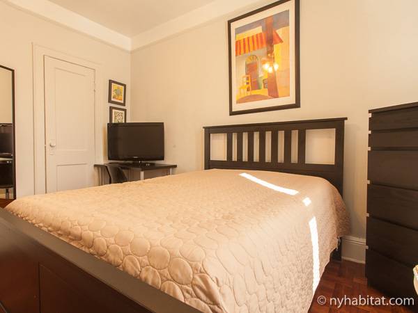 Bedroom 1 is the first private room for rent. With parquet hardwood floors, the room has a closet and is furnished with a full-sized bed with bedding, an air conditioning unit, and a flat screen TV.