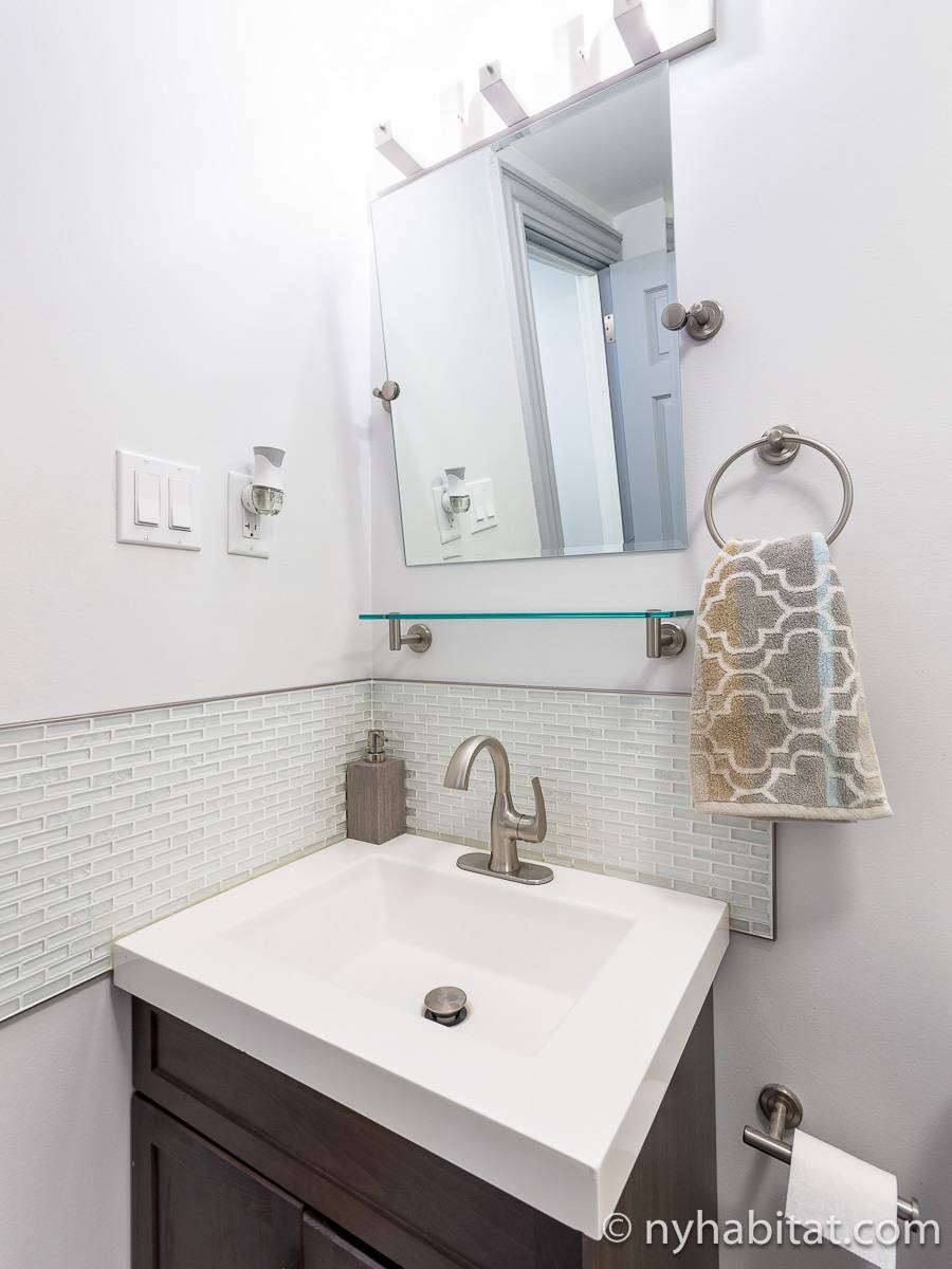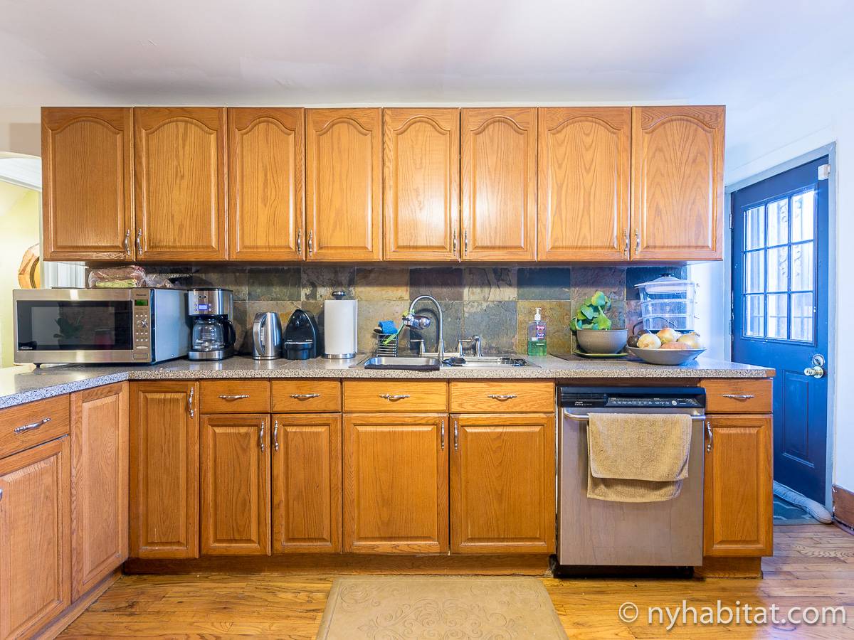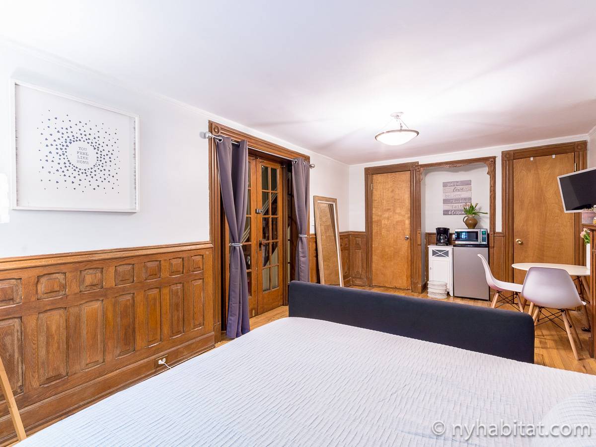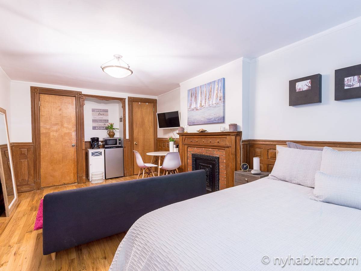 In the furnished room to rent a contemporary and classic look fills the space. A queen-sized bed is placed in between the decorative fireplace and the two windows.The living area gives a space to get work done and a sofa is available to lounge and relax from a long day. Take advantage of the closet space and appliances in the room. The large open kitchen has stainless steel appliances, L-shaped countertops, and dining table. The bathroom is completely modern to get ready in a stylish atmosphere. Be sure to enjoy the garden oasis in the backyard of this townhome!