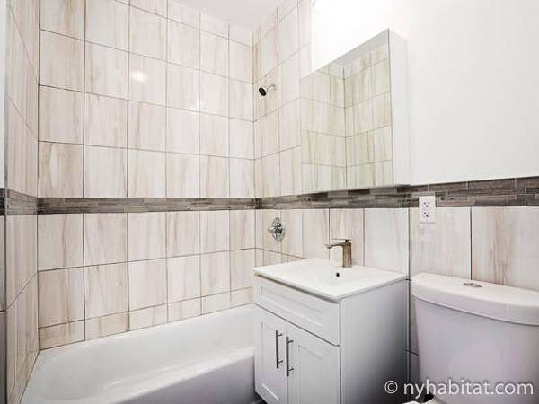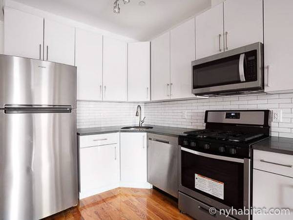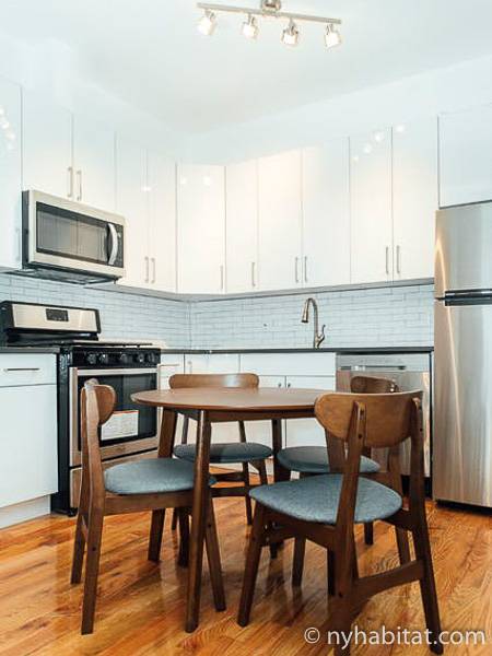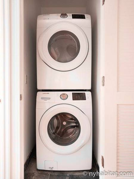 The brown hardwood floors and brick walls in this fully furnished apartment give it a smooth, antique feeling! In the living room, you will find a TV, sofa, and table. This open-concept room gives you more than enough space! The kitchen is white and gray with stainless steel appliances giving a modern look! It features a fridge, oven, freezer, dishwasher, and microwave! It also has a four-person round table with chairs just in case you plan to enjoy a meal at home with friends or family. Relax after a busy day in NYC; the full bathroom has a classic white and gray look with a shower/tub combination! Each of these spaces are shared with roommates. Each of the two bedrooms that are available offer private space with double sized beds, air conditioning if needed, windows to brighten up your room, and closet space to neatly organize your belongings! No trip to the laundromat will be needed since this apartment offers the convenience of its private washing machine and dryer.