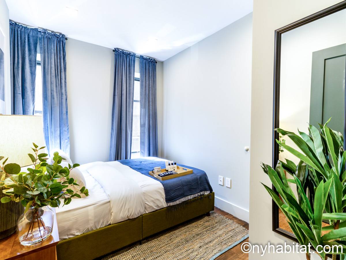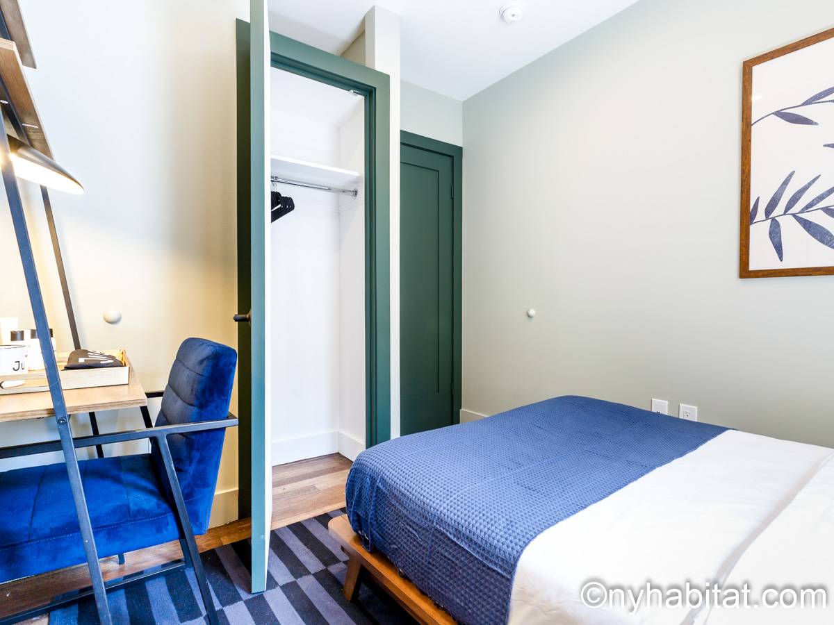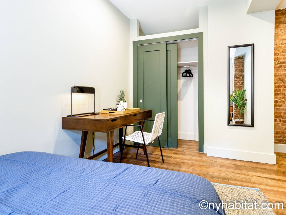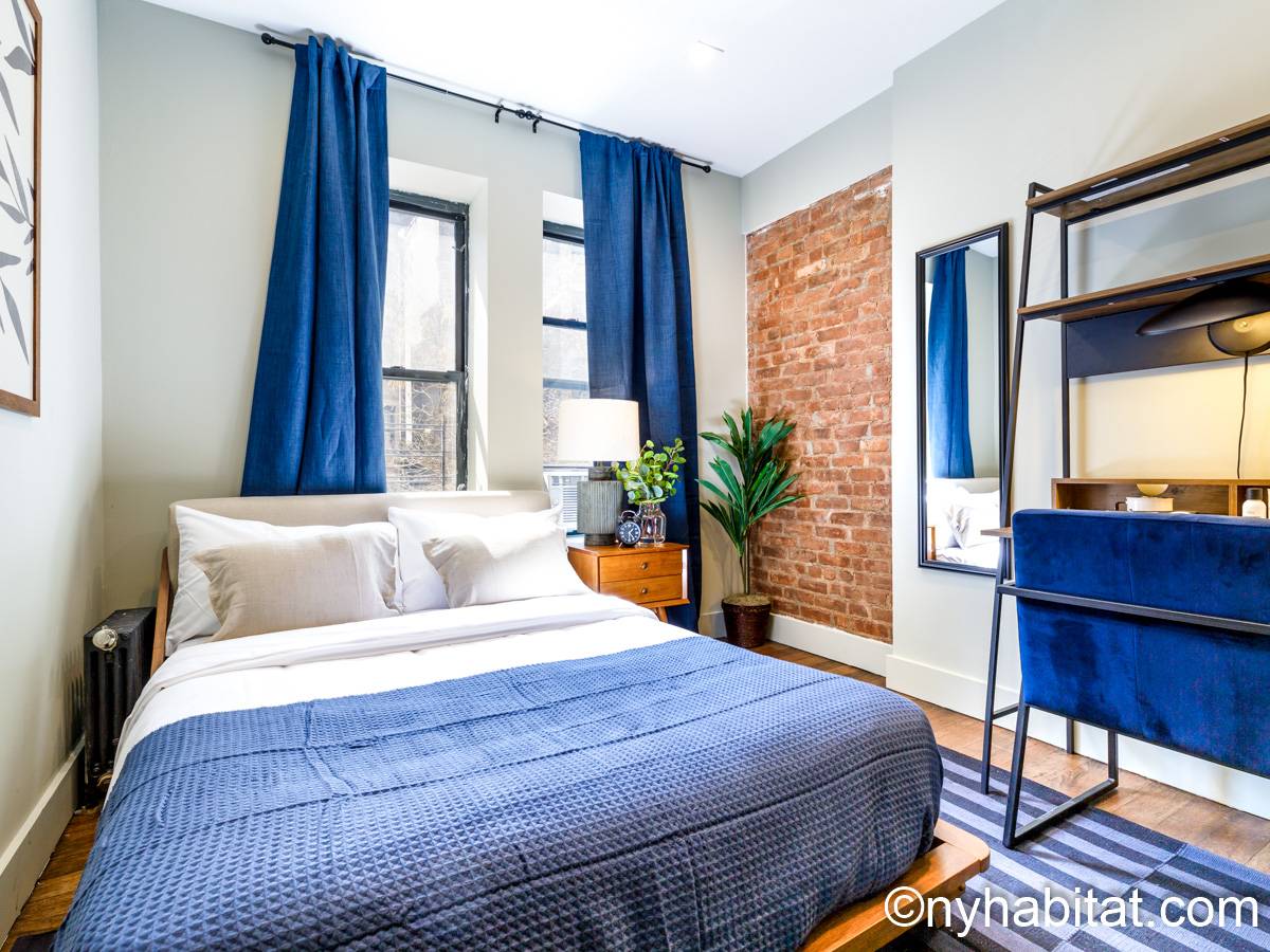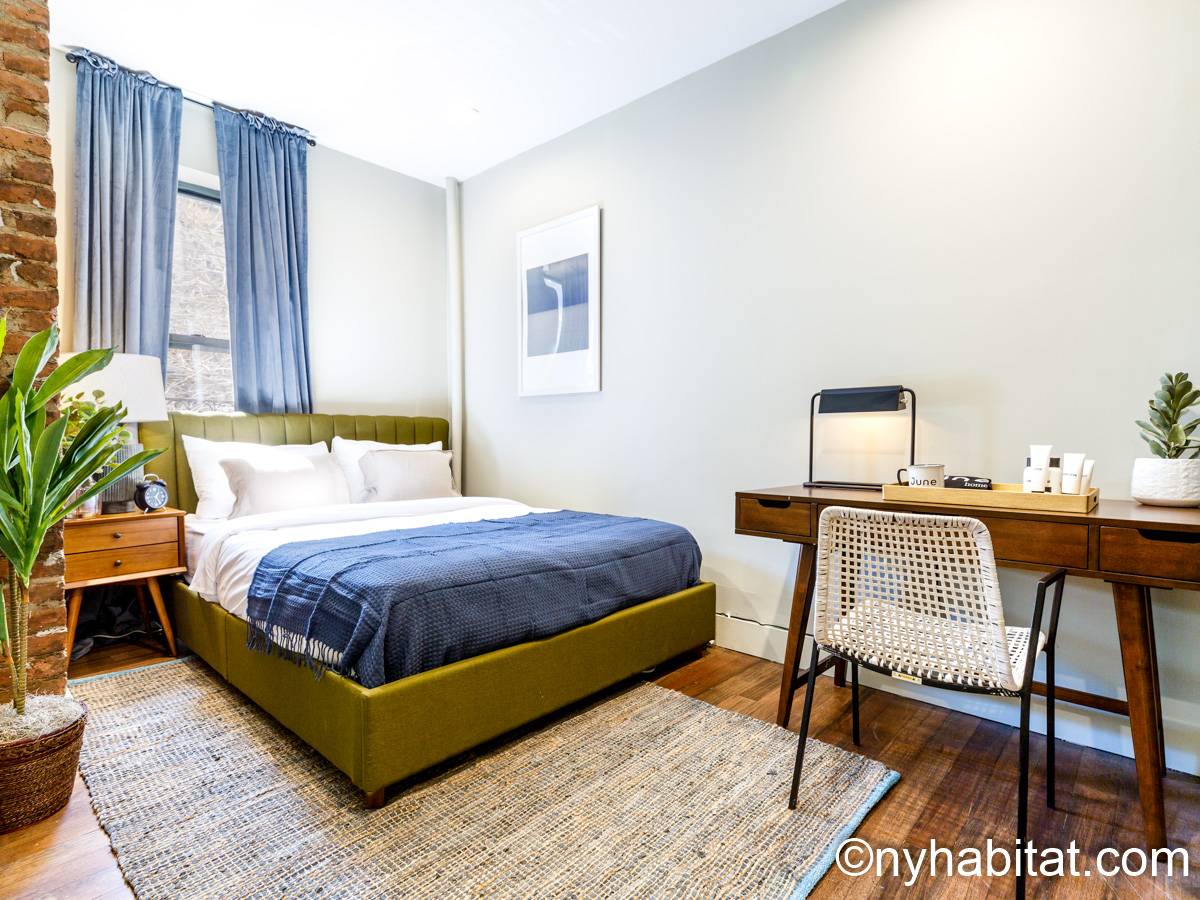 Walking into this apartment, you enter into the common room, where you have a combination of the living room and kitchen. Here you will find a dining table that easily seats three, a TV, an air conditioning unit, a refrigerator, a microwave, coffeemaker, toaster, dishwasher, and two windows that allow the flow of natural light into the space. What is unique about this apartment is that one wall in the hallway is brick, a true classic New York City rare characteristic. All three bedrooms are fully furnished and have air-conditioning. Two of the three bedrooms have a queen-size bed, exposed brick interior, and a desk. The remaining bedroom is a full-size bed. In the bathroom you have a rain overhead shower, a water closet, and a sink with cabinetry for any toiletries. This apartment is covered in hardwood floors and has a washer and dryer in unit.