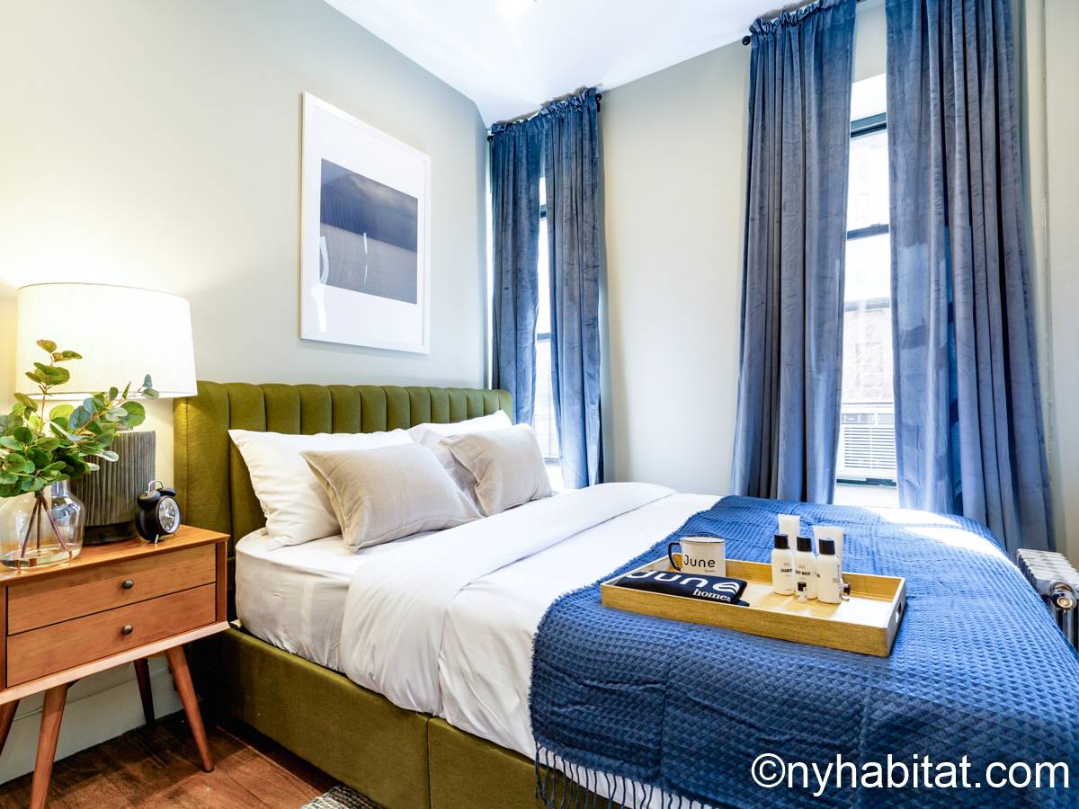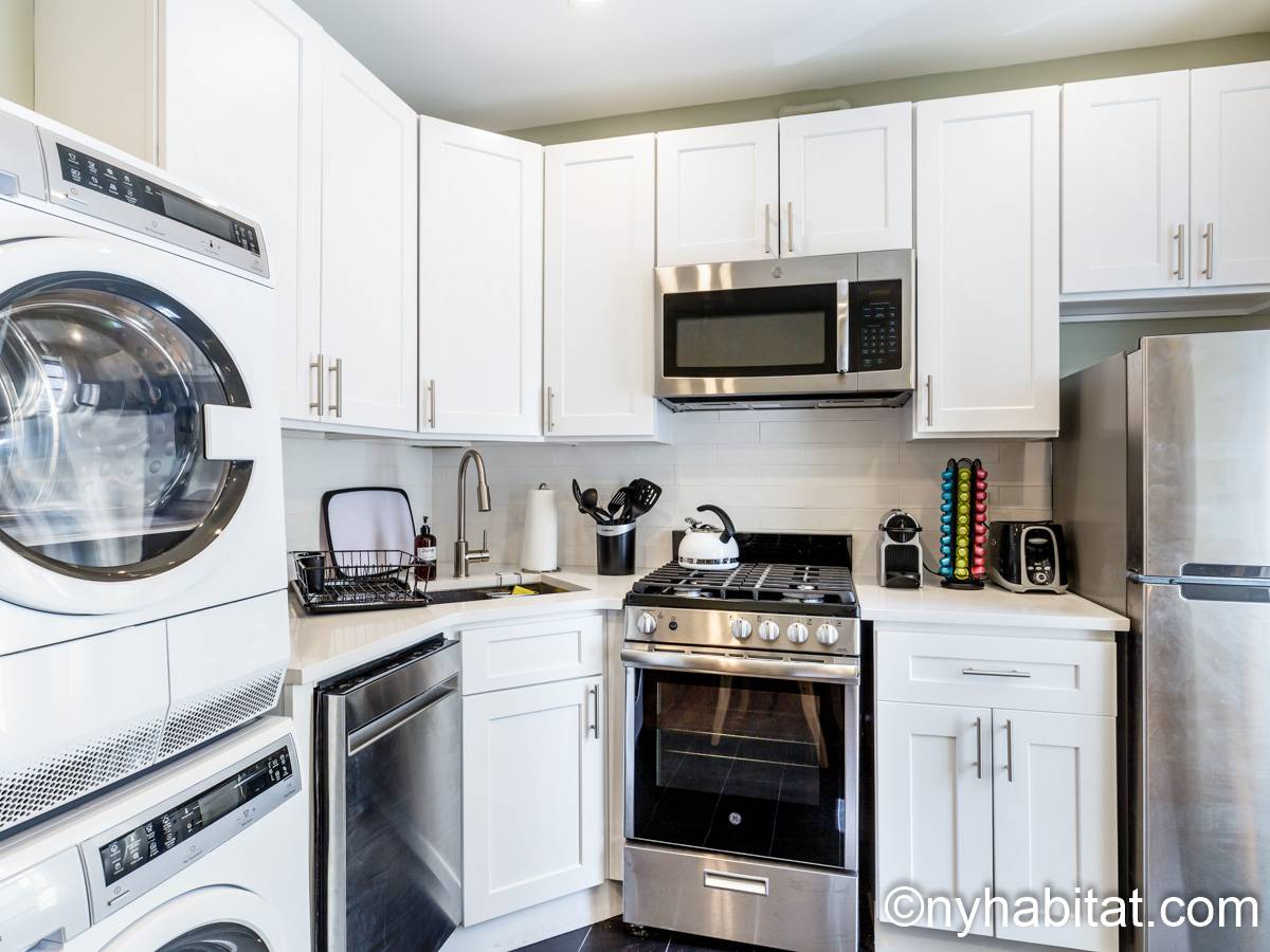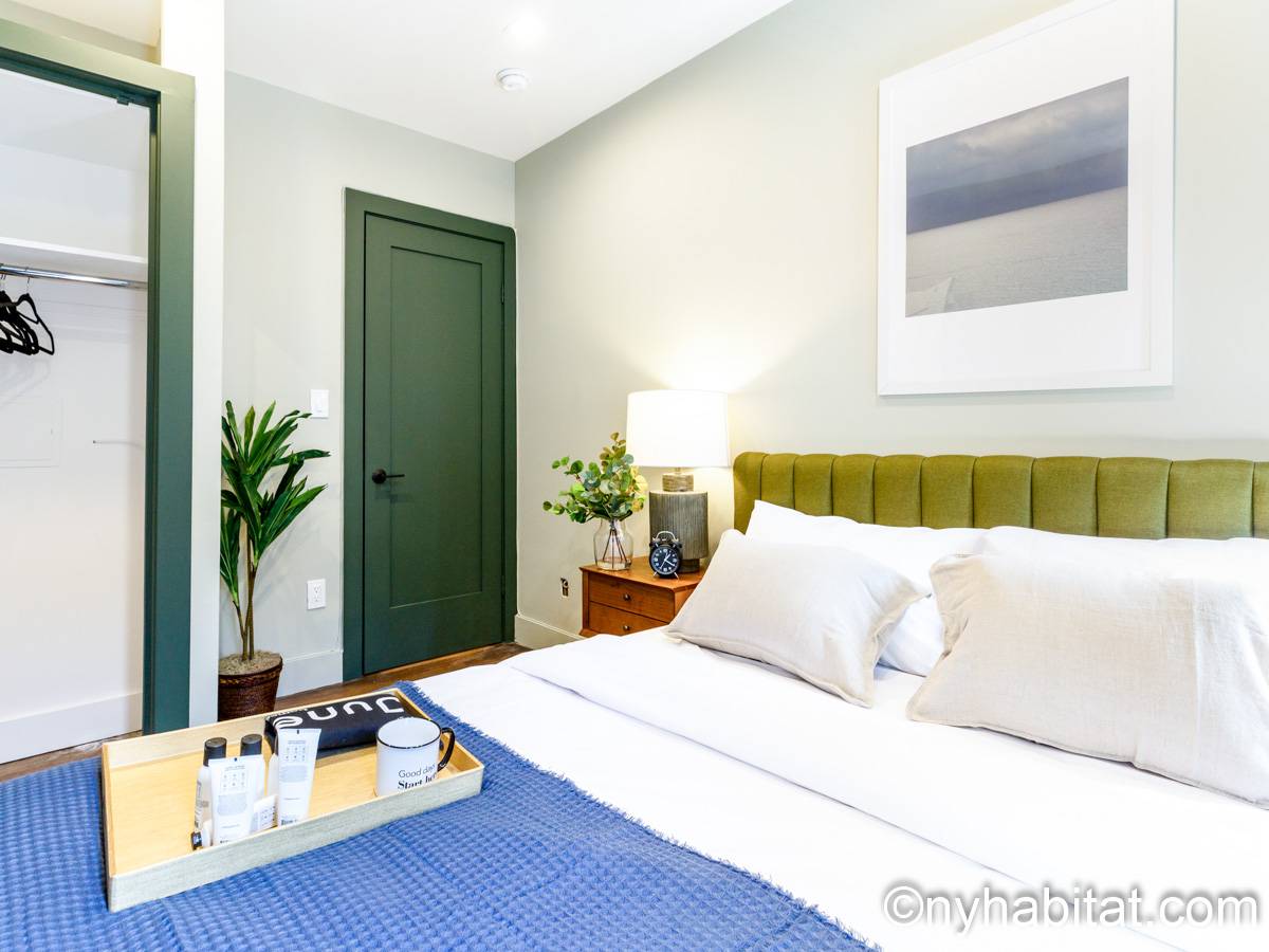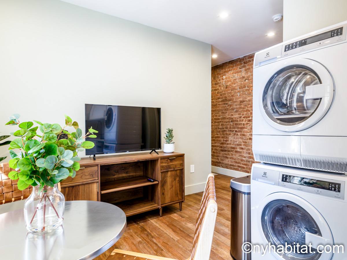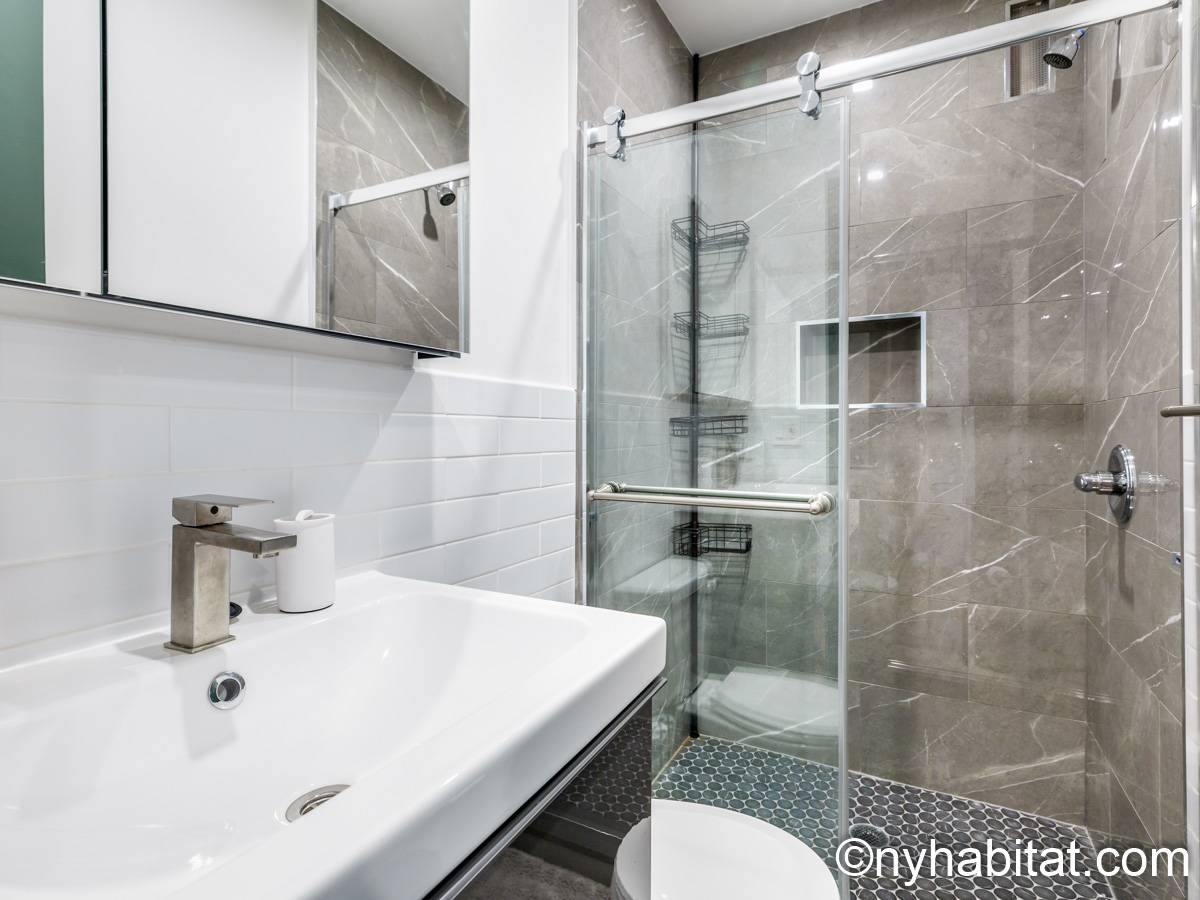 Walking into this apartment, you enter into the common room, where you have a combination of the living room and kitchen. Here you will find a dining table that easily seats three, a TV, an air conditioning unit, a refrigerator, a microwave, coffeemaker, toaster, dishwasher, and two windows that allow the flow of natural light into the space. What is unique about this apartment is that one wall in the hallway is brick, a true classic New York City rare characteristic. All three bedrooms are fully furnished and have air-conditioning. Two of the three bedrooms have a queen-size bed, exposed brick interior, and a desk. The remaining bedroom is a full-size bed. In the bathroom you have a rain overhead shower, a water closet, and a sink with cabinetry for any toiletries. This apartment is covered in hardwood floors and has a washer and dryer in unit.