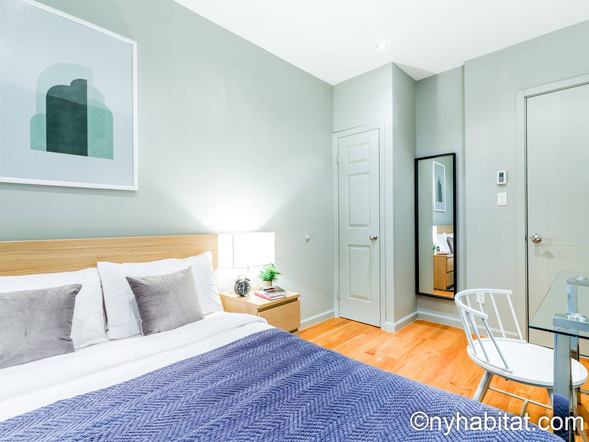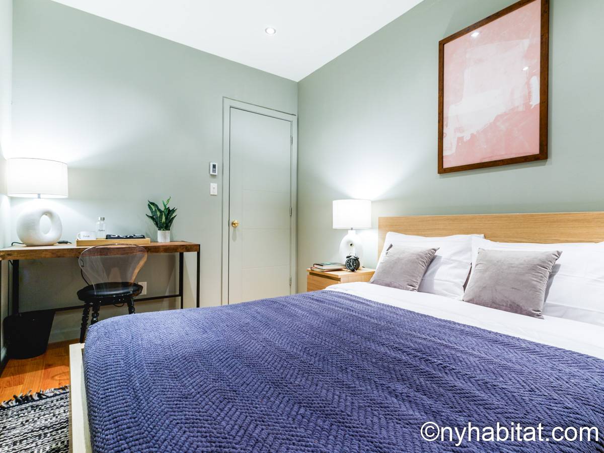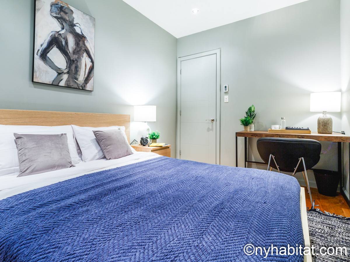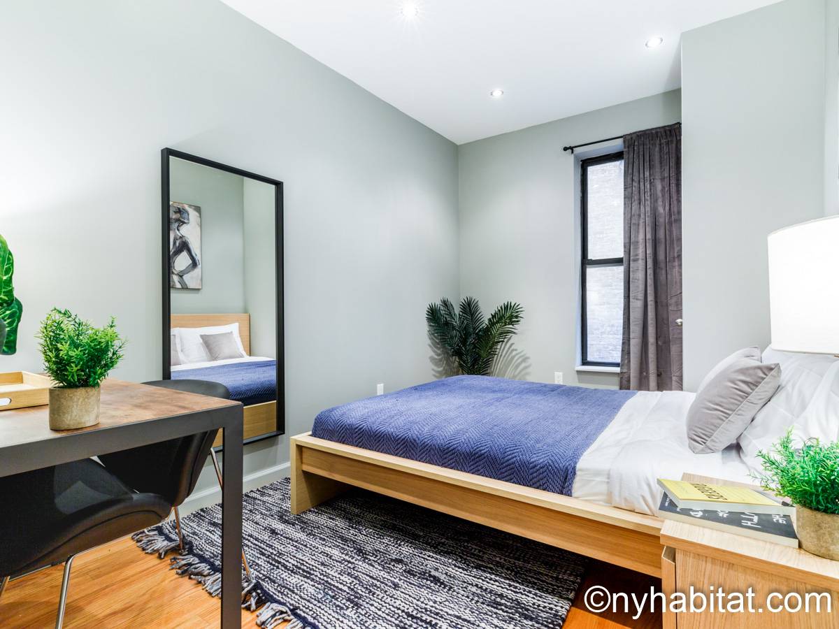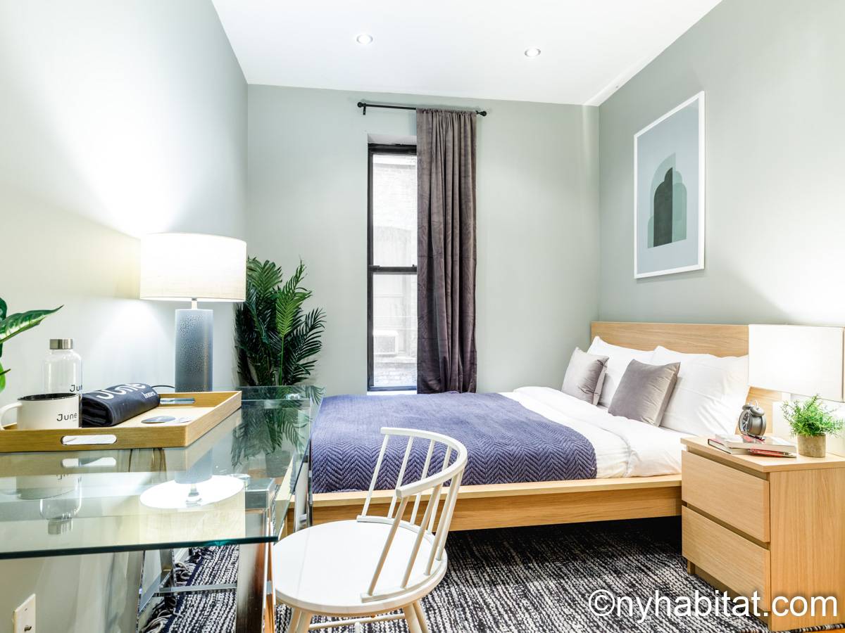 This 1090 sqft (101.2 sqm) apartment is found on the fourth floor (third floor in European) of a six story building. Walking into the apartment you are greeted with a long hallway which leads you into your open concept space of a living room and kitchen combined. In the living portion of the room, you have a sofa, two accent chairs, an A/C unit, a dining table that seats two comfortably, and a TV. In the kitchen you have a refrigerator, coffeemaker, toaster, dishwasher, and a four-burner stove with an oven. Regarding the bedrooms, you have the option to either chose from a full-size bed or queens size bed, and each bedroom comes fully furnished in a modern look with sheets, A/C unit, and window(s). All bedrooms also come with a desk for any work from home that needs to be completed as well. This apartment also comes with a washer in unit, and hardwood floors.