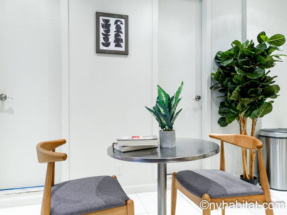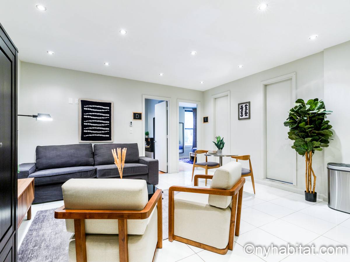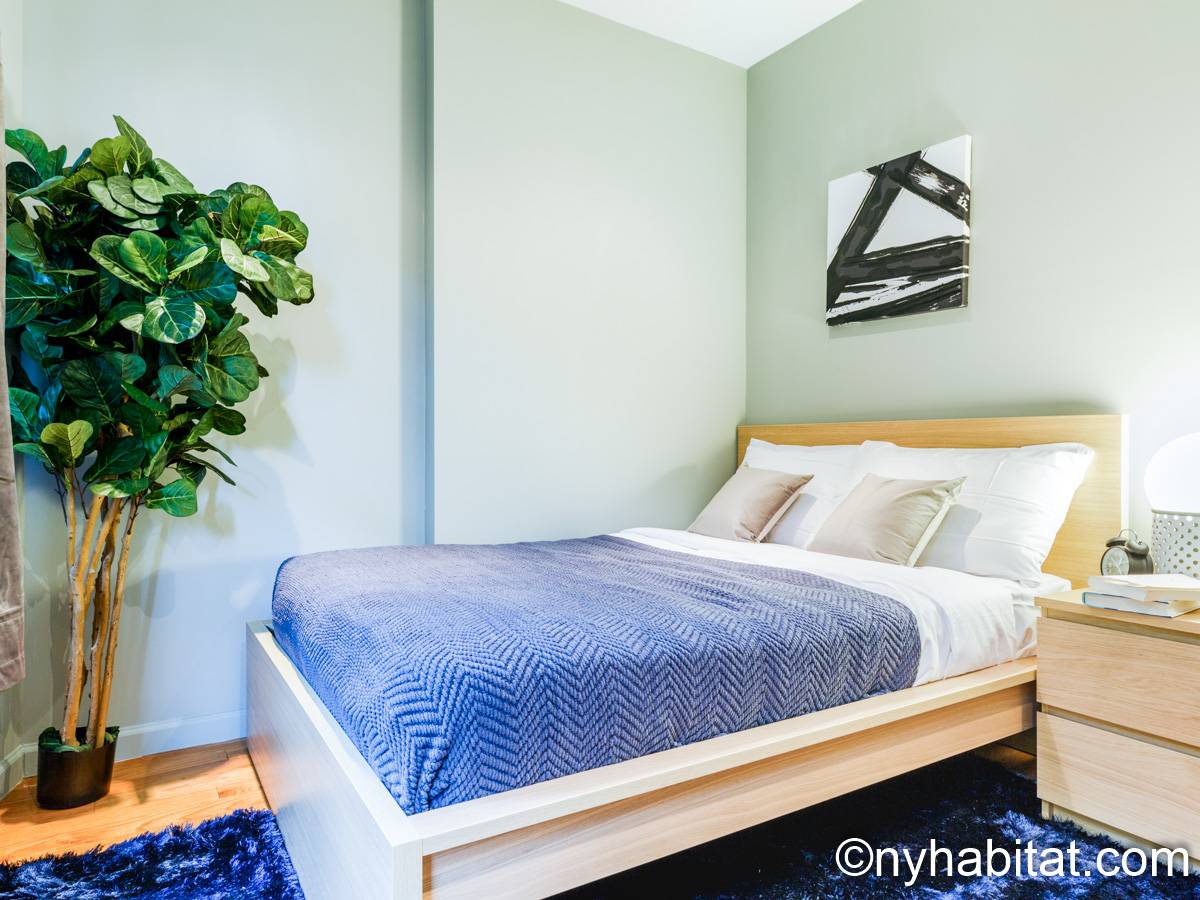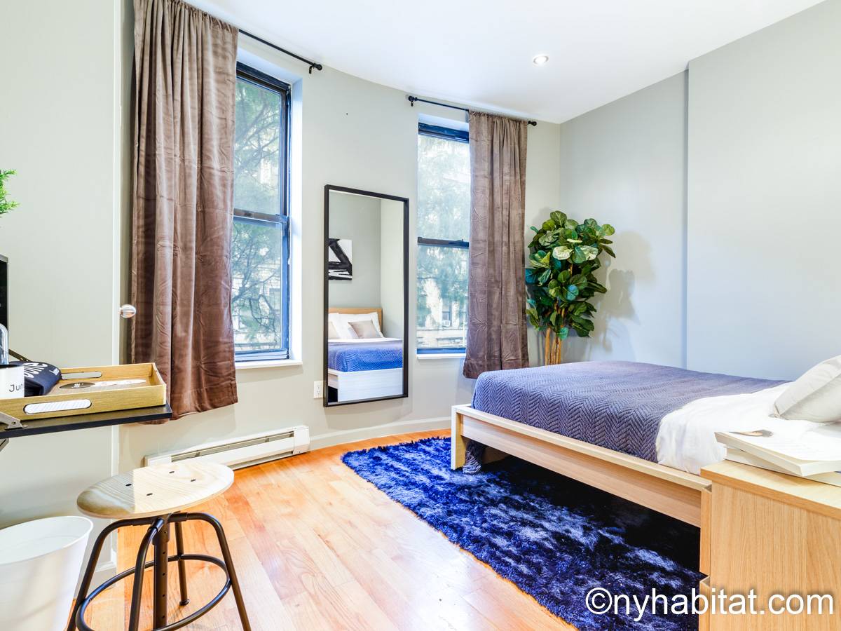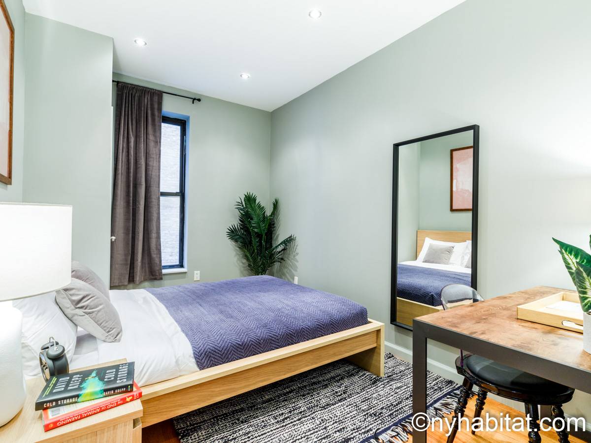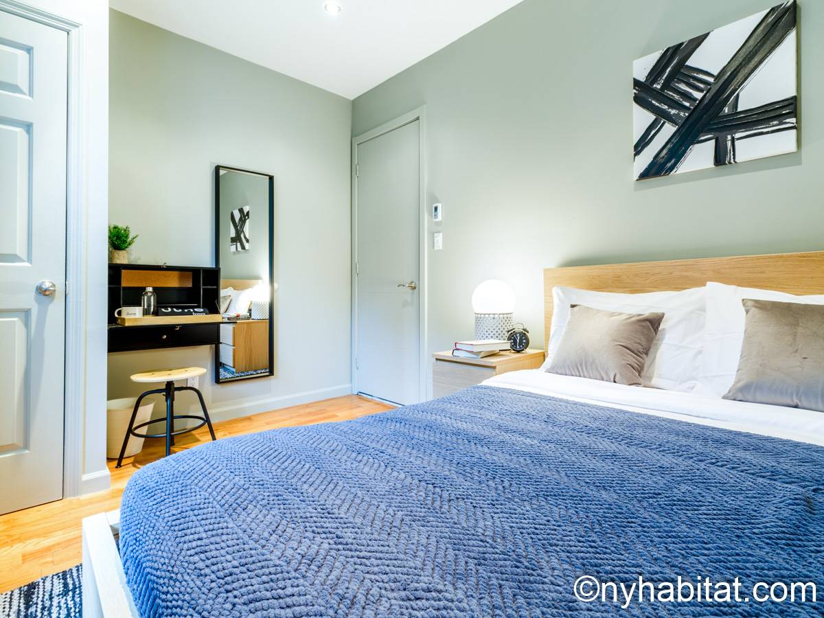 This 1090 sqft (101.2 sqm) apartment is found on the fourth floor (third floor in European) of a six story building. Walking into the apartment you are greeted with a long hallway which leads you into your open concept space of a living room and kitchen combined. In the living portion of the room, you have a sofa, two accent chairs, an A/C unit, a dining table that seats two comfortably, and a TV. In the kitchen you have a refrigerator, coffeemaker, toaster, dishwasher, and a four-burner stove with an oven. Regarding the bedrooms, you have the option to either chose from a full-size bed or queens size bed, and each bedroom comes fully furnished in a modern look with sheets, A/C unit, and window(s). All bedrooms also come with a desk for any work from home that needs to be completed as well. This apartment also comes with a washer in unit, and hardwood floors.