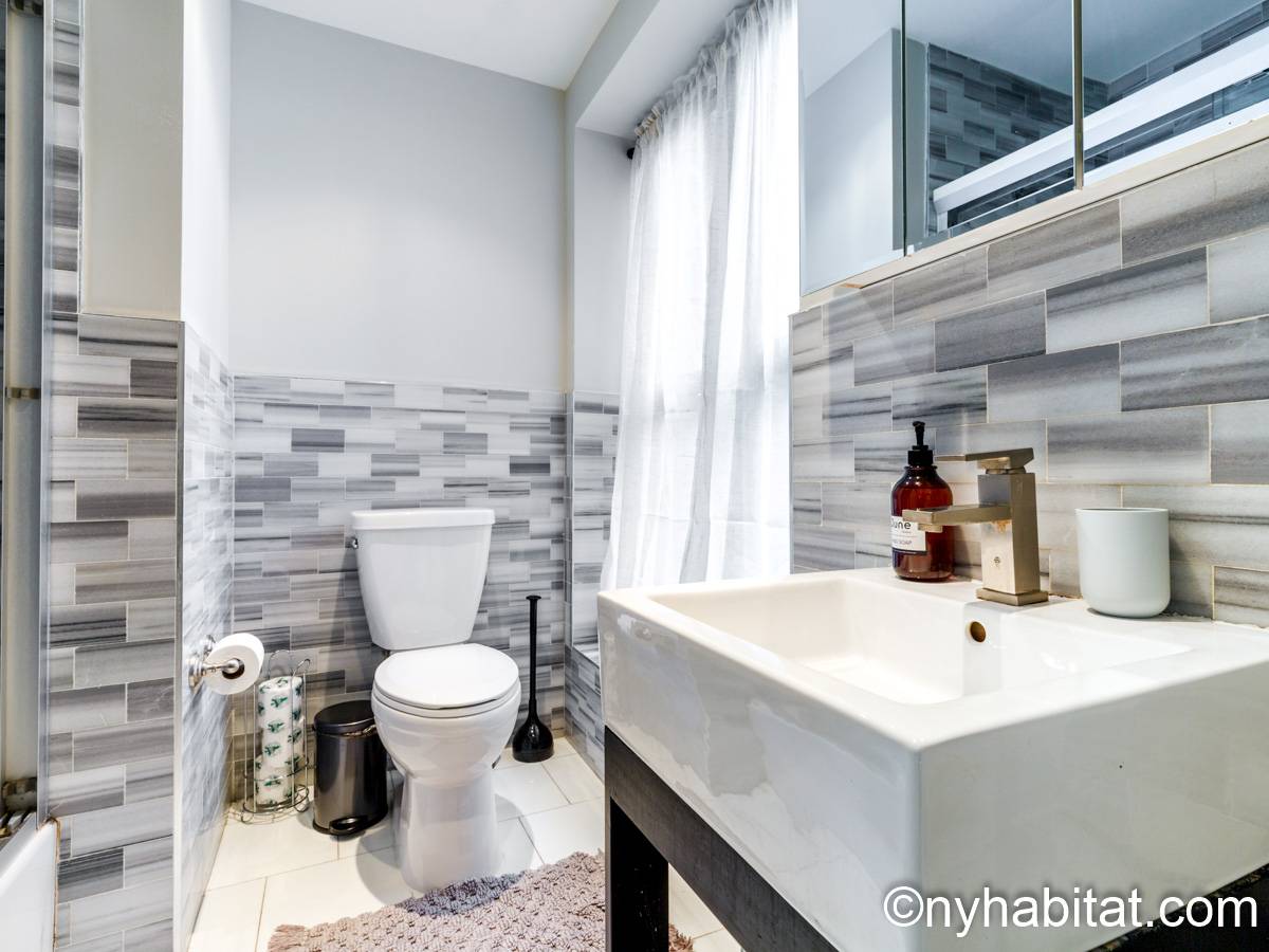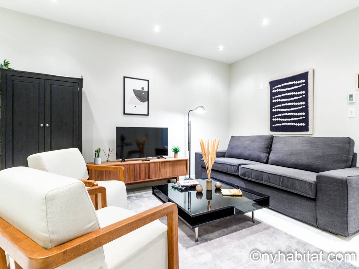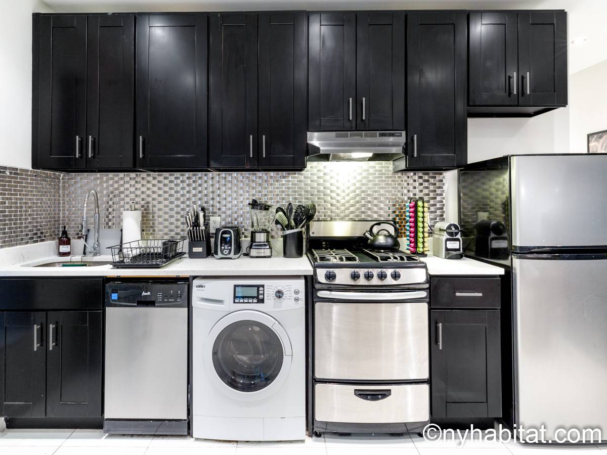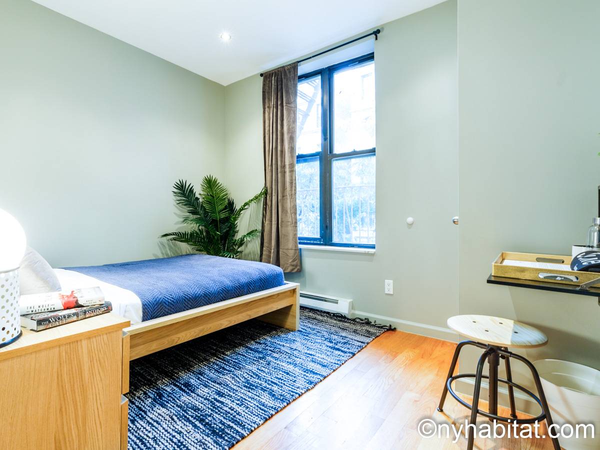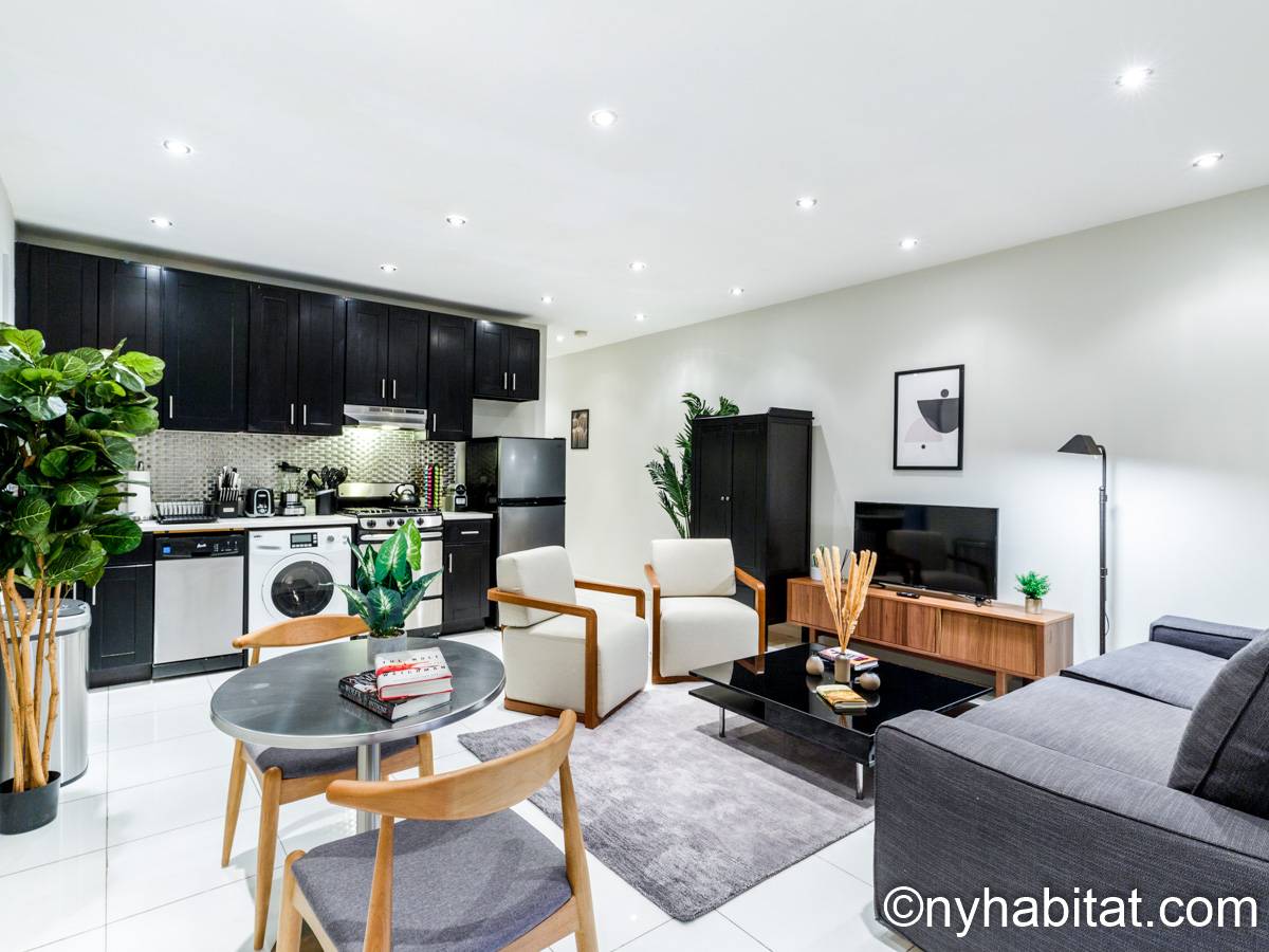 This 1090 sqft (101.2 sqm) apartment is found on the fourth floor (third floor in European) of a six story building. Walking into the apartment you are greeted with a long hallway which leads you into your open concept space of a living room and kitchen combined. In the living portion of the room, you have a sofa, two accent chairs, an A/C unit, a dining table that seats two comfortably, and a TV. In the kitchen you have a refrigerator, coffeemaker, toaster, dishwasher, and a four-burner stove with an oven. Regarding the bedrooms, you have the option to either chose from a full-size bed or queens size bed, and each bedroom comes fully furnished in a modern look with sheets, A/C unit, and window(s). All bedrooms also come with a desk for any work from home that needs to be completed as well. This apartment also comes with a washer in unit, and hardwood floors.