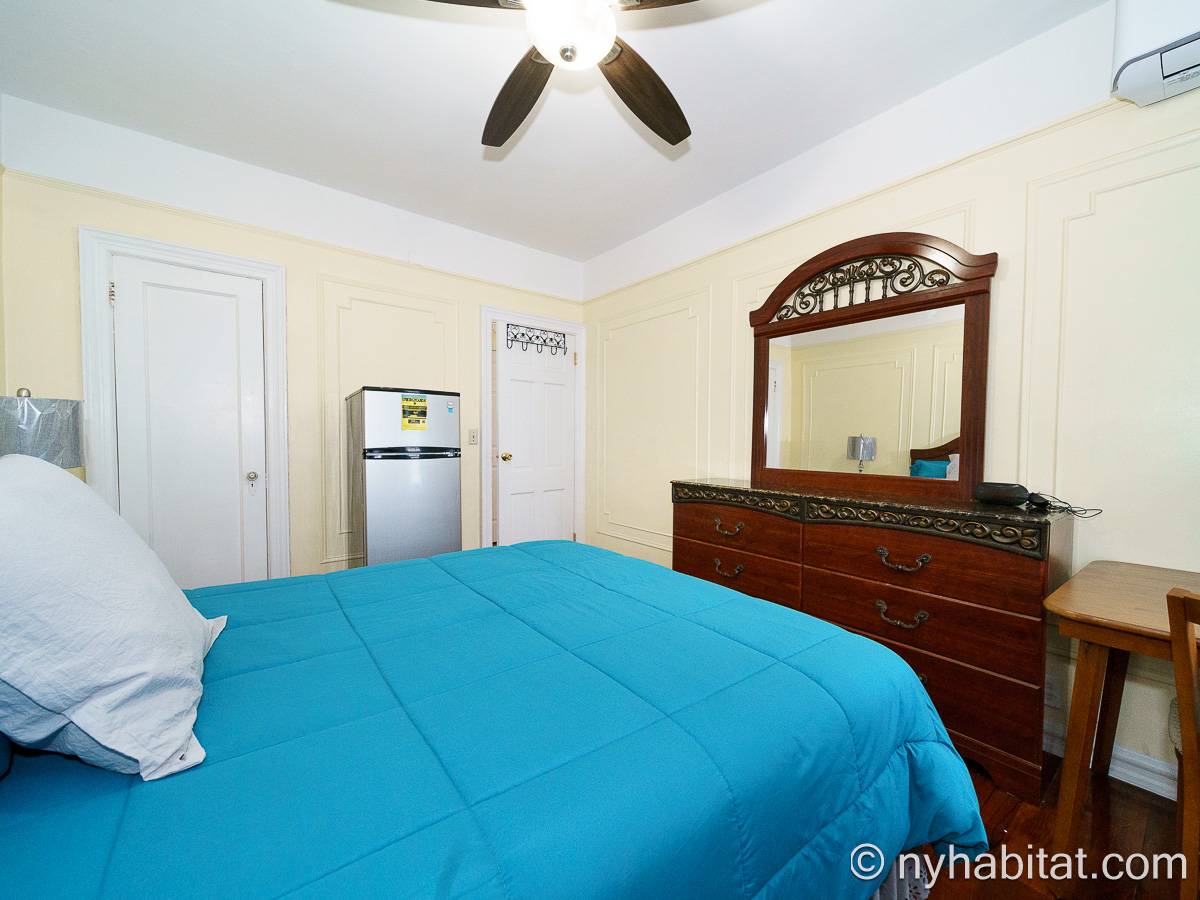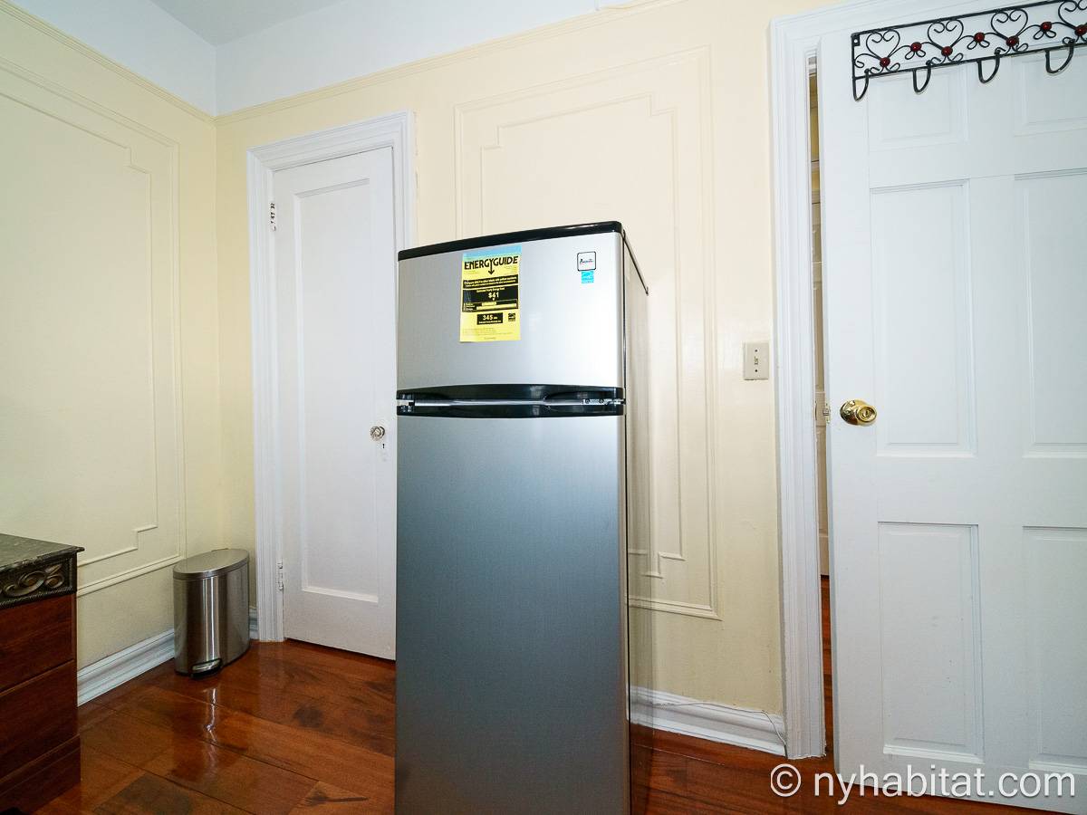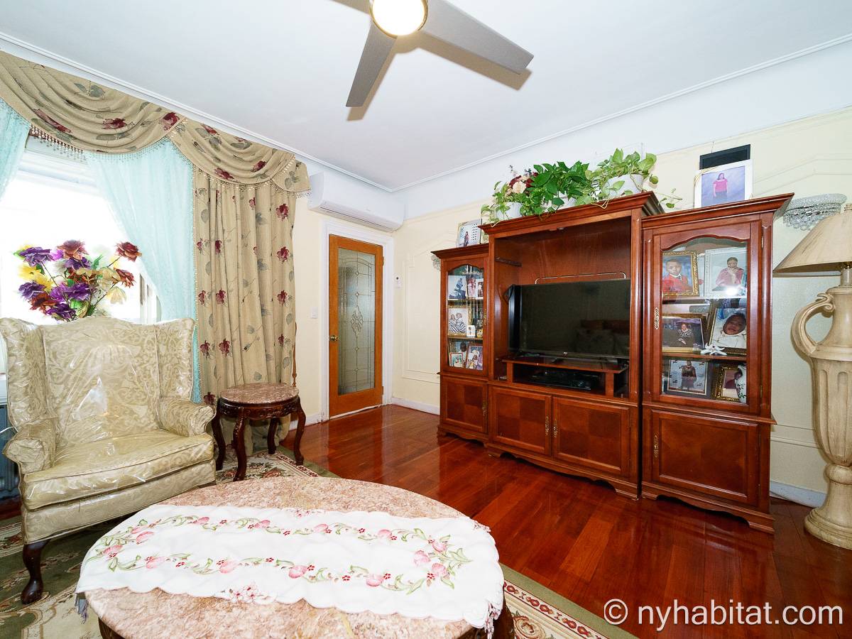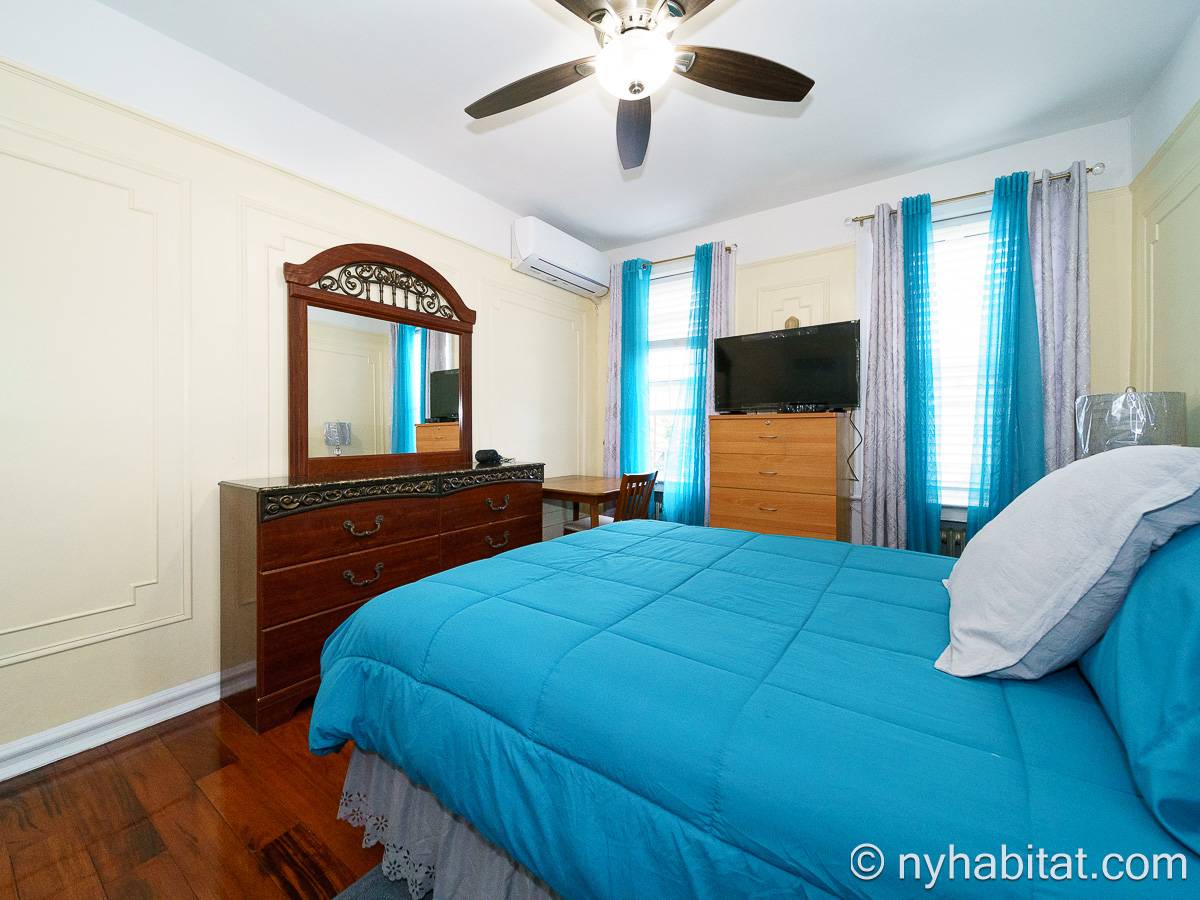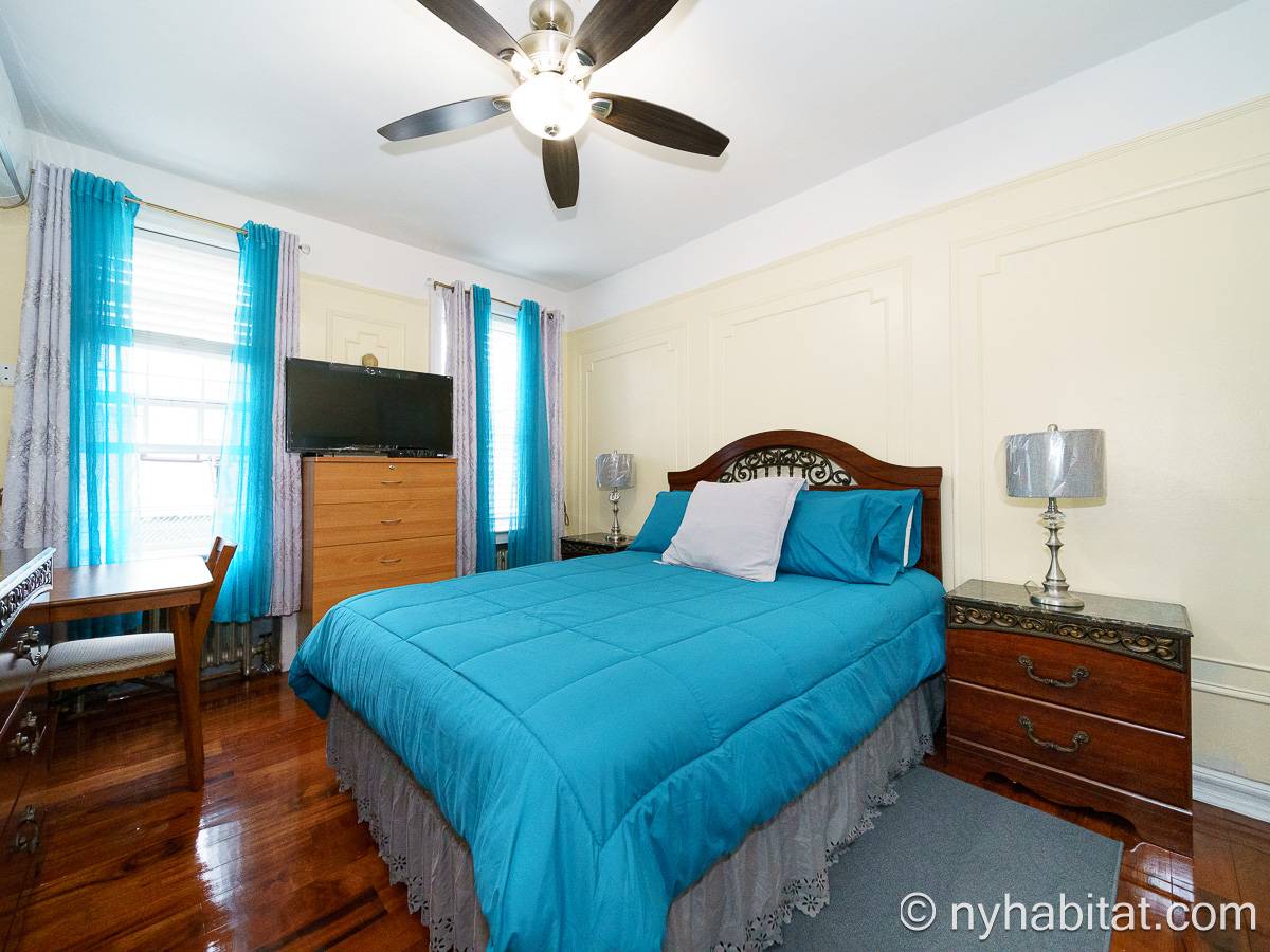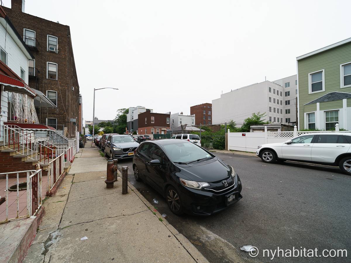 This 1,200-square-foot (around 111 m2) roommate share is located near the corner of Lloyd Street and Church Avenue, and sits on the first floor (equivalent to the ground floor in Europe). The shared living room and adjacent dining room together include three medium-size windows with street and alley exposure. There is a sofa and a TV. The separate kitchen comes with a stainless-steel refrigerator, microwave, oven, freezer, dishwasher, and toaster. The bedroom for rent comes with a queen-size bed, as well as a refrigerator, air-conditioning, and a window to the backyard. The shared bathroom provides a shower and shelving.