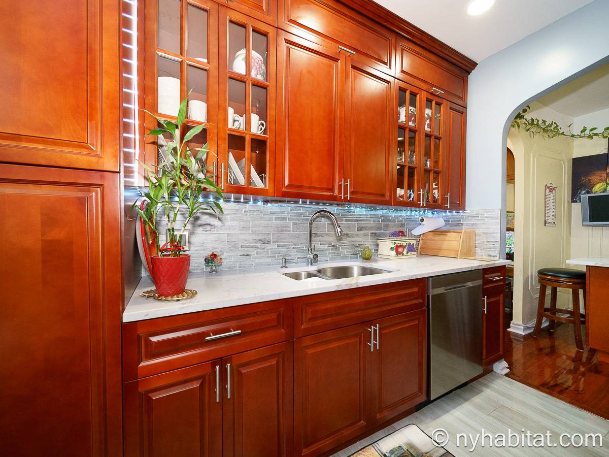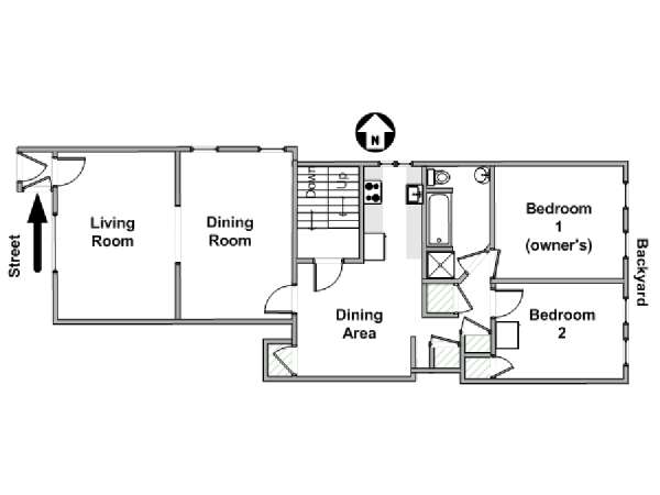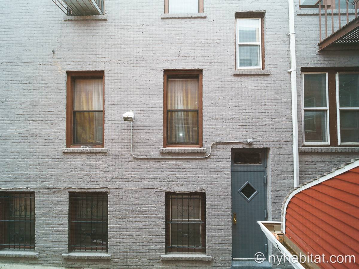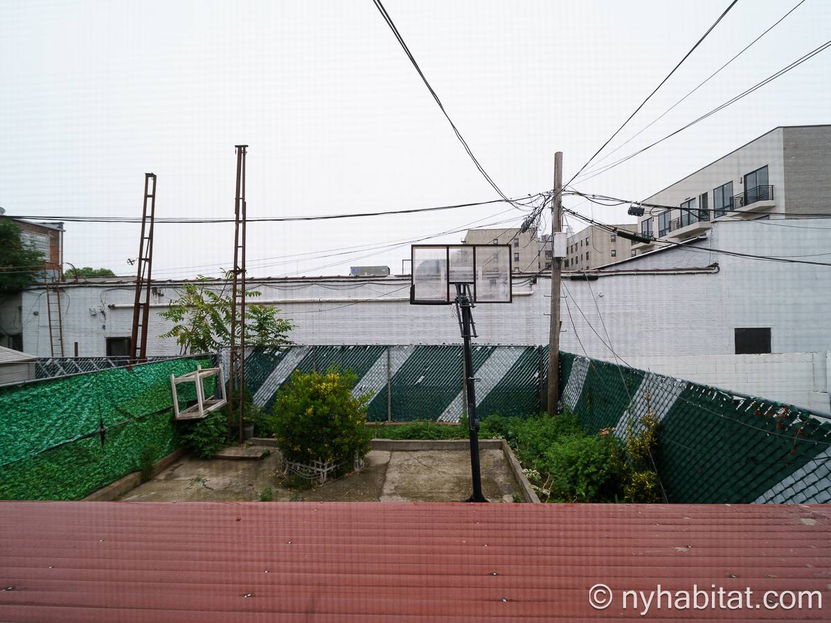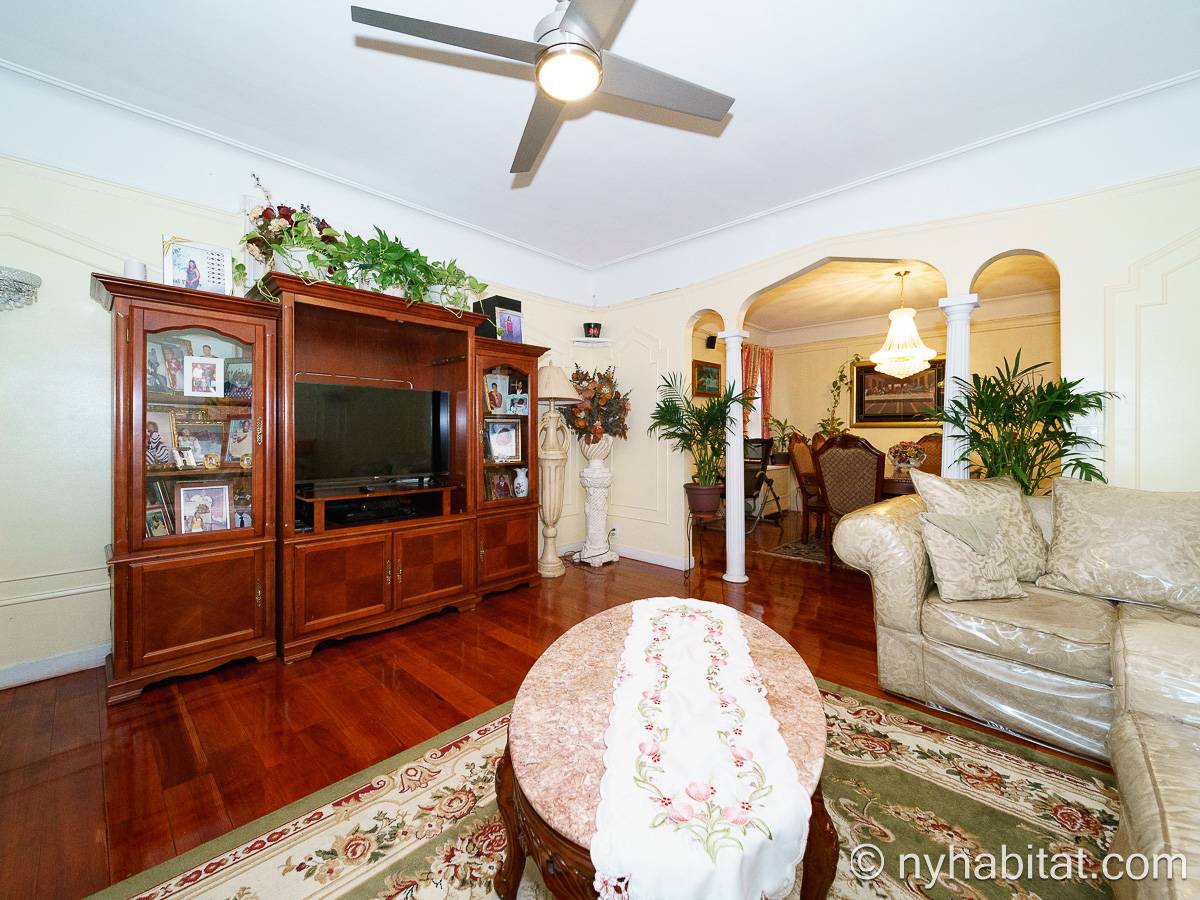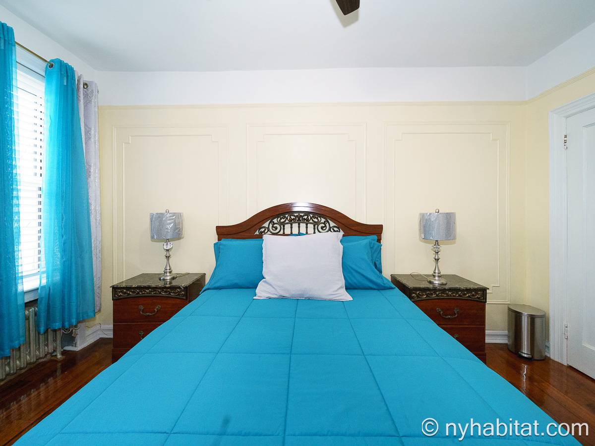 This 1,200-square-foot (around 111 m2) roommate share is located near the corner of Lloyd Street and Church Avenue, and sits on the first floor (equivalent to the ground floor in Europe). The shared living room and adjacent dining room together include three medium-size windows with street and alley exposure. There is a sofa and a TV. The separate kitchen comes with a stainless-steel refrigerator, microwave, oven, freezer, dishwasher, and toaster. The bedroom for rent comes with a queen-size bed, as well as a refrigerator, air-conditioning, and a window to the backyard. The shared bathroom provides a shower and shelving.