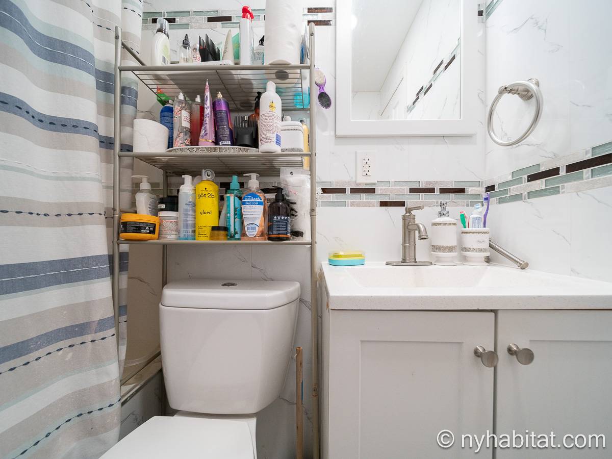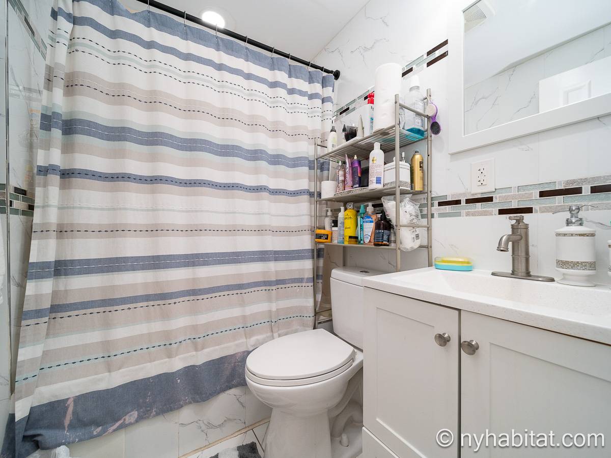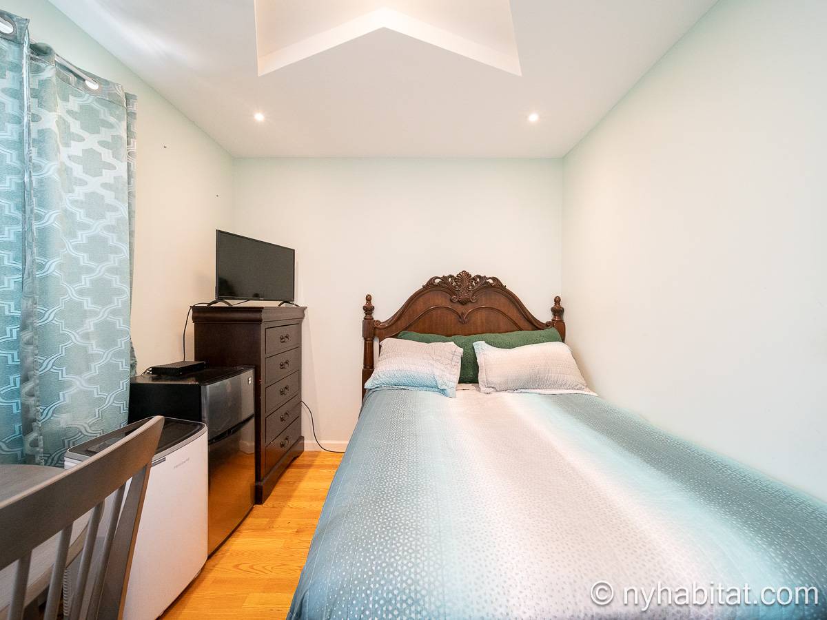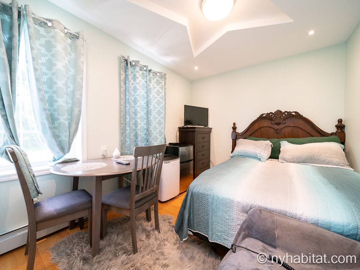 In this shared apartment, you will find a kitchen that includes a fridge, freezer, microwave, dishwasher, and oven. The bedroom for rent measures 125 square-feet (around 11 m2) and comes furnished with a queen-size bed, television, dining table, and air conditioning. With east-facing exposure that overlooks the backyard, this room enjoys natural light. The shared bathroom features a shower/tub with marble-patterned walls.