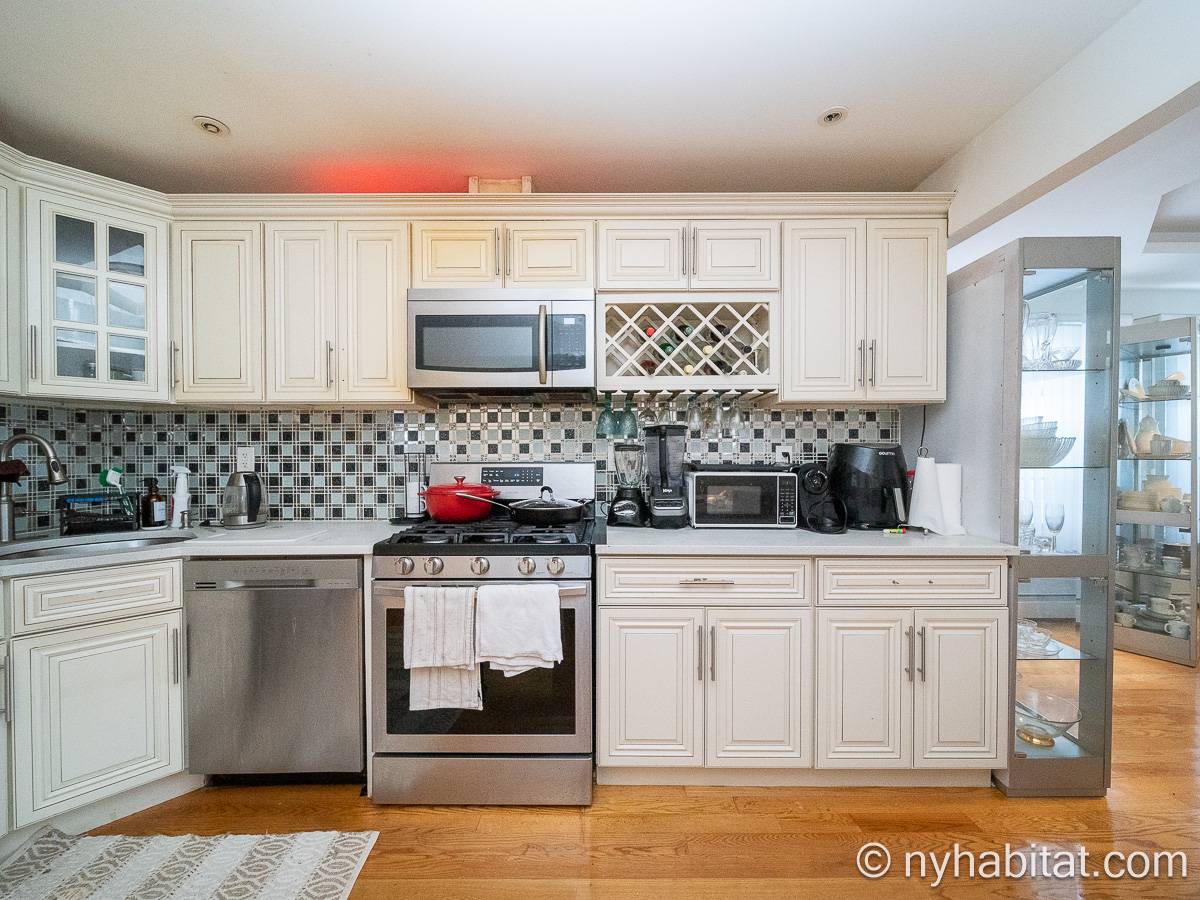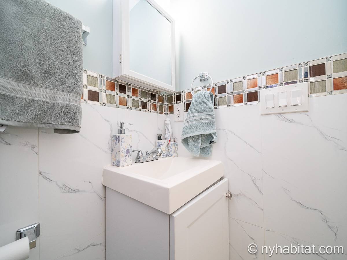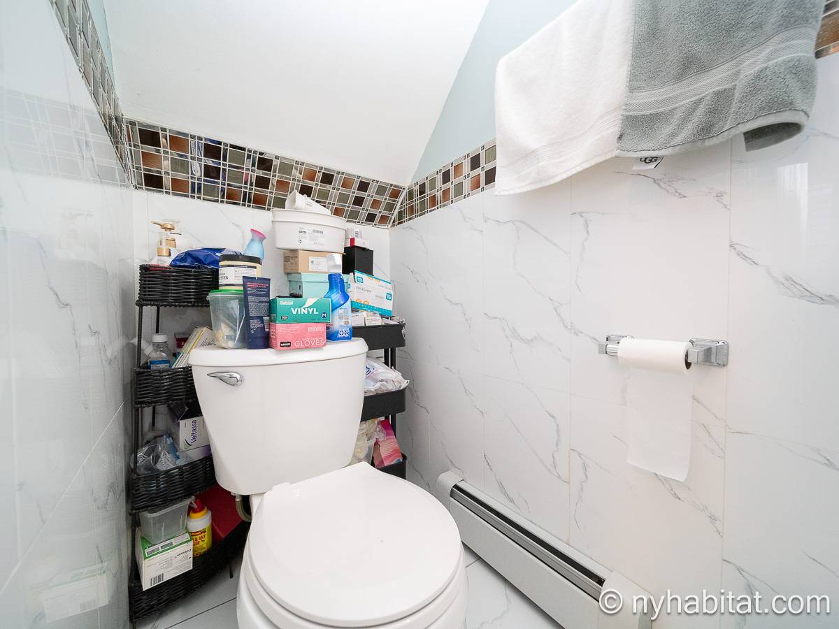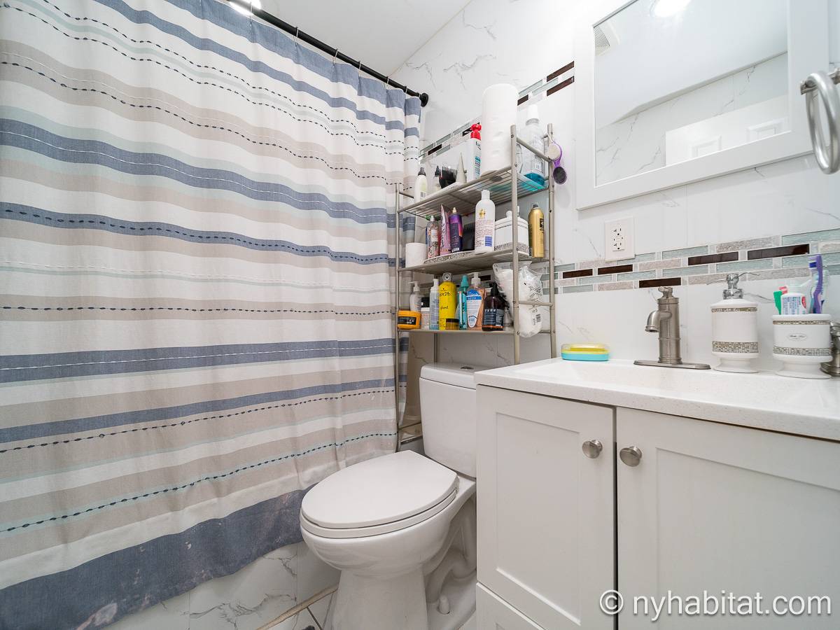 In this shared apartment, you will find a kitchen that includes a fridge, freezer, microwave, dishwasher, and oven. The bedroom for rent measures 125 square-feet (around 11 m2) and comes furnished with a queen-size bed, television, dining table, and air conditioning. With east-facing exposure that overlooks the backyard, this room enjoys natural light. The shared bathroom features a shower/tub with marble-patterned walls.