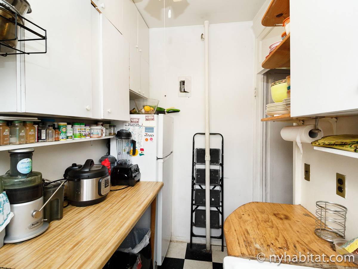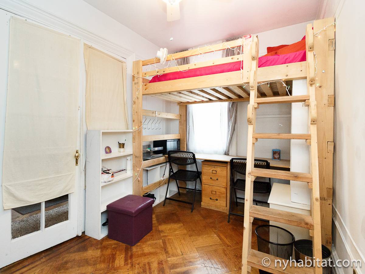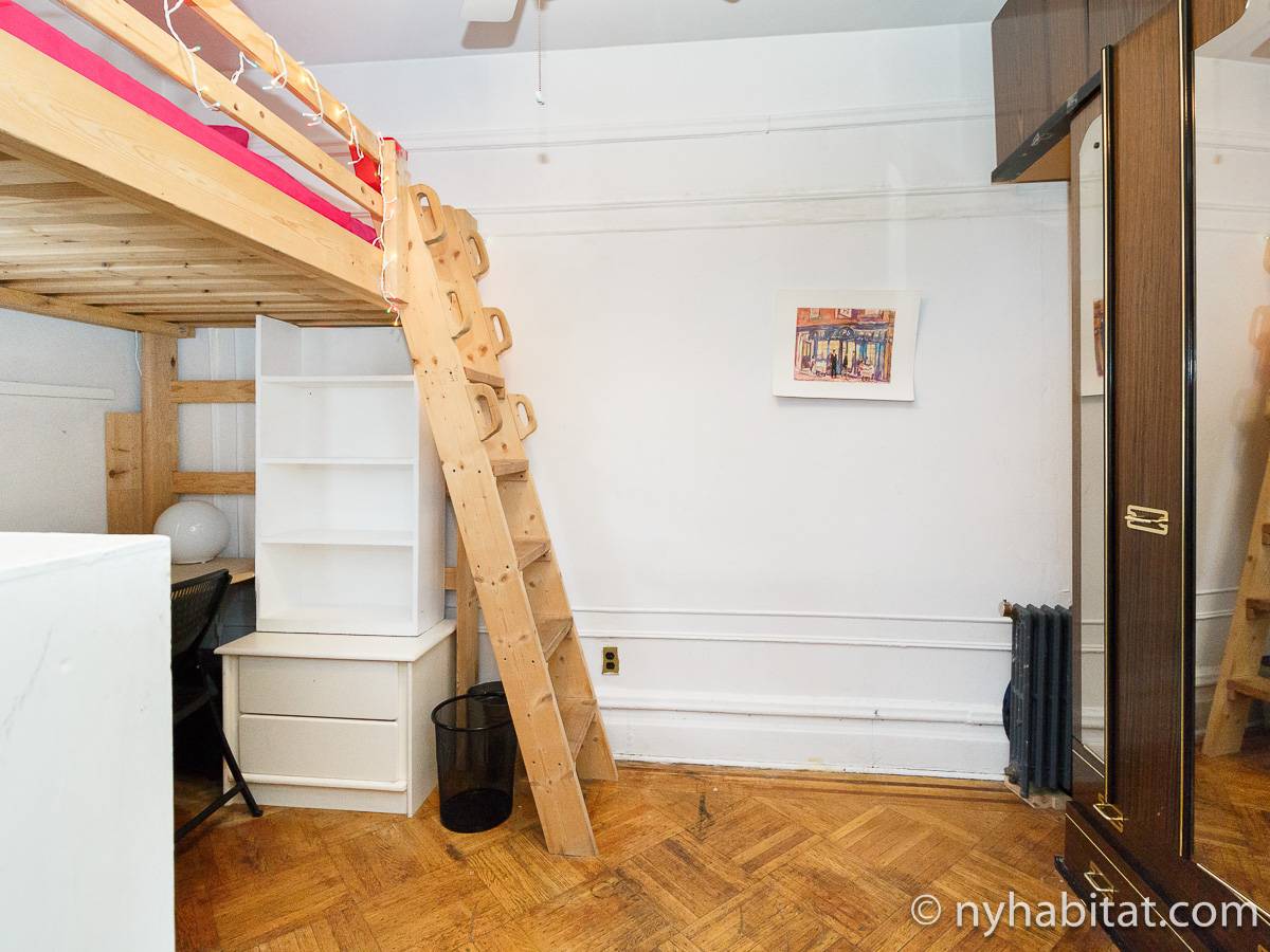 In this room for rent, the single loft bed opens up floor space, and a desk with chair has been installed underneath, making this room a great option for those who need a dedicated place to study or work . This room is also furnished with a shelving unit as well as a wardrobe for storage and has a northern exposed window overlooking the street. The living room, kitchen and bathroom are shared with your roommate. The two windows in the living room let in plenty of natural light. Here you'll find a sofa and a TV with cable. The tiled kitchen is equipped with an oven and four burners to cook your meals at home, and the bathroom has a bathtub/shower. One of the great perks of this apartment is its windows in every room, including the kitchen and bathroom, for air circulation.