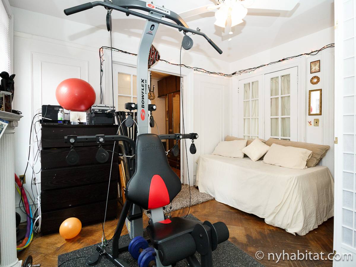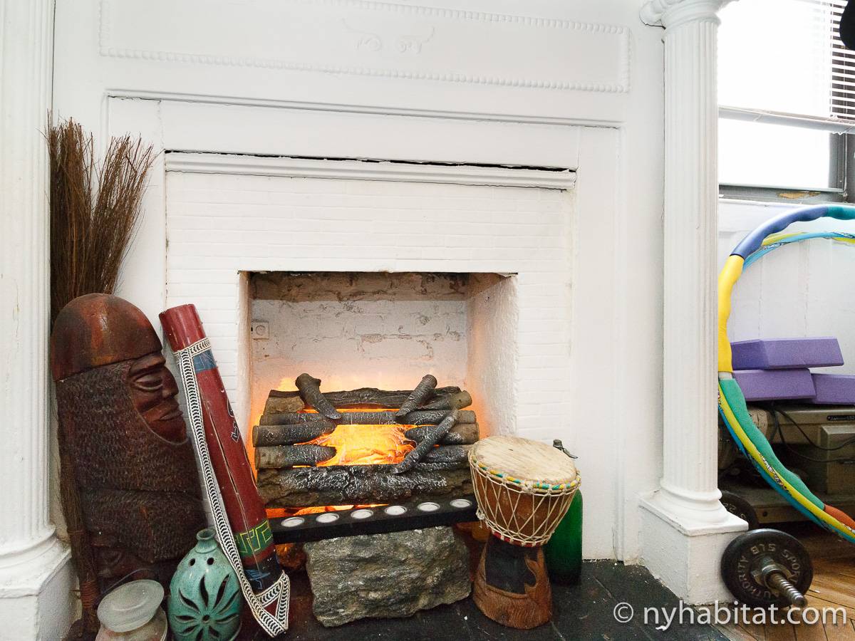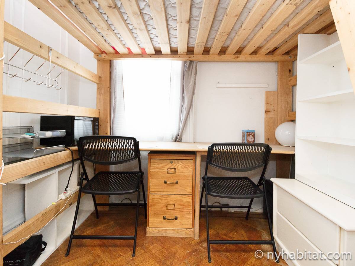 In this room for rent, the single loft bed opens up floor space, and a desk with chair has been installed underneath, making this room a great option for those who need a dedicated place to study or work . This room is also furnished with a shelving unit as well as a wardrobe for storage and has a northern exposed window overlooking the street. The living room, kitchen and bathroom are shared with your roommate. The two windows in the living room let in plenty of natural light. Here you'll find a sofa and a TV with cable. The tiled kitchen is equipped with an oven and four burners to cook your meals at home, and the bathroom has a bathtub/shower. One of the great perks of this apartment is its windows in every room, including the kitchen and bathroom, for air circulation.