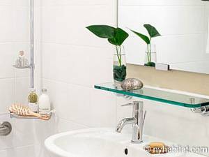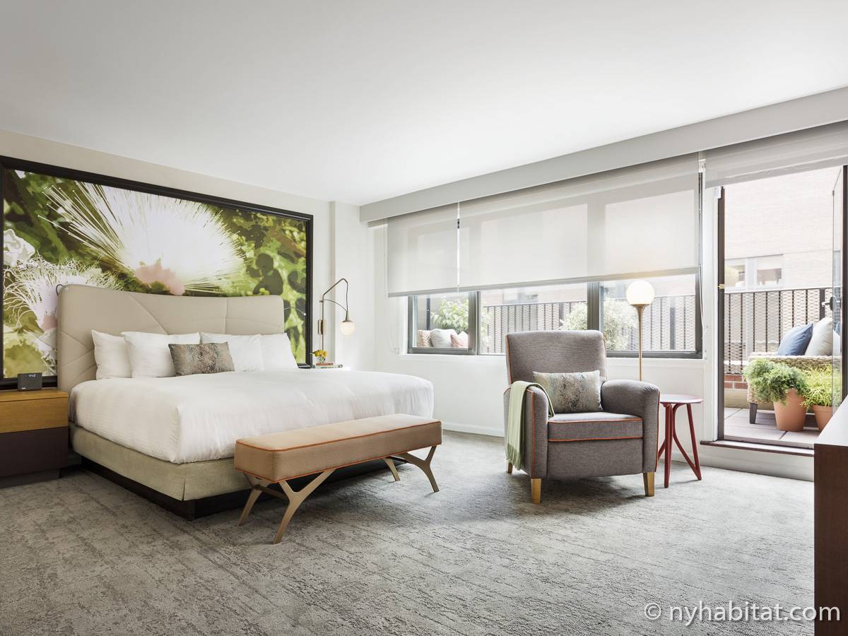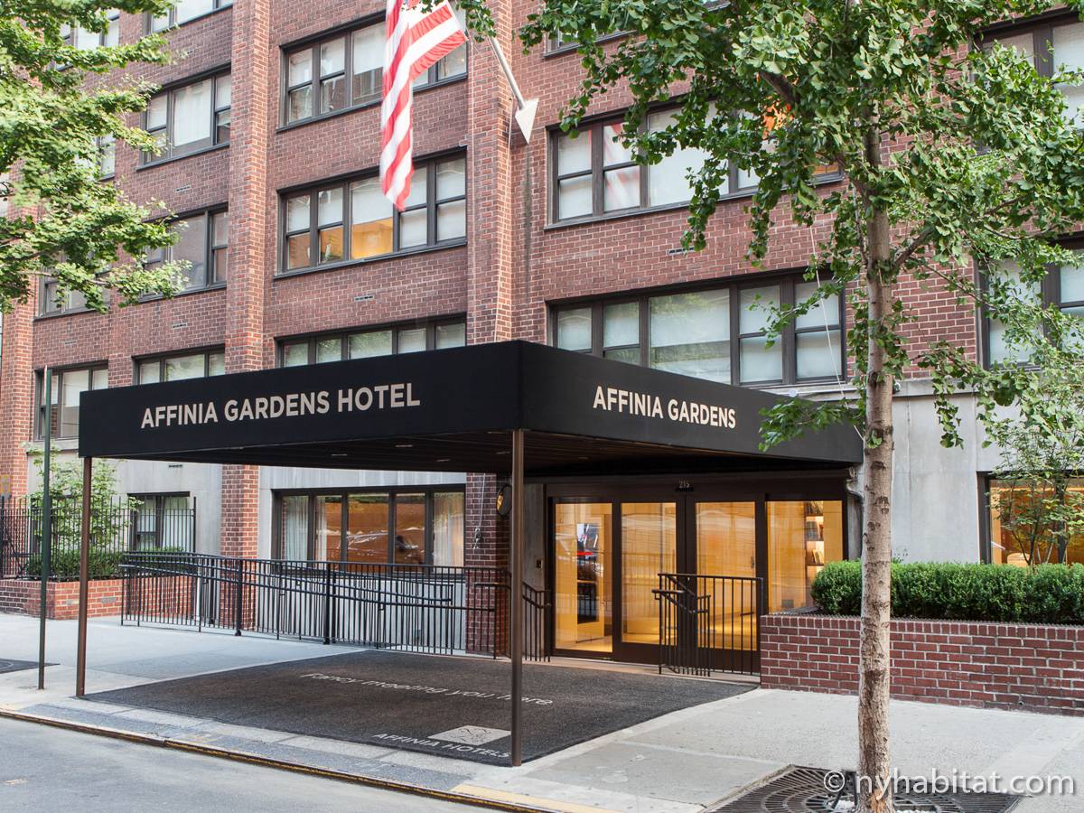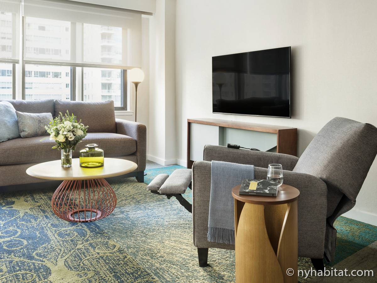 This fully furnished one-bedroom suite is located in a mid-rise, elevator building on the Upper East Side of Manhattan in New York. These accommodations are located in a building with hotel-like amenities which combine the advantages of a private apartment and the advantages of a hotel with additional features such as a 24-hour staffed front desk, on-site laundry facilities, pet walking and daily housekeeping. Extra items such as dishes, cutlery and chairs can be made easily available 24 hours a day by calling guest services and making a request.