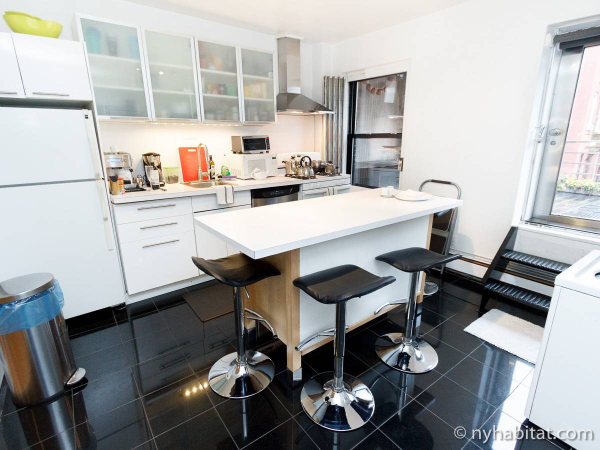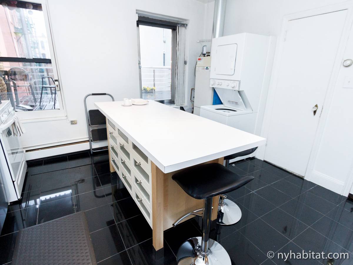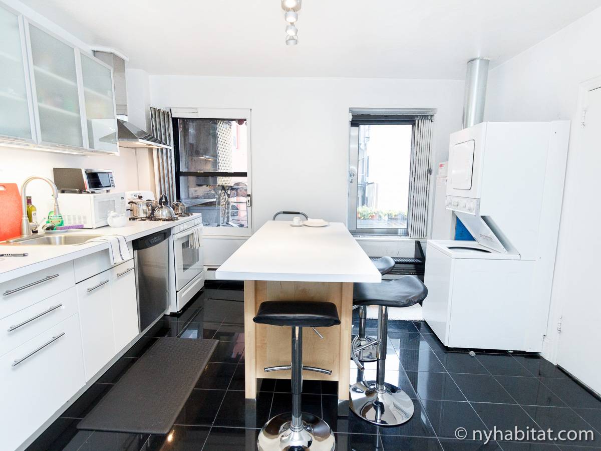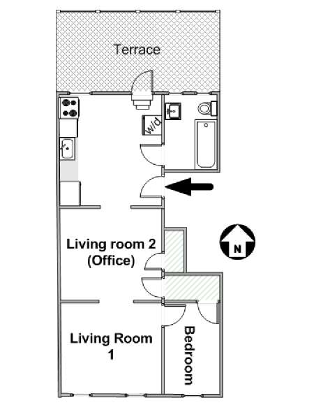This apartment provides hard wooden floors throughout, including an office area. The living room is furnished with a sofa, allowing you to sit back and relax, as you watch the flat screen TV (cable channels available and DVD player) during your stay. It also includes the comfort of an available closet space, and a large kitchen, which is fully equipped with all the necessary utensils for you to prepare your own home-cooked meals, and avoid the hassle of ordering food and eating out in the city; a dining table in the kitchen is offered, as well as the amenity of a washer/dryer unit. Lastly, in the kitchen there is also a sliding door, which leads you out to the 300 square foot (78 sqm) private terrace, where you can sit and enjoy the views of this extravagant city, as you sit along and enjoy the treat of the table and chairs included out in the terrace.