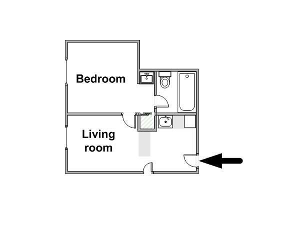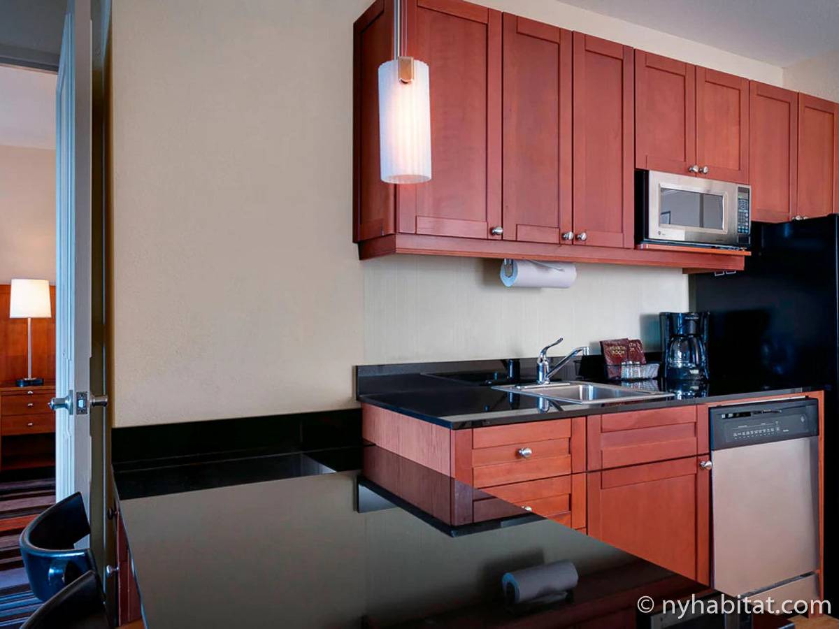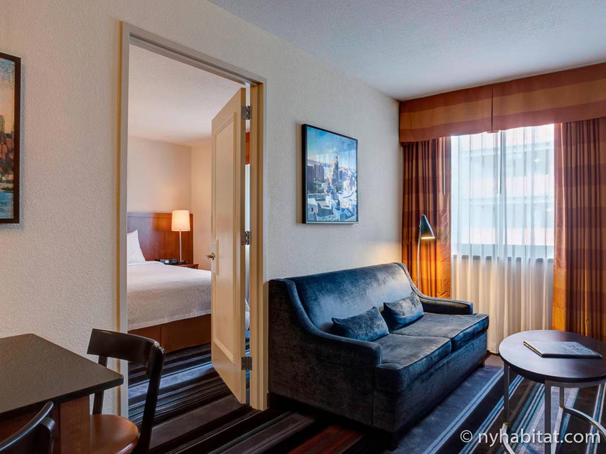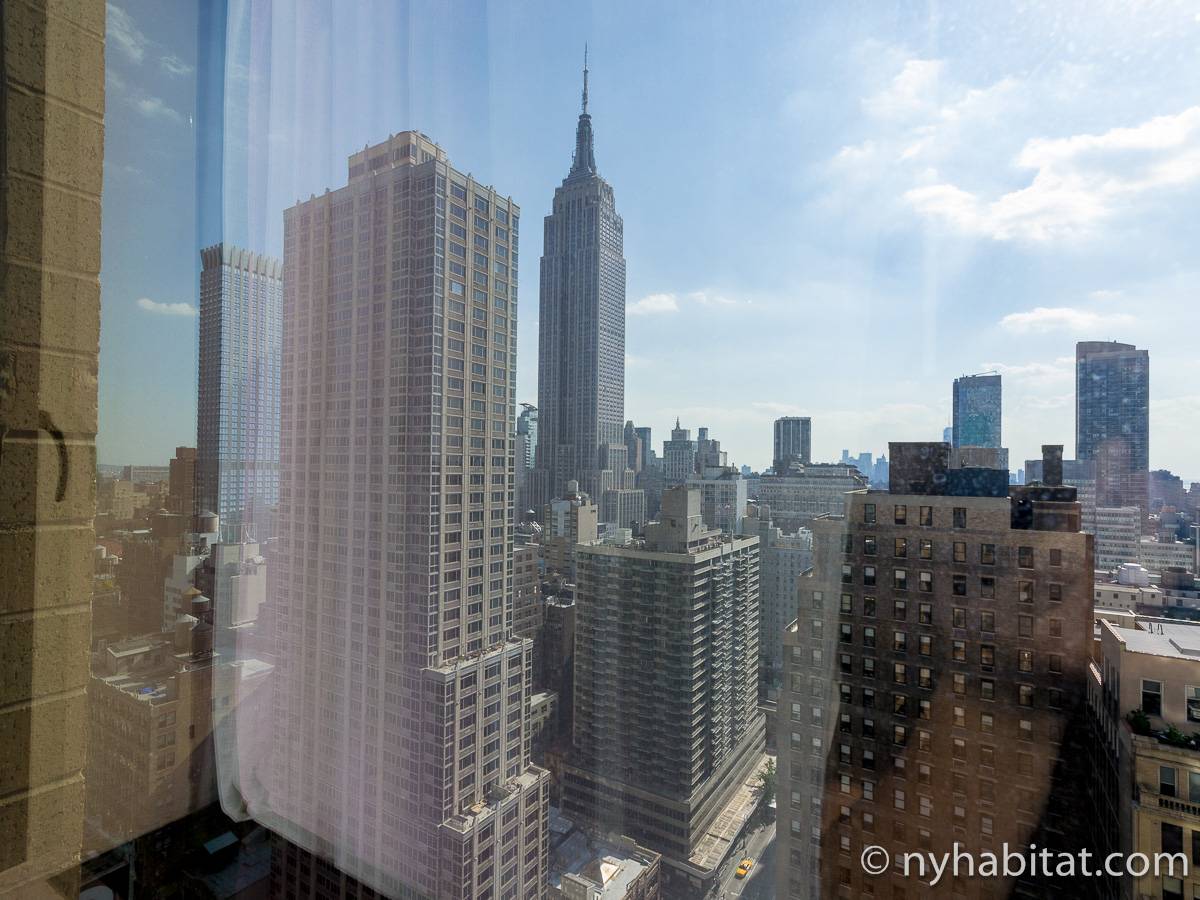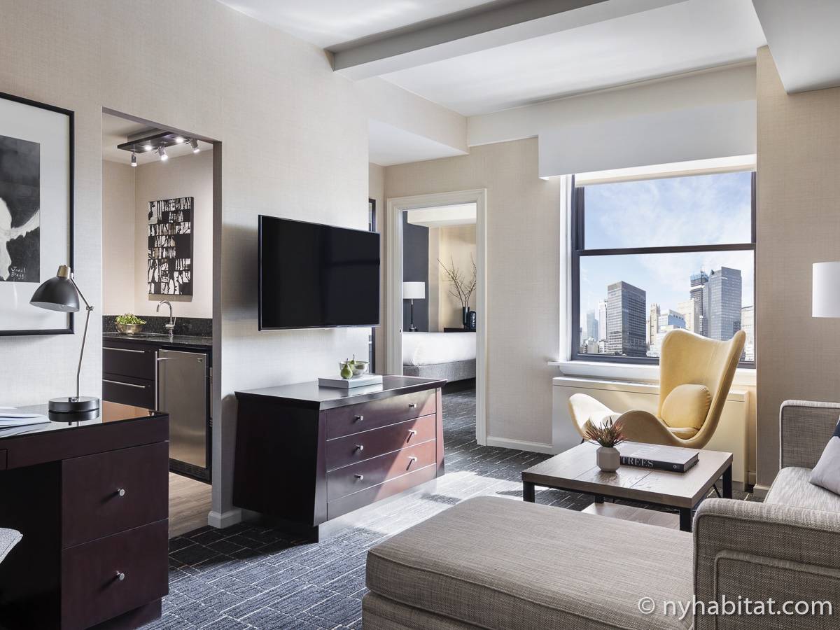 Just down the street from Bryant Park (308ft/98m), the one bedroom apartment is located on Sixth Avenue and West 39th Street. It is part of a 34-story (considered 33-story in Europe) high-rise elevator building with a 24-hour doorman. A luxury accommodation, the building offers a shared fitness facility and a private garage for travelers with vehicles.