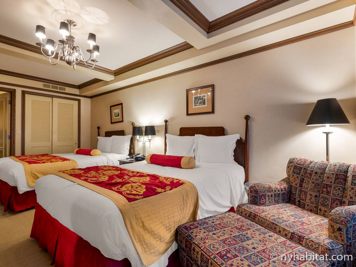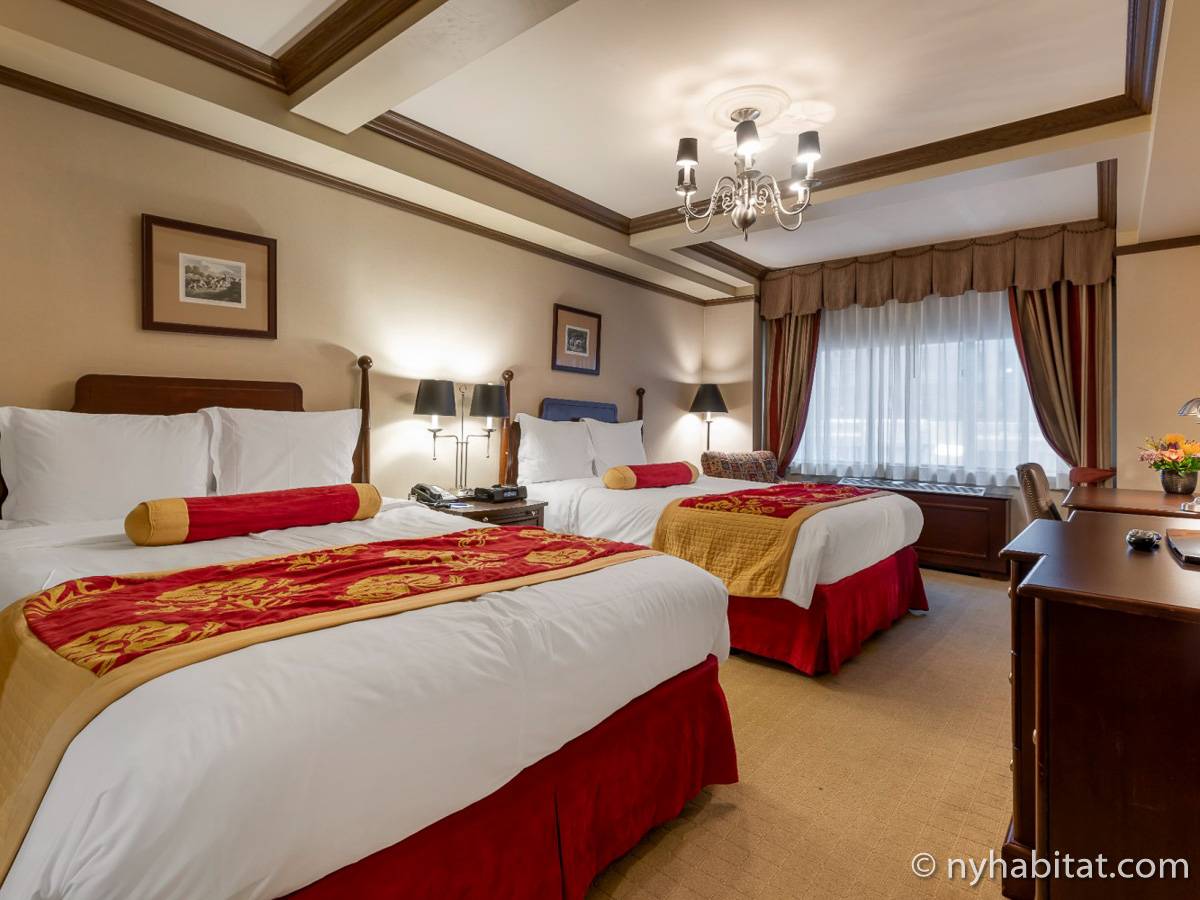 This accommodation offers a well-equipped living space. The living area includes a sofa, air conditioning, and a TV for your entertainment. The sofa can be converted into a double-size sofa bed for flexibility. The kitchen is equipped with a freezer, microwave, coffeemaker, and fridge, allowing you to prepare meals during your stay. The bathroom features a shower behind a glass door and a marble finish. The bedroom includes two queen-sized beds, a desk, air conditioning, and a TV for relaxation.