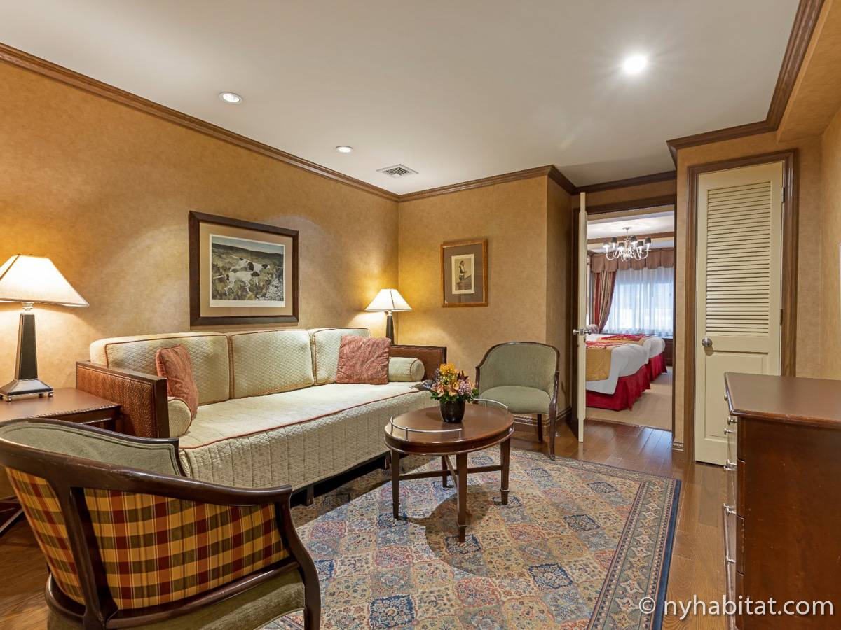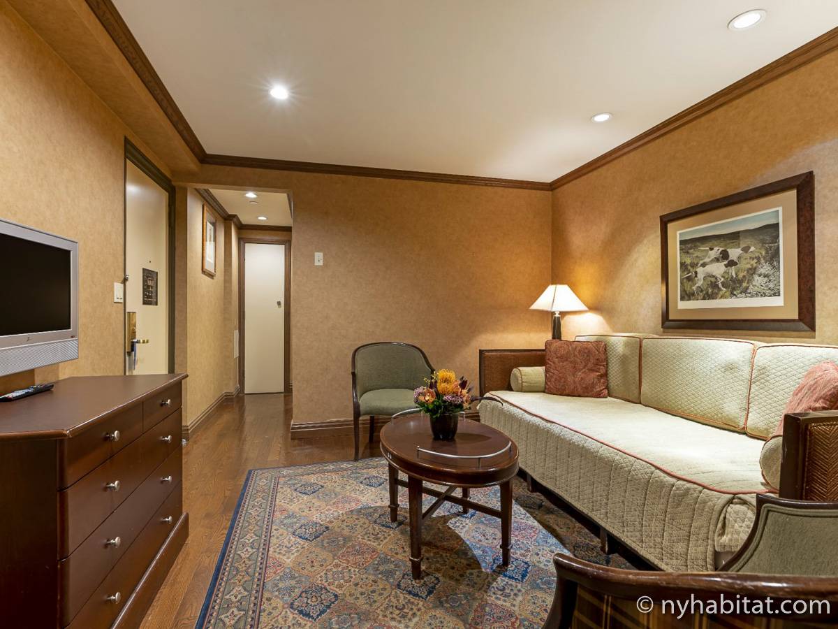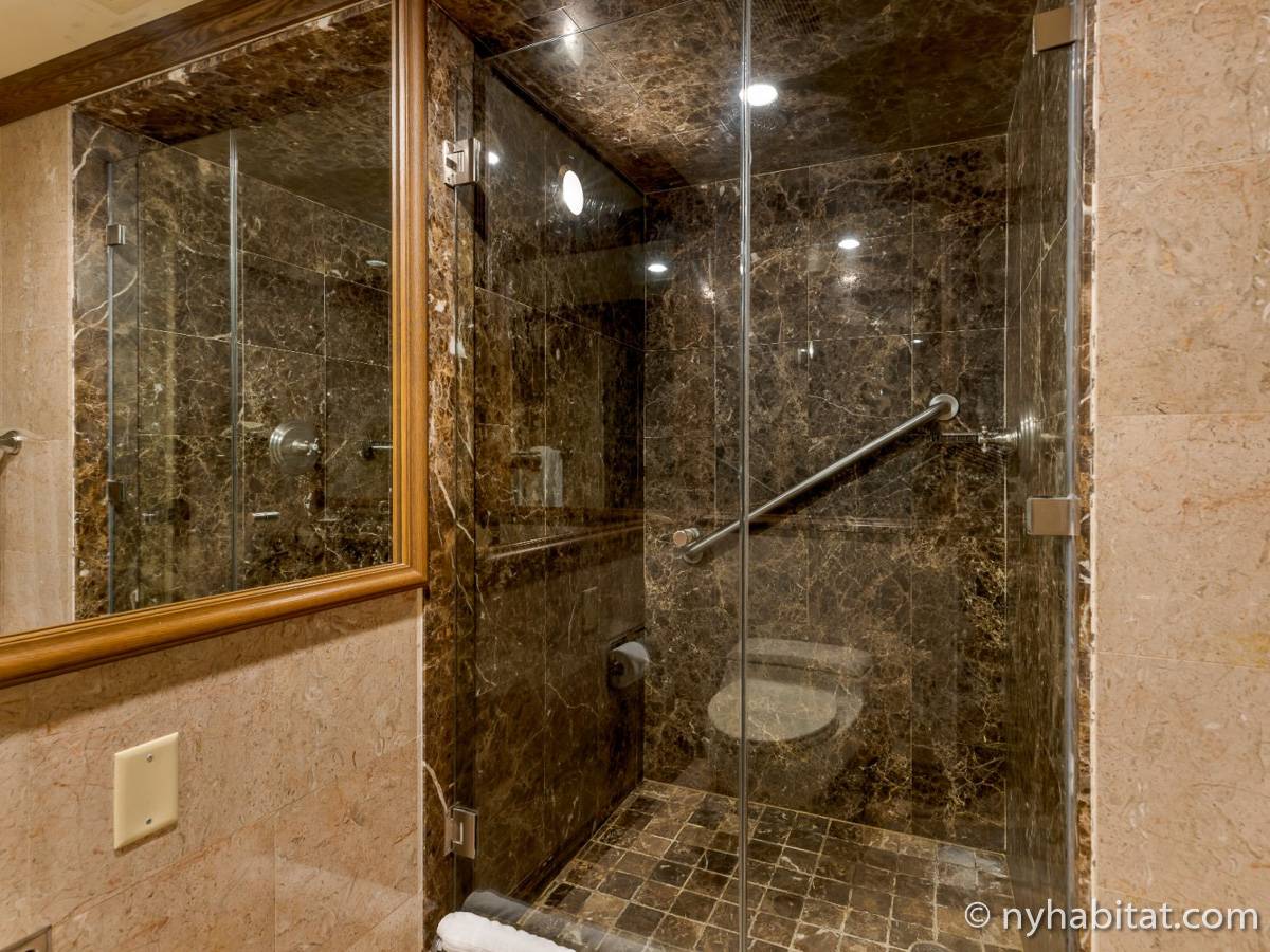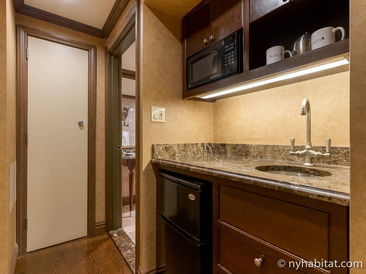 Here is a vacation rental located in Midtown West, Manhattan. This one-bedroom, one-bathroom accommodation is situated near the intersection of West 55th Street and 7th Avenue in New York. The building offers amenities, including an elevator, a doorman, and a storage room for your belongings.