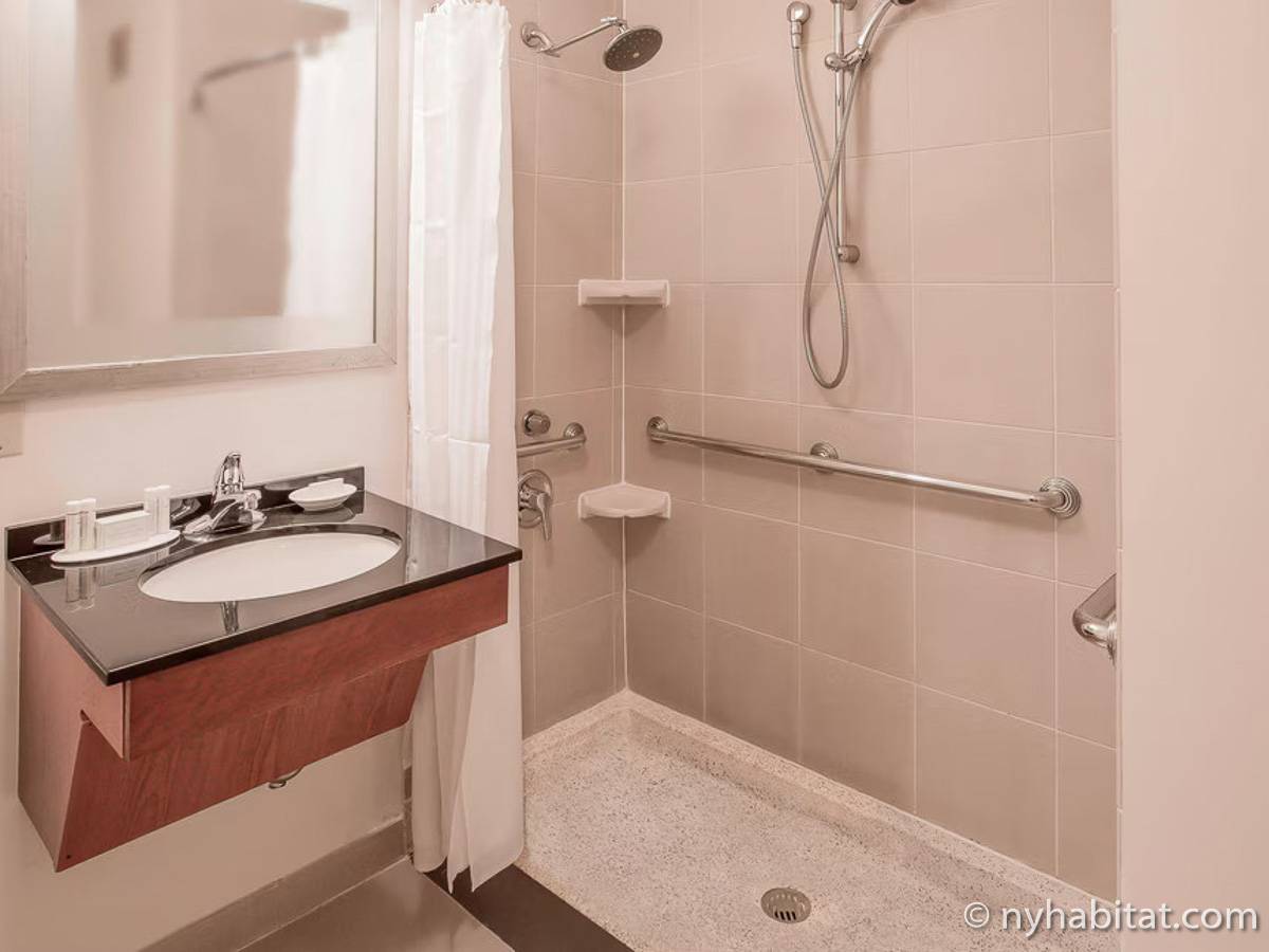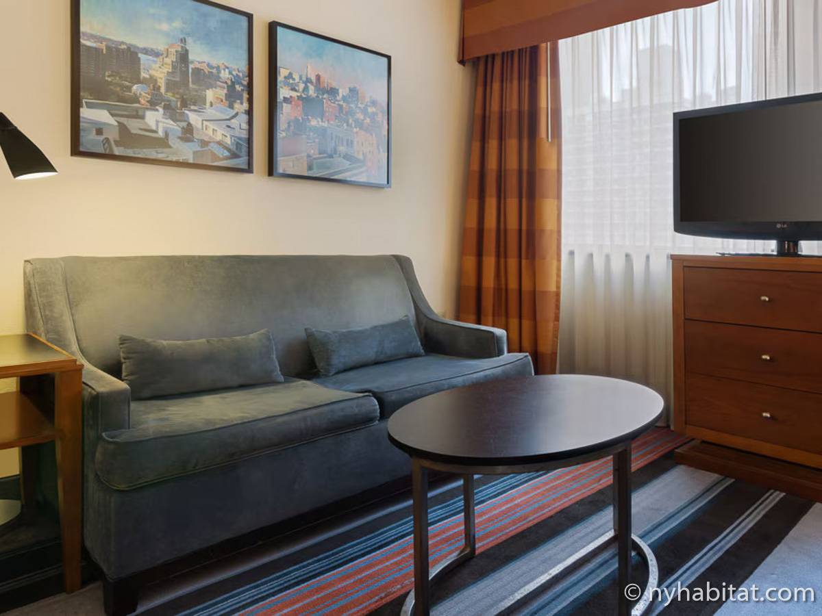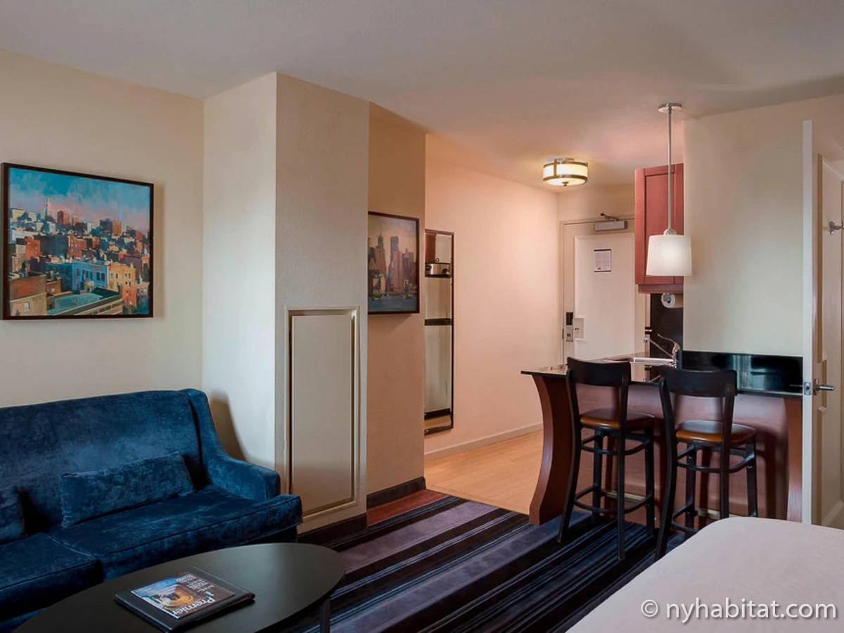 Here is a vacation rental in the Midtown West neighborhood of Manhattan, New York. This 320-square-foot (around 30 m2) accommodation is in a high-rise building that sits near the corner of 6th Avenue and West 39th Street. There is a doorman, elevator, gym, laundry room, and parking space.