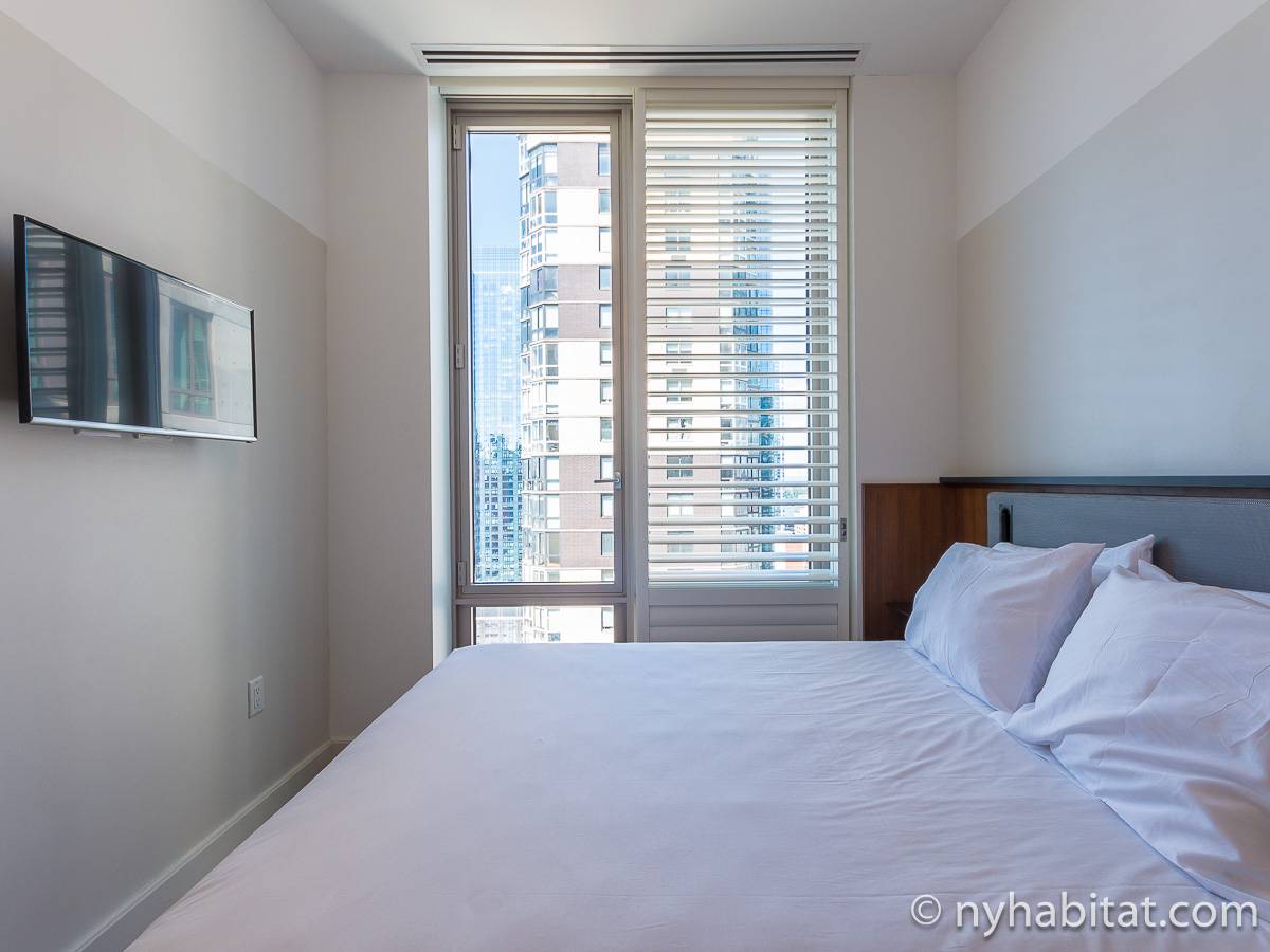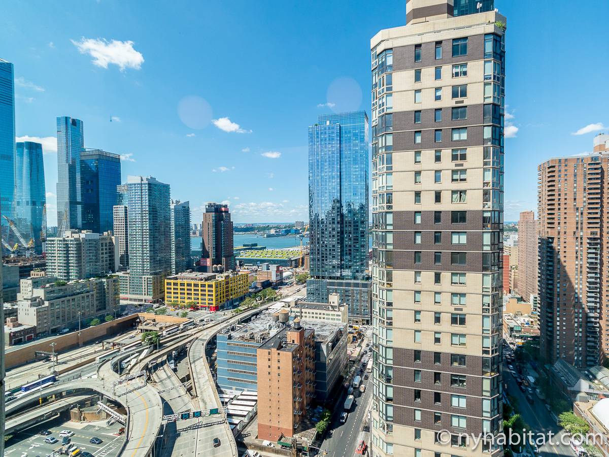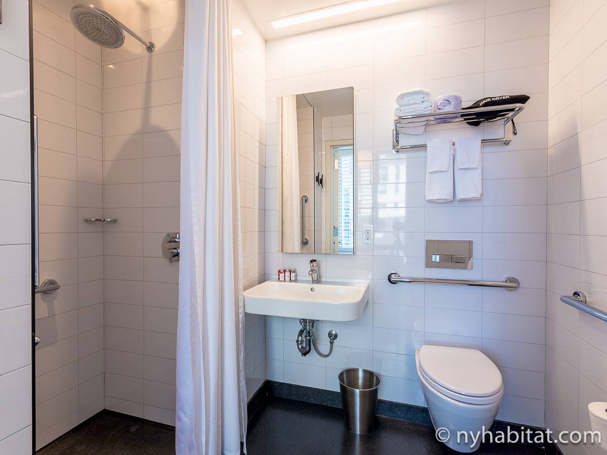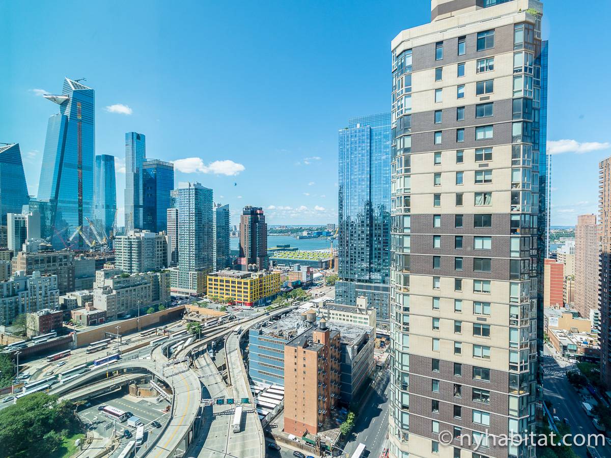 Here is a 1-bedroom 1-bathroom furnished apartment in the Midtown Westneighborhood of Manhattan, New York. This accommodation is located in a 28-story high-rise building that sits near the corner of West 42nd Street and 9th Avenue, four blocks from Times Square. The building has a doorman, elevator, laundry room, and gym.