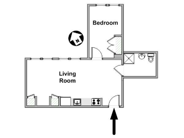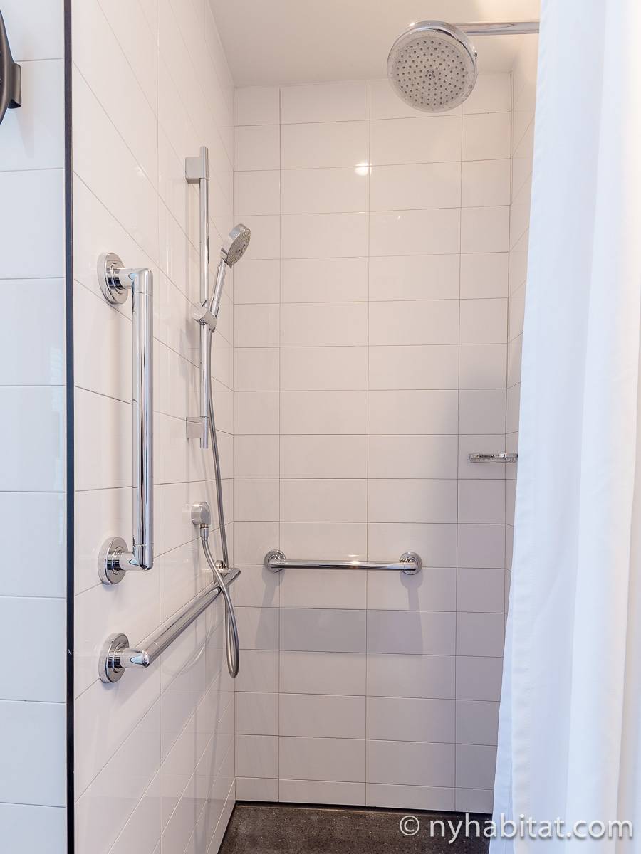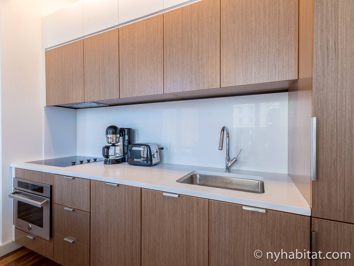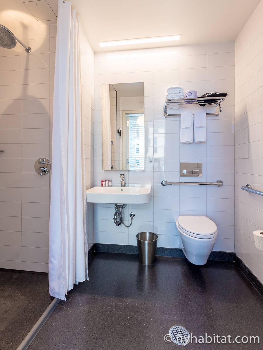 Here is a 1-bedroom 1-bathroom furnished apartment in the Midtown Westneighborhood of Manhattan, New York. This accommodation is located in a 28-story high-rise building that sits near the corner of West 42nd Street and 9th Avenue, four blocks from Times Square. The building has a doorman, elevator, laundry room, and gym.