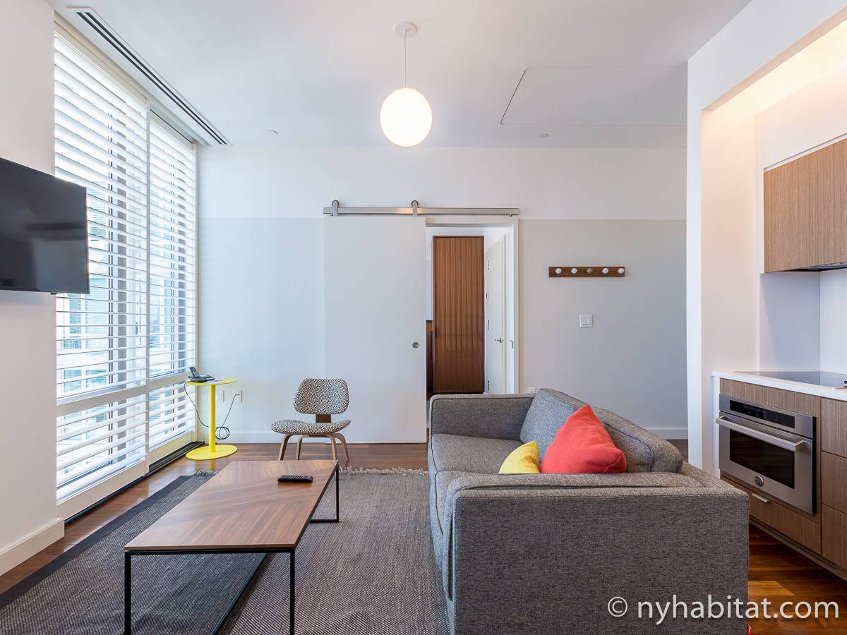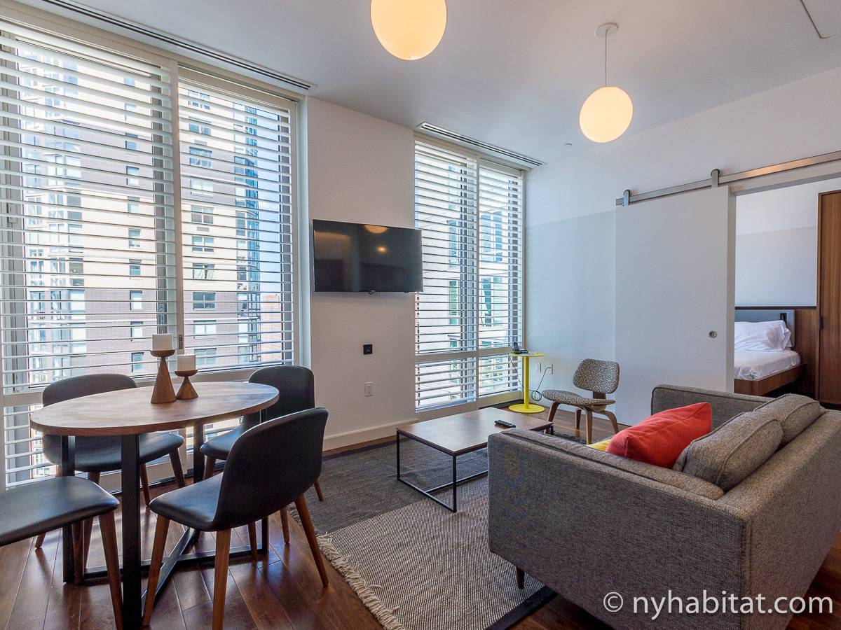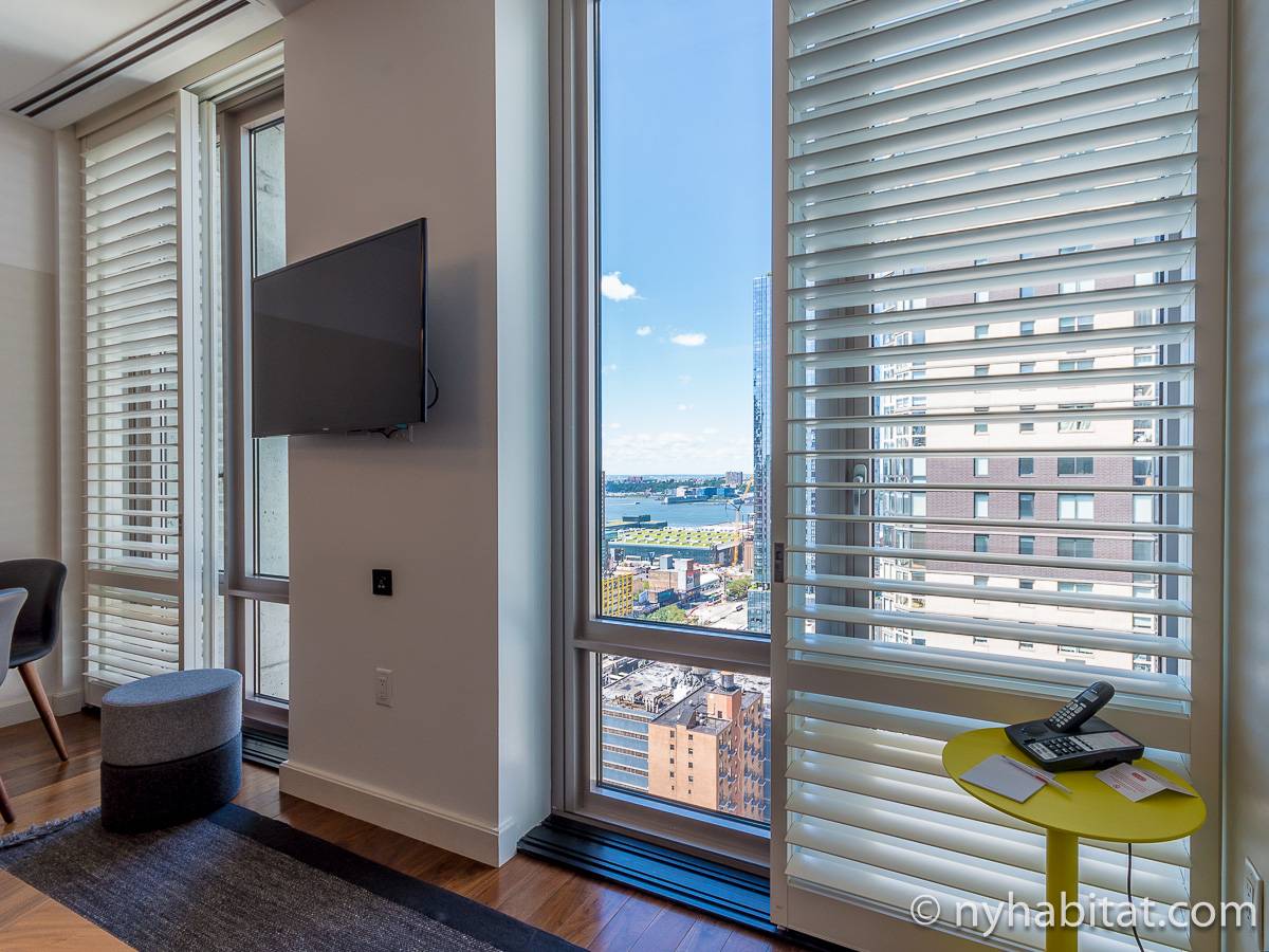 Step inside this furnished rental to find a living room with floor-to-ceiling windows, featuring views of the Manhattan skyline. Admire the city while relaxing on a sofa or at the dining table. The open kitchen is equipped with a refrigerator, freezer, oven, microwave, coffeemaker, toaster, and dishwasher. Through a sliding door is the bedroom, which has a queen-size bed and more floor-to-ceiling windows to allow natural light to fill the space. The bathroom has dual shower heads.