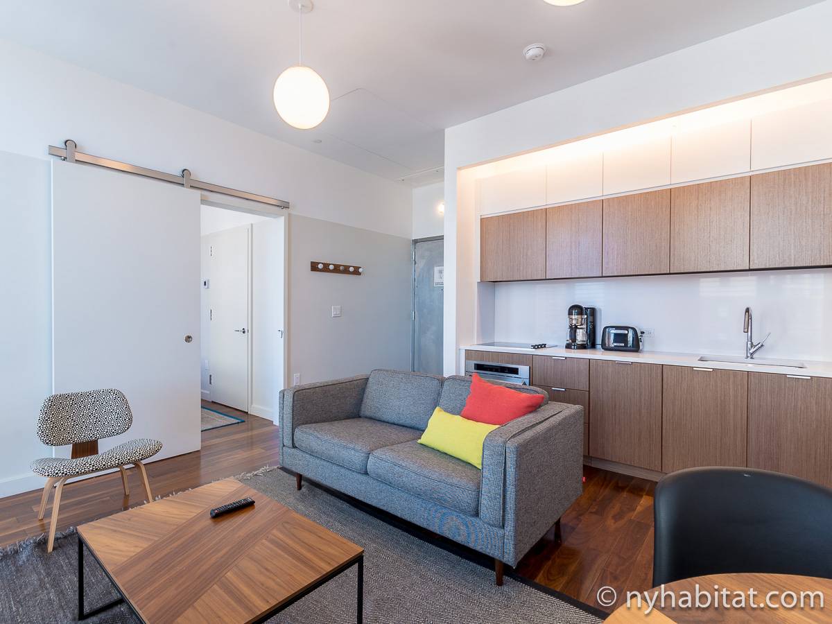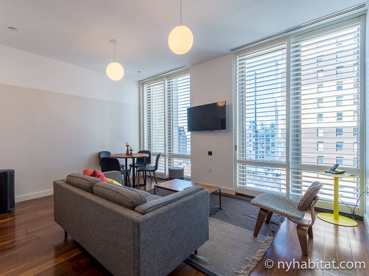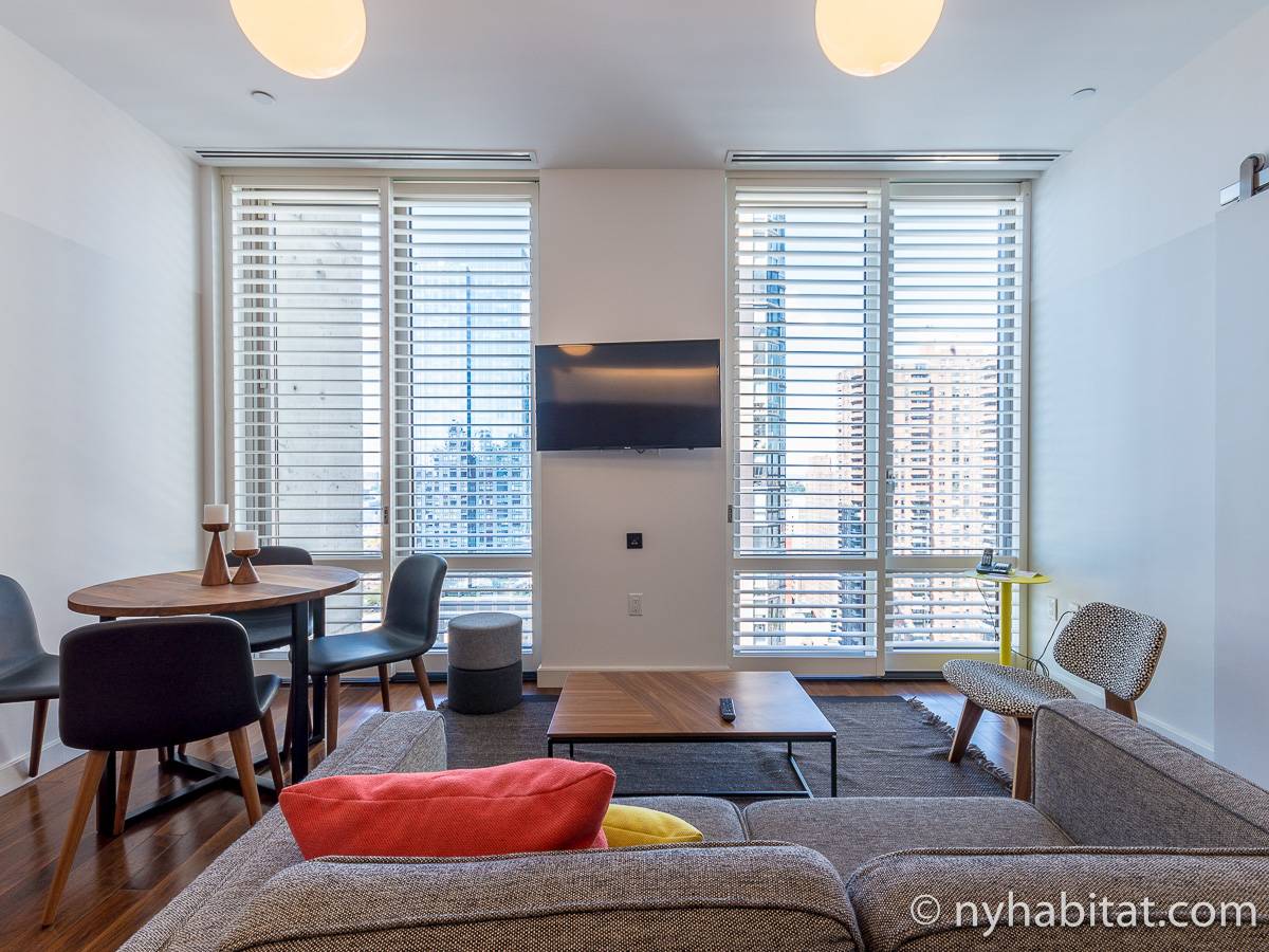 Step inside this furnished rental to find a living room with floor-to-ceiling windows, featuring views of the Manhattan skyline. Admire the city while relaxing on a sofa or at the dining table. The open kitchen is equipped with a refrigerator, freezer, oven, microwave, coffeemaker, toaster, and dishwasher. Through a sliding door is the bedroom, which has a queen-size bed and more floor-to-ceiling windows to allow natural light to fill the space. The bathroom has dual shower heads.