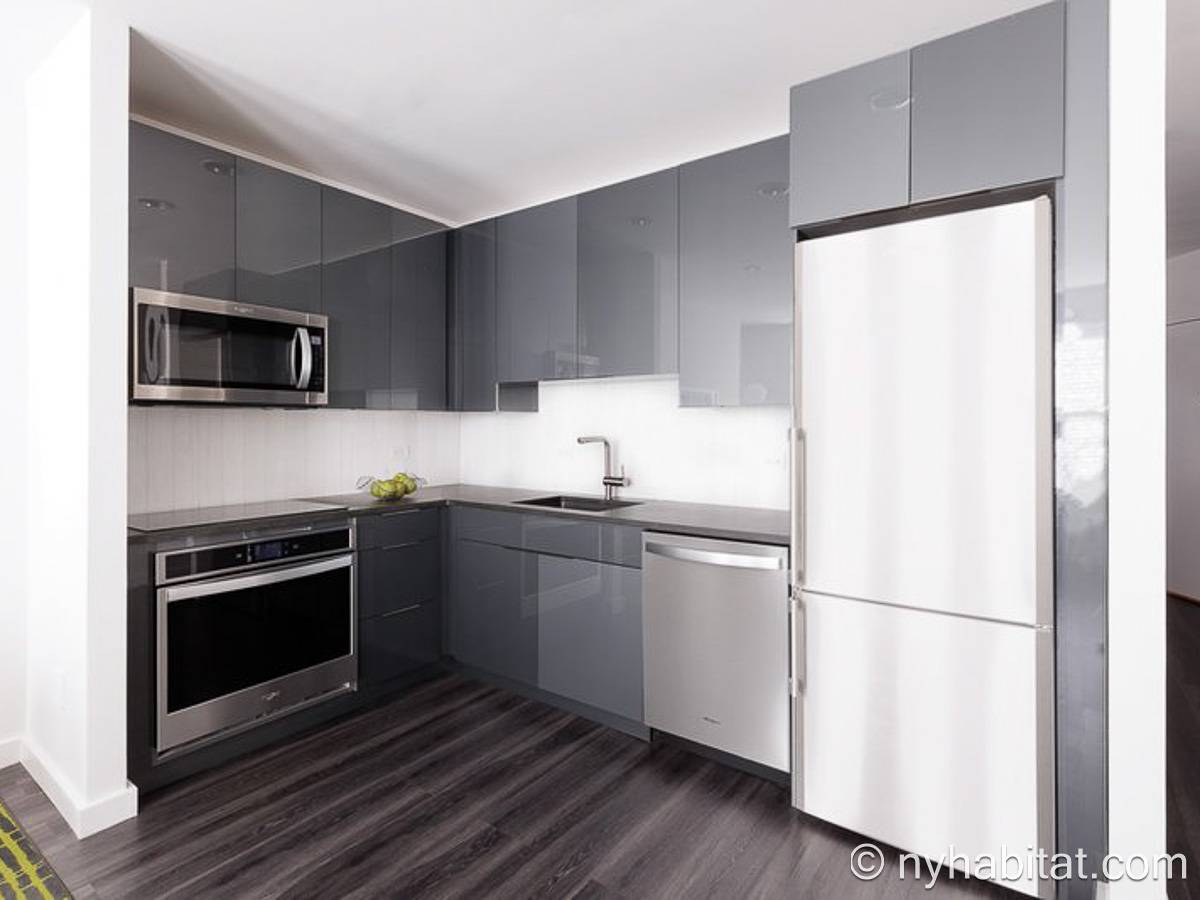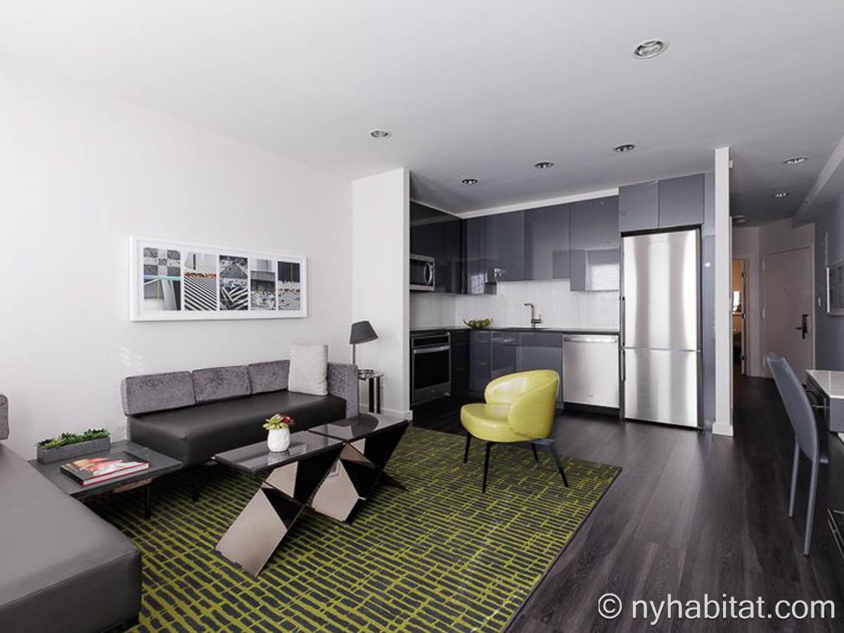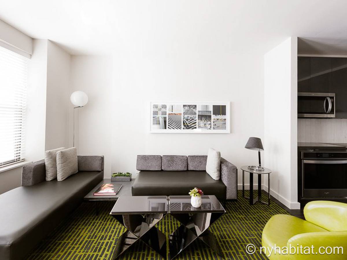 This furnished apartment in Midtown West, Manhattan, is located at 6th Avenue and West 44th Street. The 1-bedroom, 1-bathroom unit spans 735 square feet (around 68 m2) and is situated in a building with a doorman, elevator, gym, and in-unit washing machine and dryer.