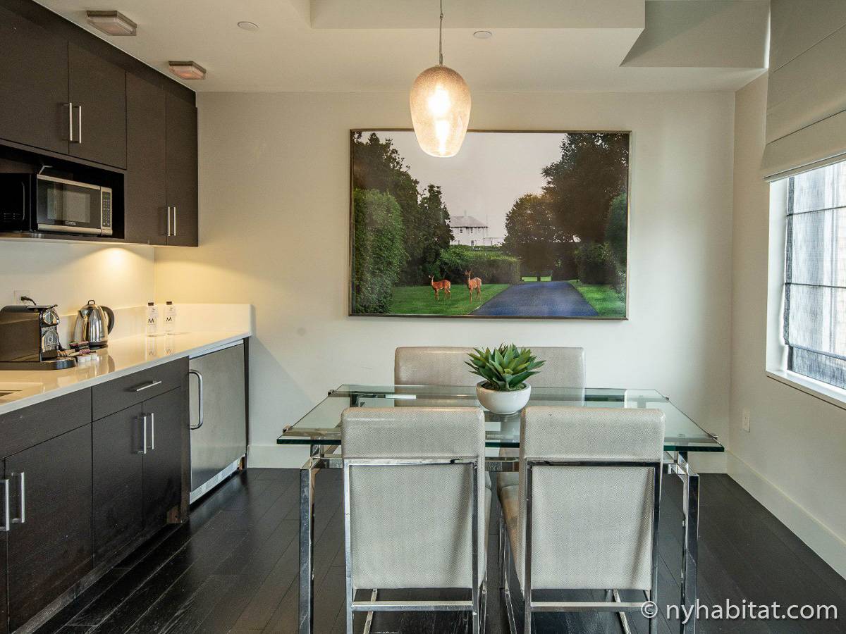 This furnished rental combines style and comfort with an open, light-filled layout. The apartment is fully air-conditioned for year-round comfort. The living area features hardwood floors, a sofa, a TV, and a coffee table perfect for enjoying morning coffee or winding down in the evening. A dining table connects seamlessly to the kitchen, which is equipped with a mini fridge, freezer, microwave, coffeemaker, and toaster, providing everything needed for convenient in-home dining. Next to the dining area is the bedroom, complete with a king-sized bed, closet space, a TV, and its own air conditioning. The bathroom offers a walk-in shower, marble sink, and a backlit mirror, combining practicality with luxury.
