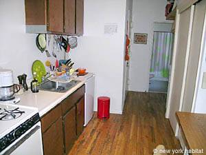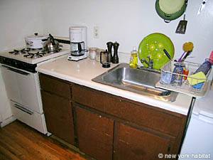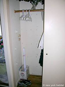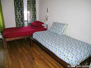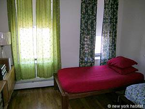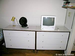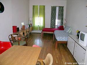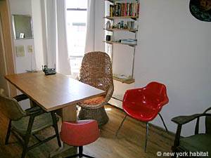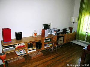 Interior: This sun filled space has 10' high ceilings and generous windows throughout which provide cross ventilation. New window A/C installed. The furniture is simple and functional. There are two single beds with futon mattresses which accommodate 2 people. The apartment is equipped with a radio and a TV. There is also high speed internet access for guests who have their own computer.
