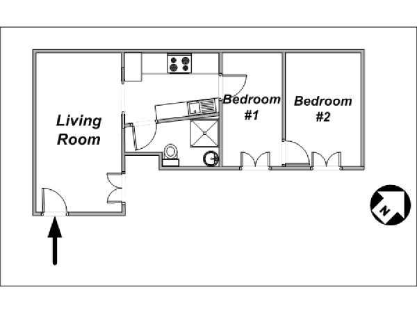 The entry door opens directly onto the large living room. In the middle of the room to your right, there is a sliding door, which opens to the kitchen. The living room gives access to the bathroom and to the first bedroom. The second bedroom is accessible by the first bedroom.