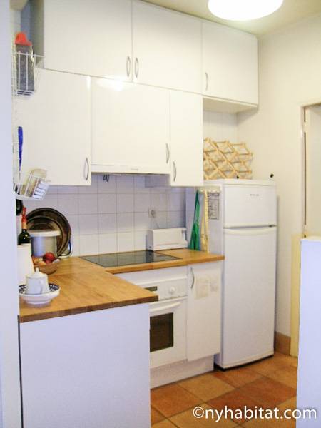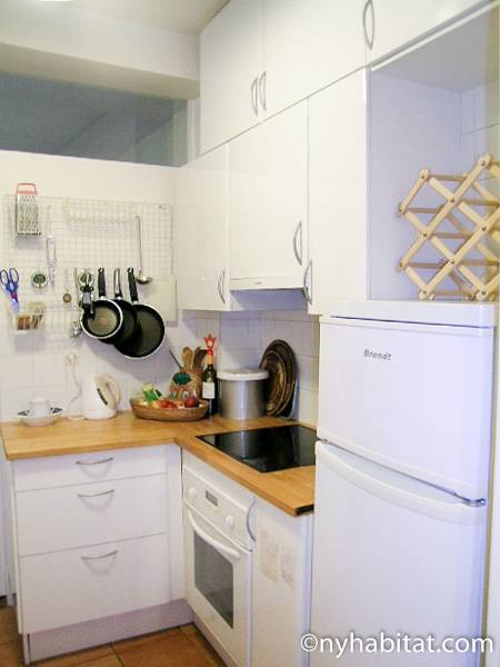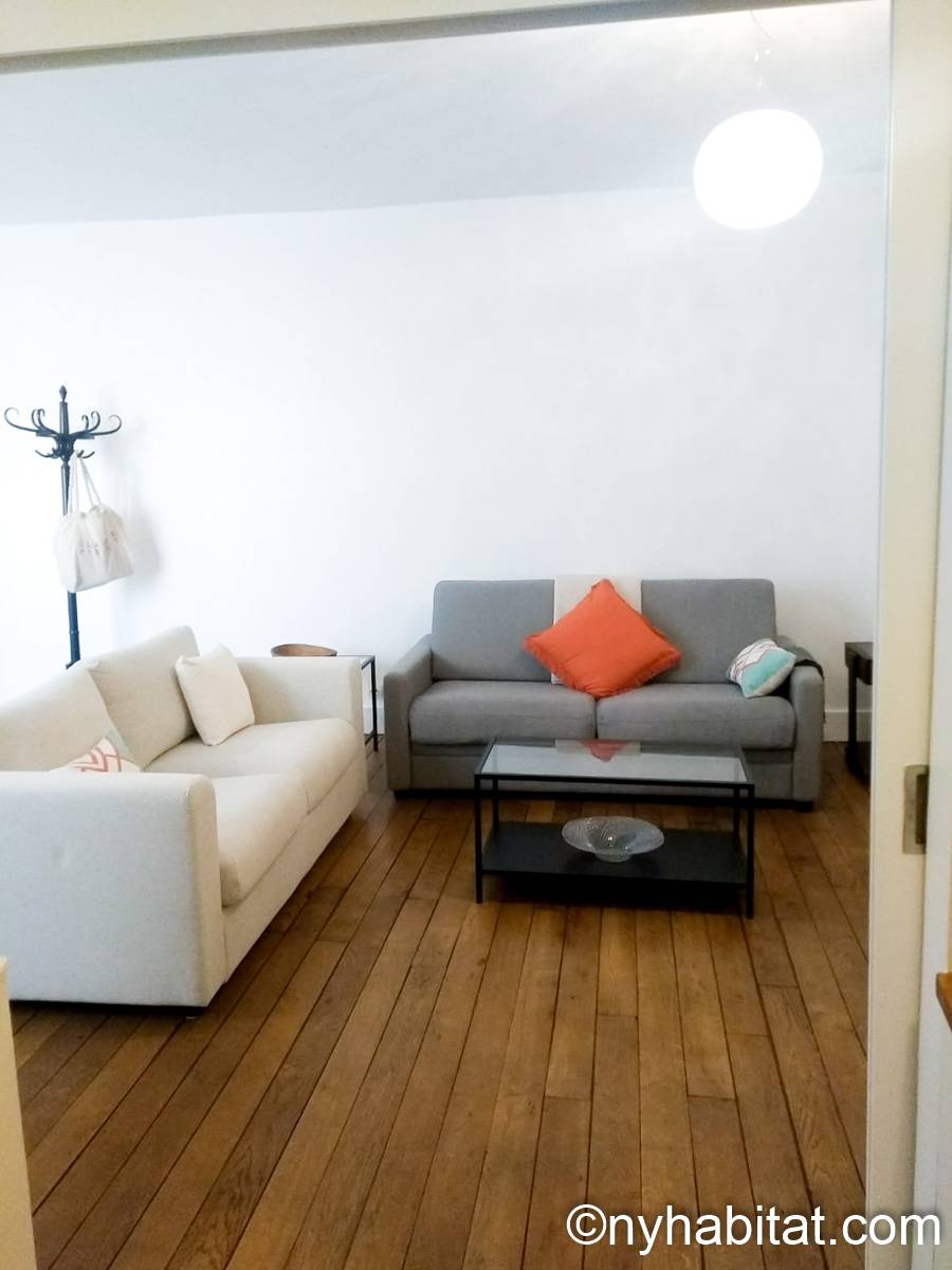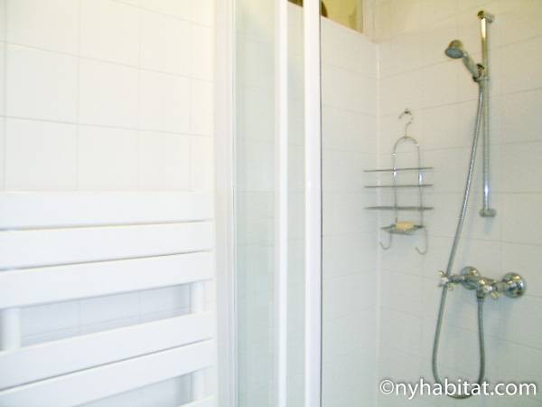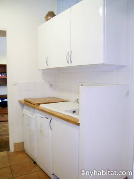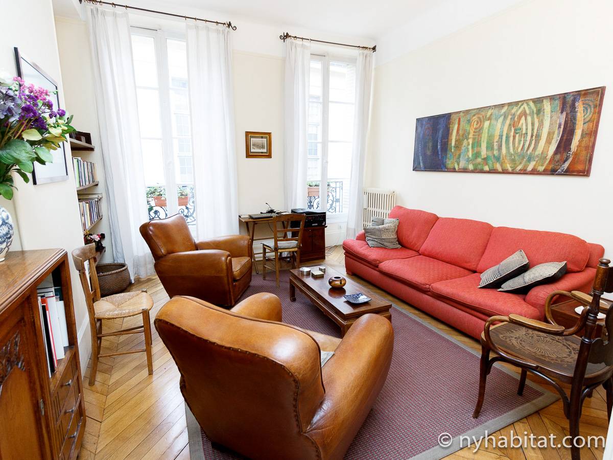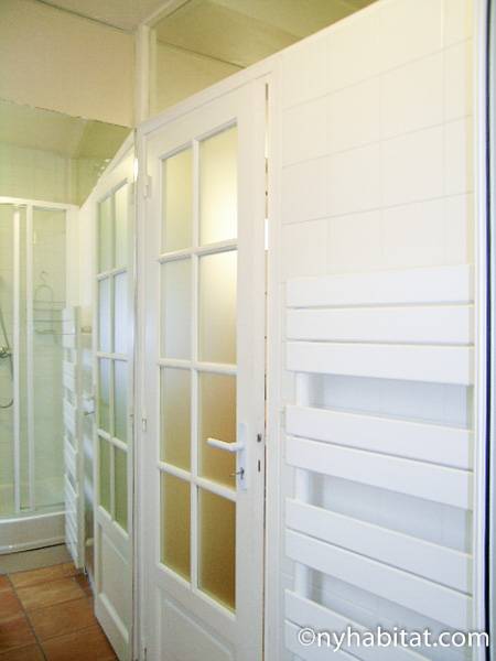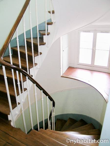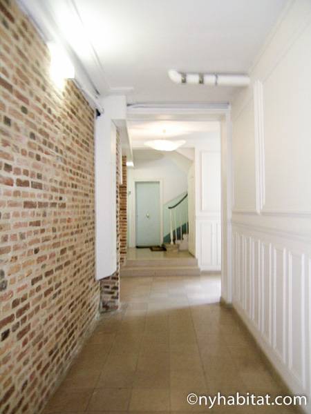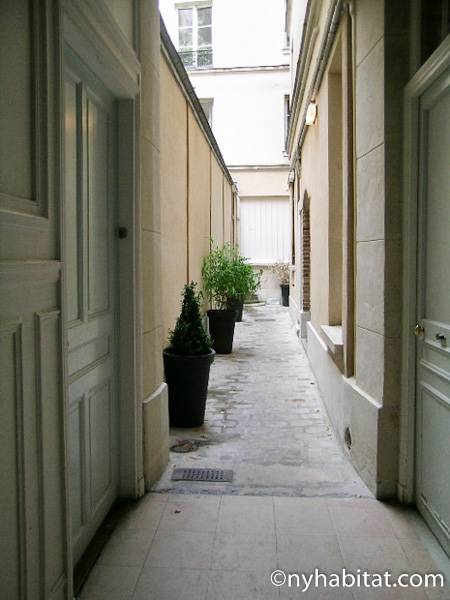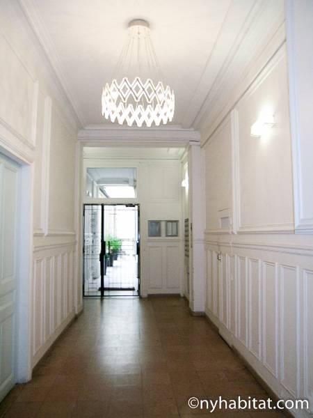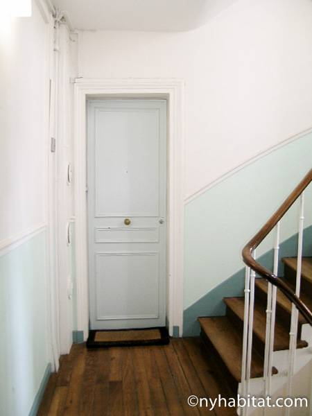 This 58m² (approx. 625 sq. ft.) furnished apartment is situated on the first floor (2nd in the USA) of a 19th century walk-up building. The main entrance gate is protected by a coded security system and opens into a hall with a second door protected by an intercom.