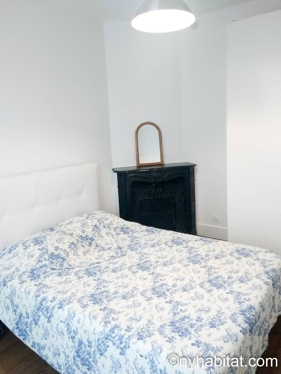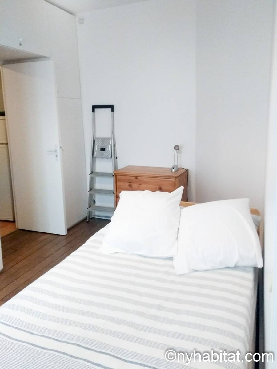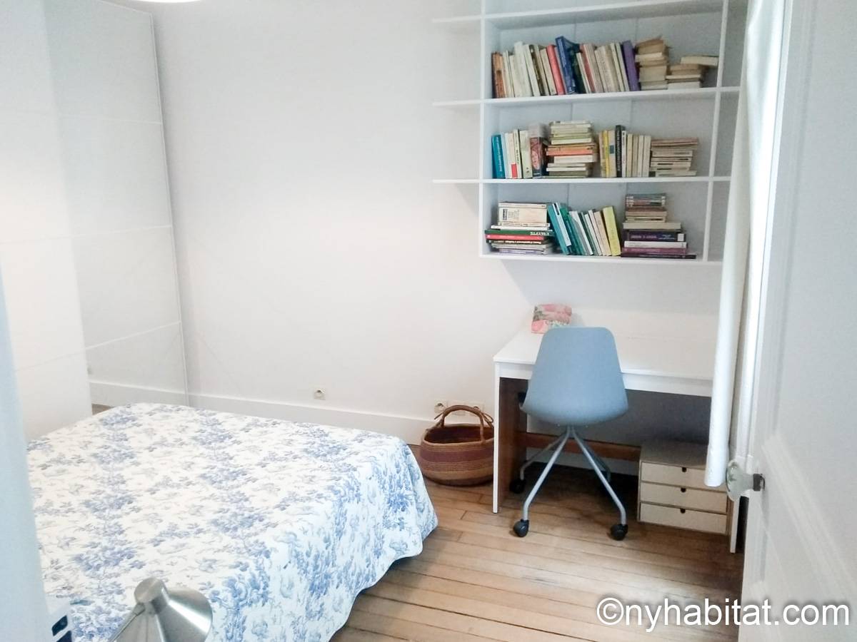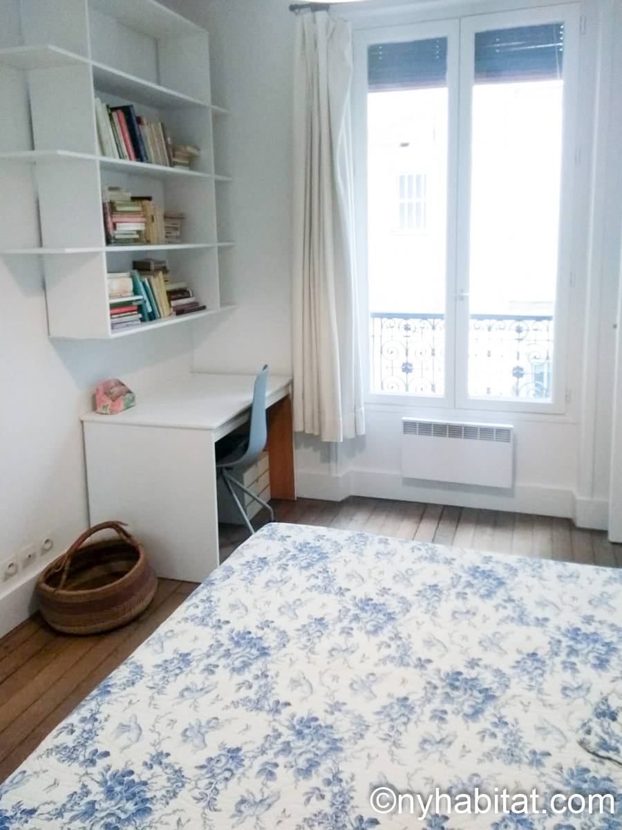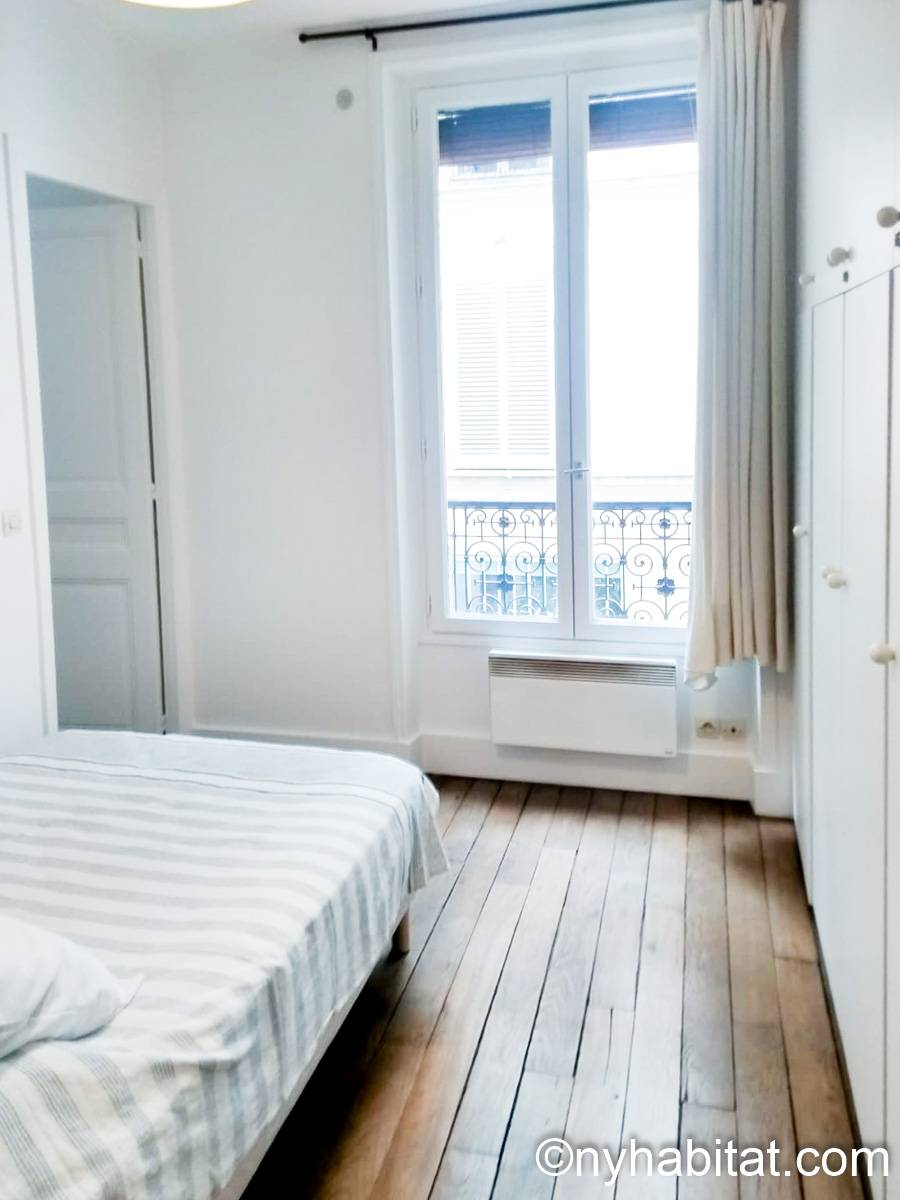 The first 9m² (approx. 95 sq.ft.) bedroom has parquet floor and a window, which overlooks a courtyard. It is furnished with a single size bed, drawers, cupboards, as well as large built in closets.