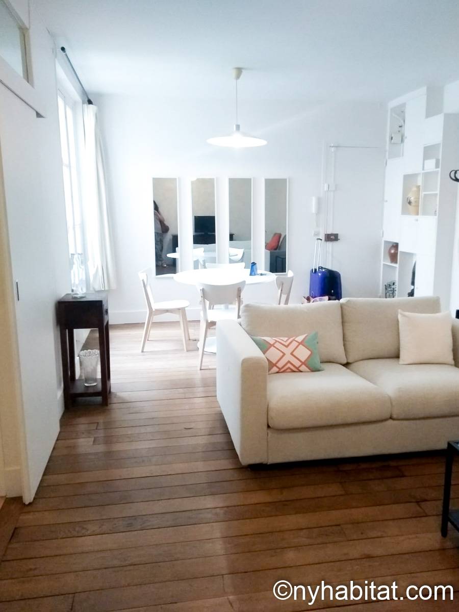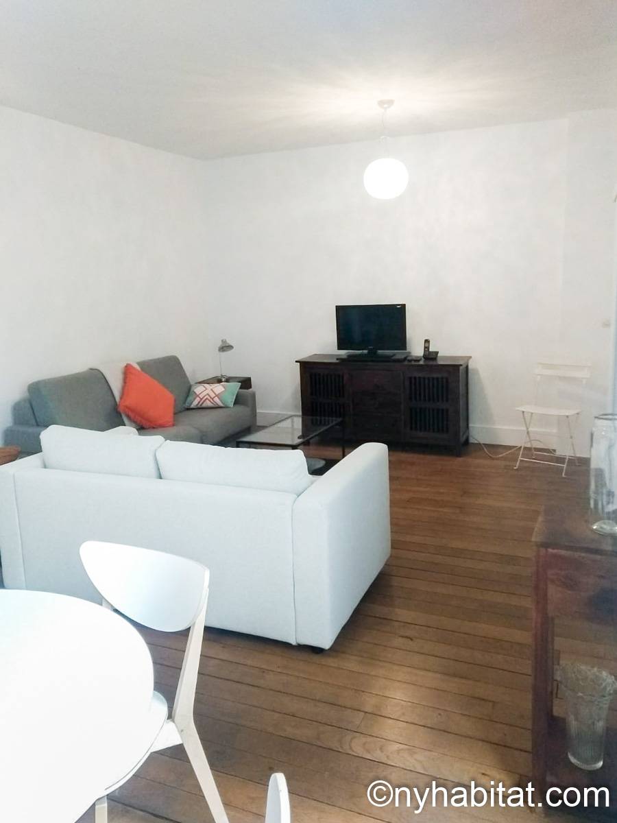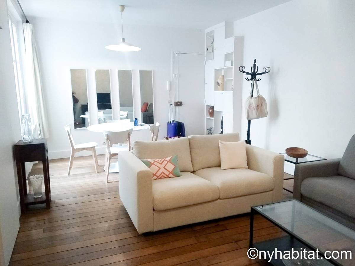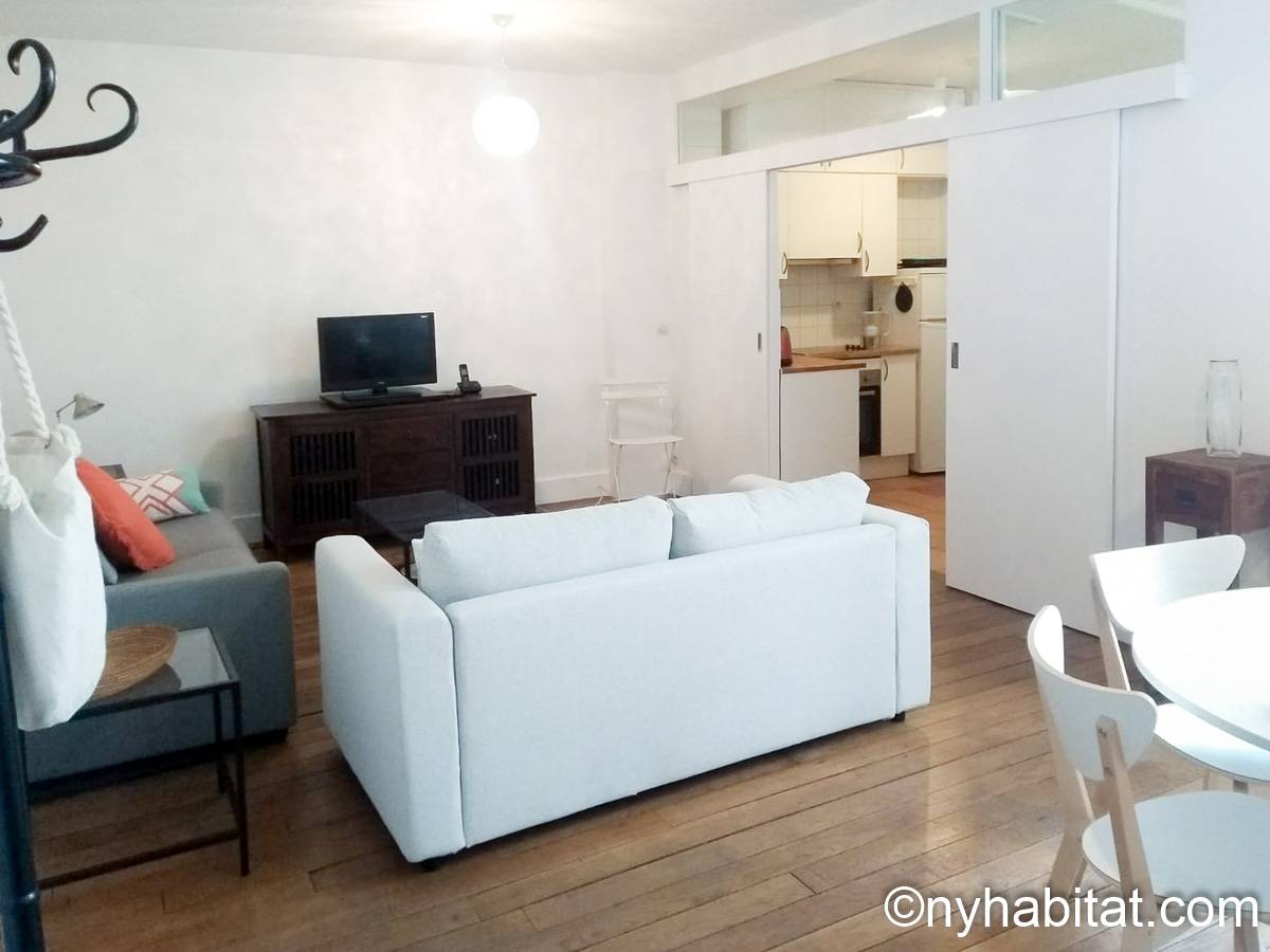 The 30m² (approx. 320 sq.ft.) living room has parquet floor and a window with a view on a courtyard. It is furnished with two sofas, a double size bed, a coffee table and a dining table. It is also equipped with a cable TV and a stereo, as well as some bookshelves.