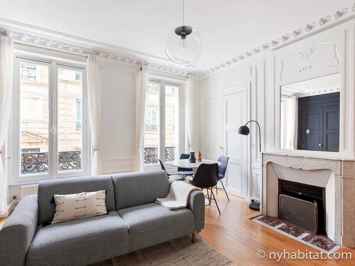 The 30m² (approx. 320 sq. ft.) living room has four double-glazed windows; one of them overlooks a small courtyard with an eastern exposure and the other three overlook the building’s courtyard with a western exposure. It is decorated in a contemporary style and is furnished with a sofa, two armchairs, a coffee table, shelves, and a contemporary style dining table with chairs. It is also equipped with a cable flat screen TV with a DVD player.