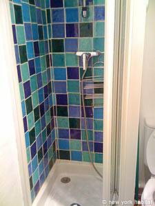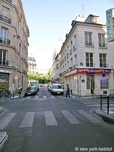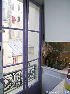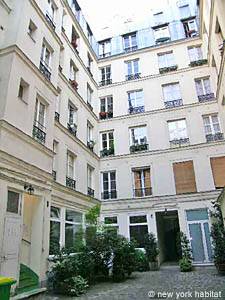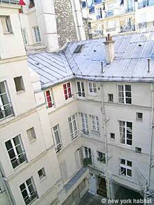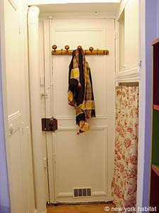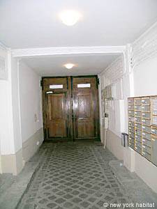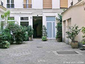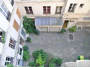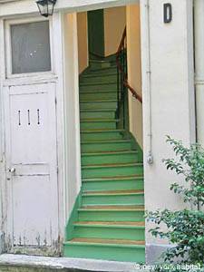 This 25m² (approx. 265 sq. ft.) studio apartment is located on the fourth floor (fifth in the USA) of an 18th century walk-up building. The main entrance gate is protected by a coded security system. It opens into a courtyard that leads to the building's staircase.