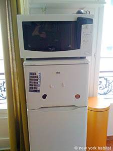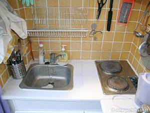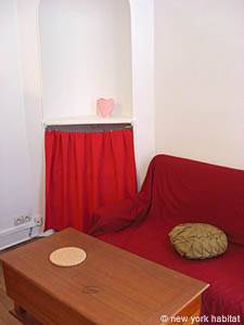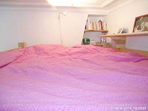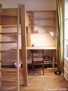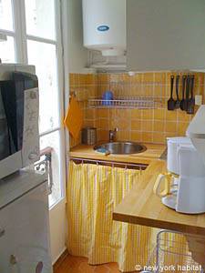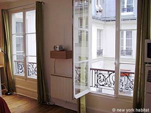 This studio apartment is divided into two parts: a living room and a small bedroom area. It has three windows overlooking the courtyard with a western exposure. There is a wireless Internet connection.