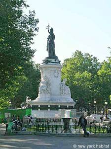 This studio apartment near the Boulevard Voltaire is only a few stations from the Marais and Bastille areas. In the immediate vicinity are numerous shops, restaurants and cafes, supermarkets, and markets such as the well-known Parisian market Rue Richard Lenoir (Thursday and Sunday mornings). It is also close to the Place de la Republique, which has at its center the 10m-high Republic statue resting on a bronze base. Very close by is the famous Place de la Bastille, where the new Opera, considered one of the best in the world, was inaugurated for the 200th anniversary of the French Revolution.