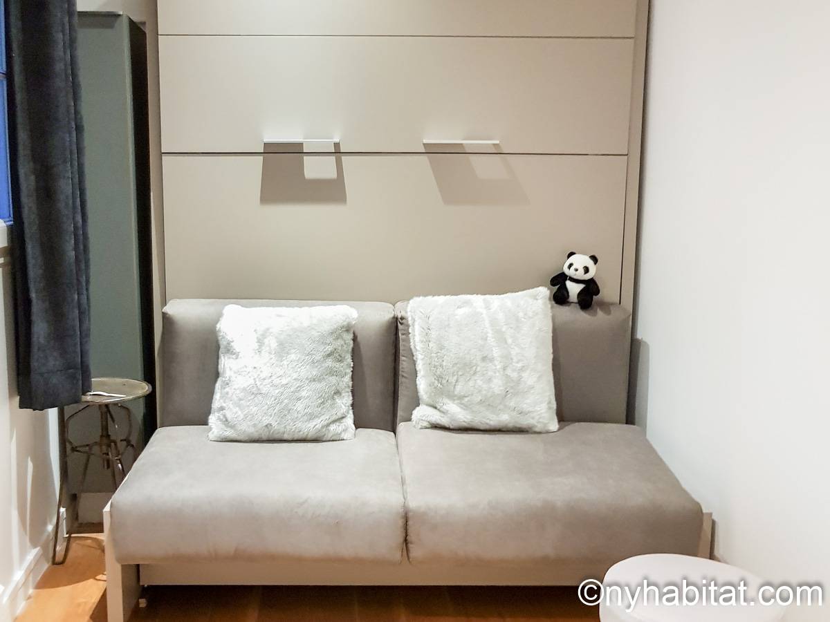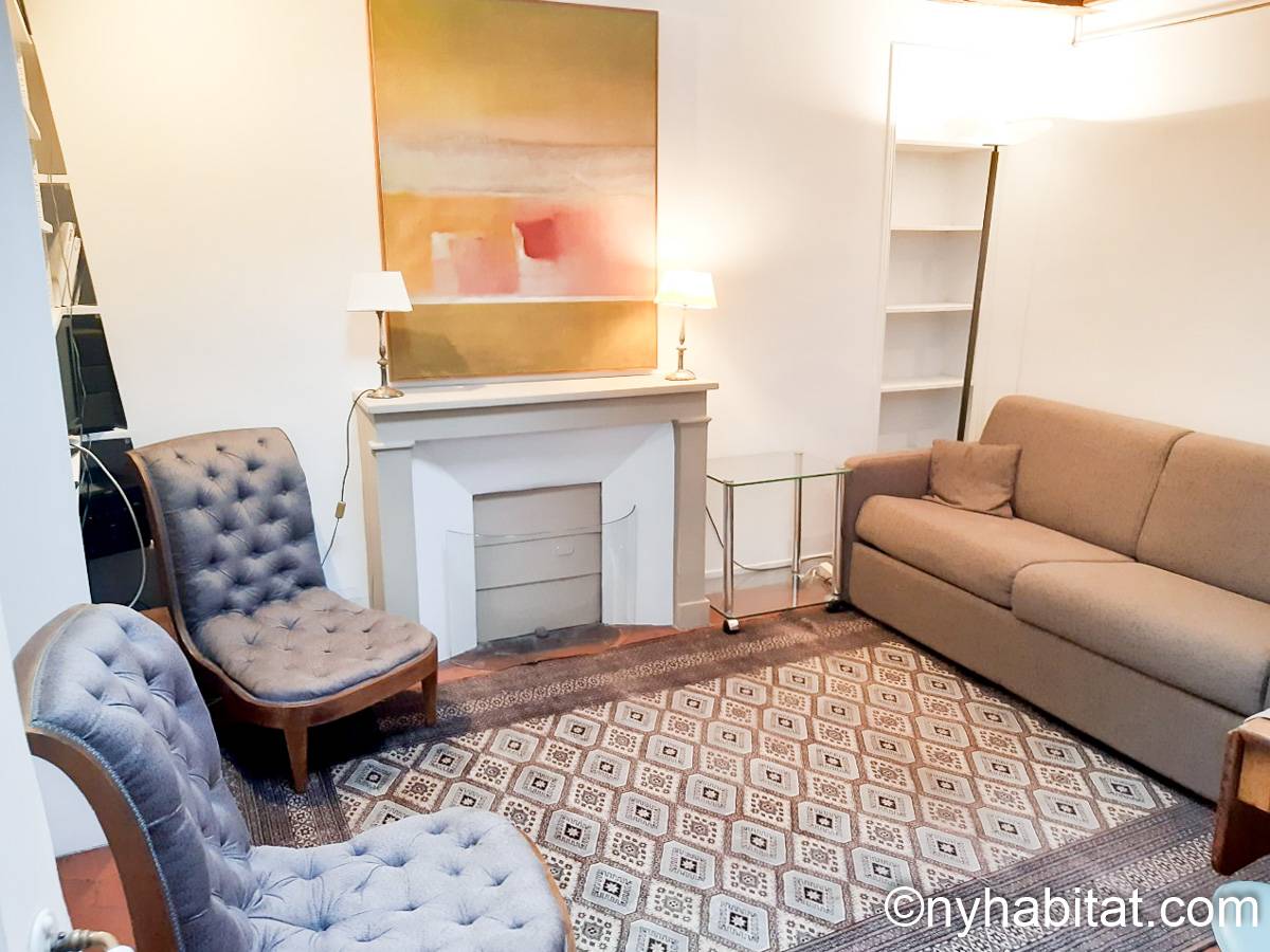 Due to the large windows (nearly floor-to-ceiling), the living room receives a lot of natural light. It features elegant accents like hardwood floors, wall moldings and a fireplace. The space is both comfortable and elegant, decorated in a gray palette with nice paintings and furniture. Take advantage of the numerous built-in bookcases and shelves to store your personal belongings and give the place a personal touch by adding decorative pieces of your own—you’ll feel right at home! The separate kitchen is equipped with the major appliances and utensils needed to prepare your own meals. Conveniently, there is a dishwasher so you don’t have to worry about cleaning afterward! The rental also comes with a washing machine for your laundry needs. The bedroom has a double bed and the bathroom features a bathtub with two showerheads, as well as a towel-dryer; the toilet is separate. Aside from the unit’s amenities, one of the main advantages of this one bedroom apartment is its location!