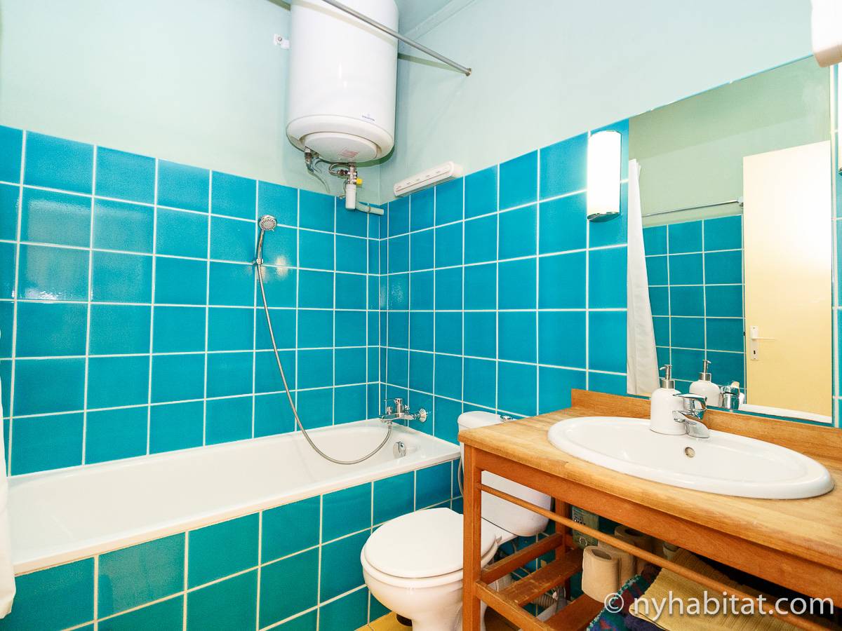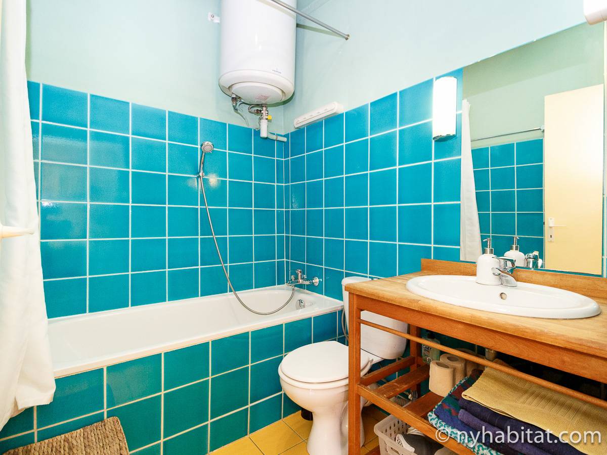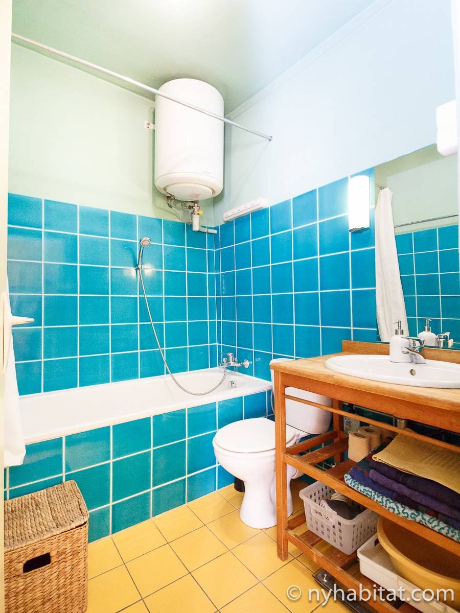 The bathroom has a bathtub topped by a showerhead, a washbasin and a toilet.