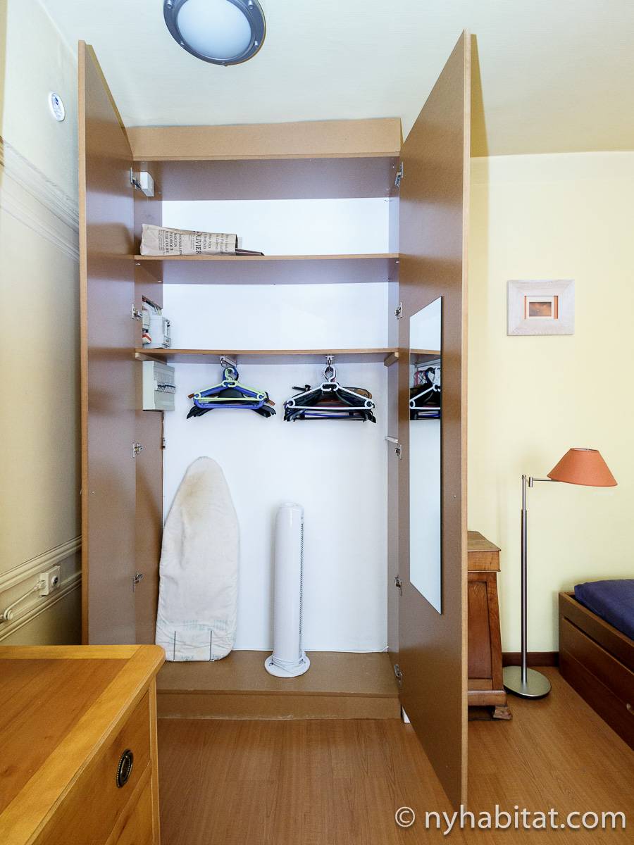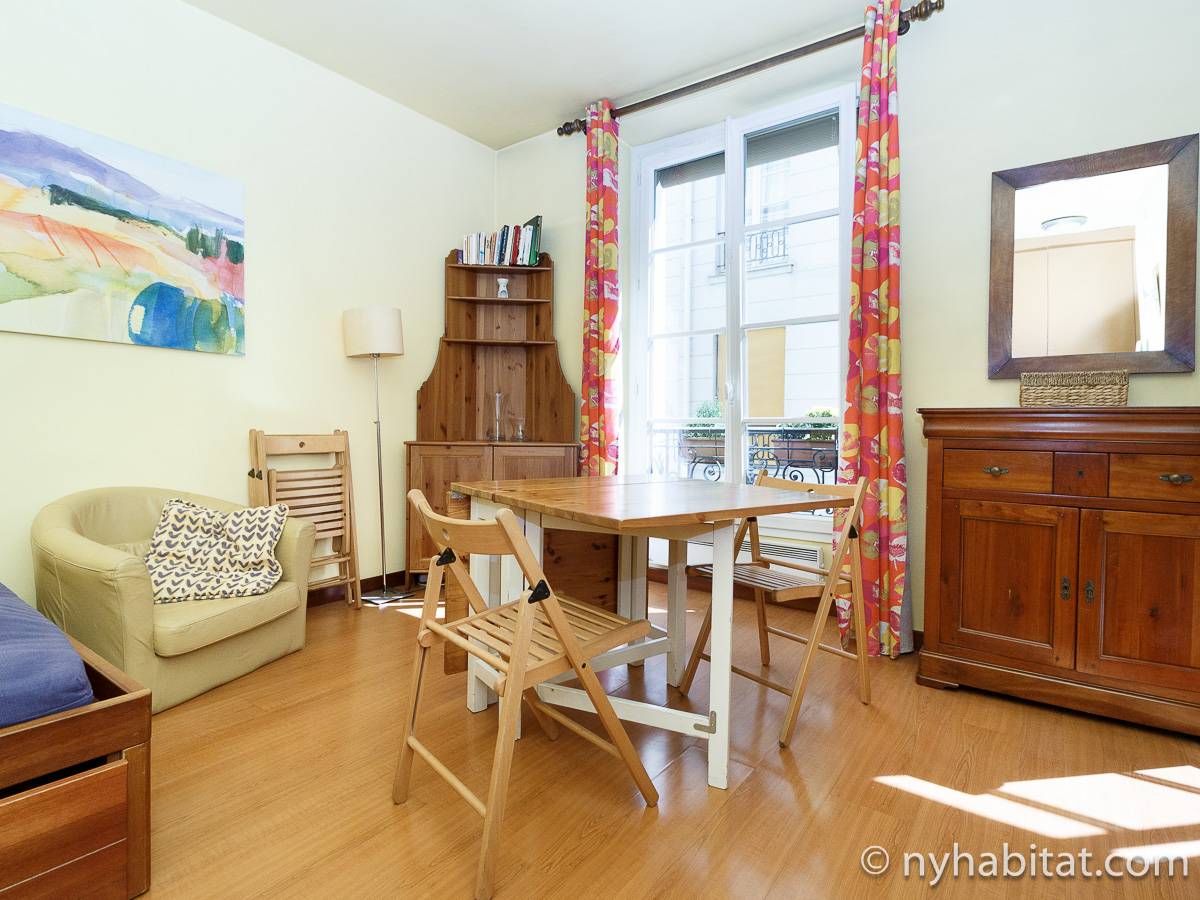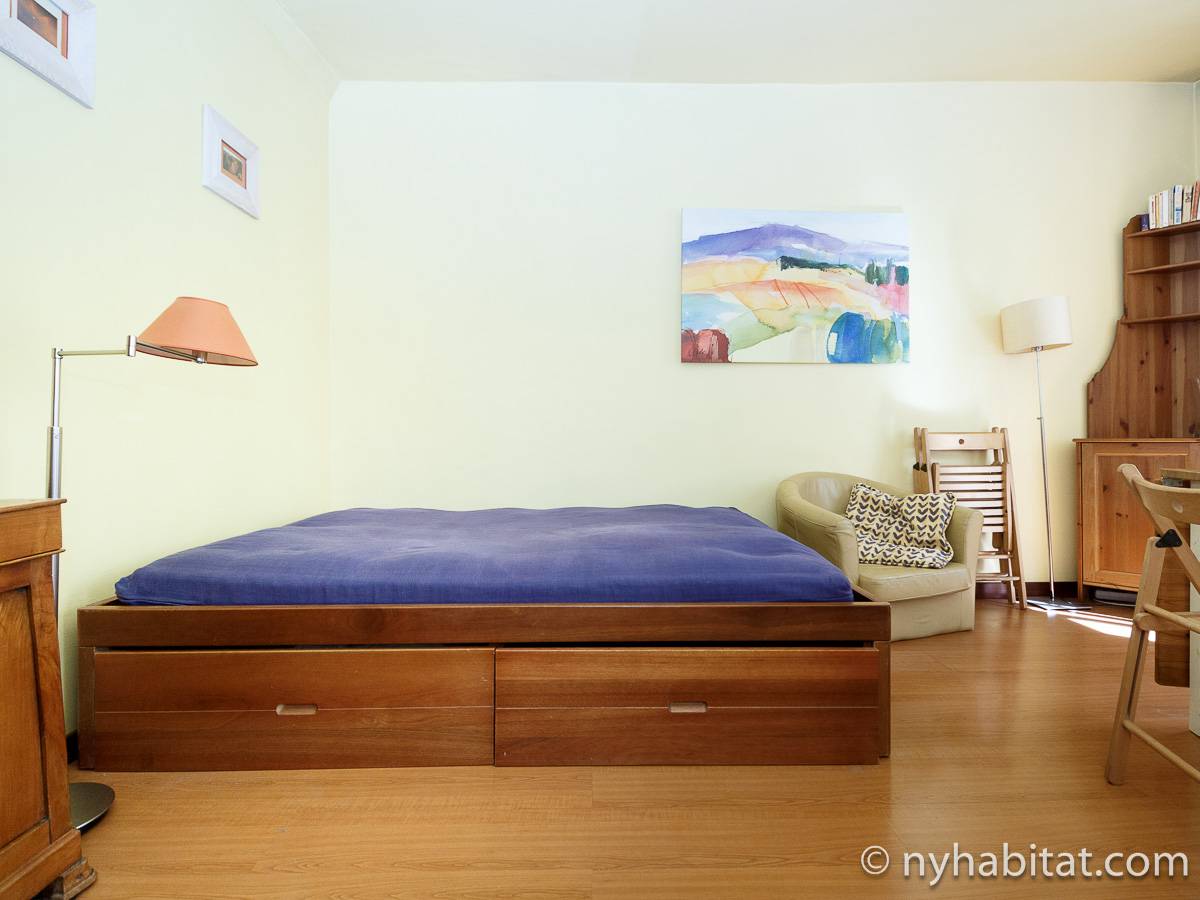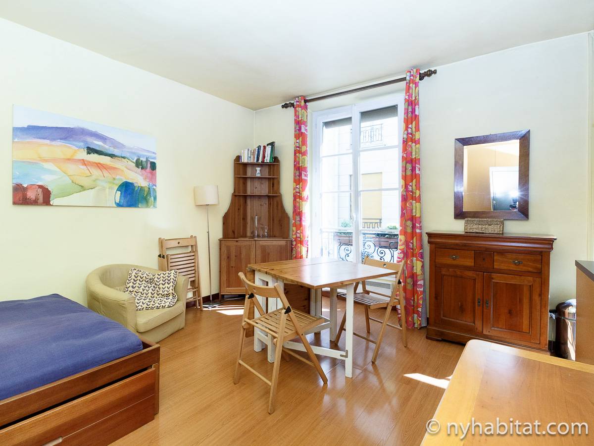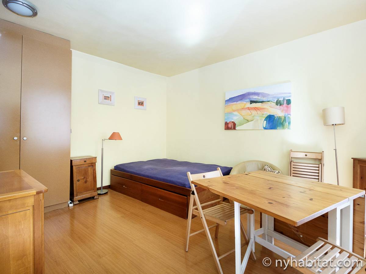 The living room has two windows with Eastern exposure overlooking the street. It is furnished with a double bed, a bedside table, a chest of drawers, a dining table for four, a phone and a closet.
