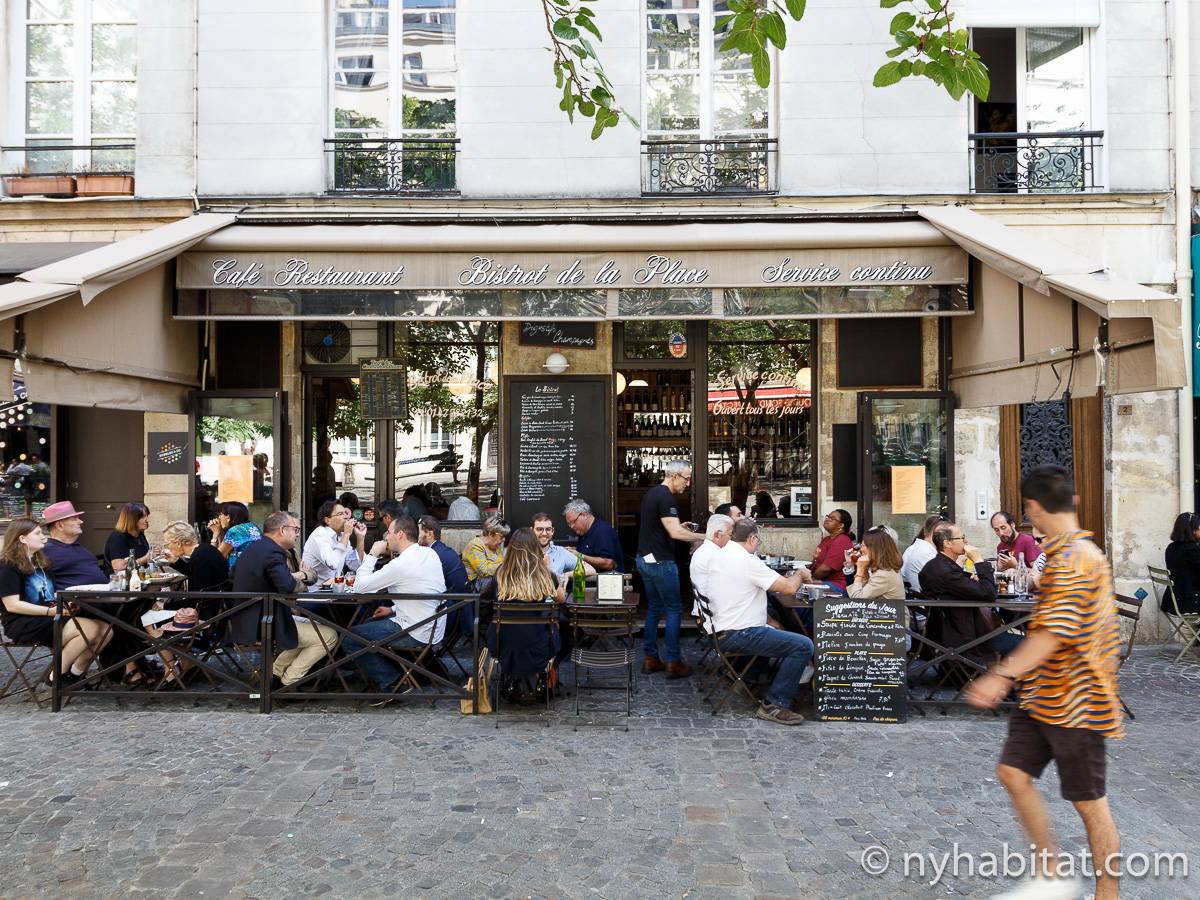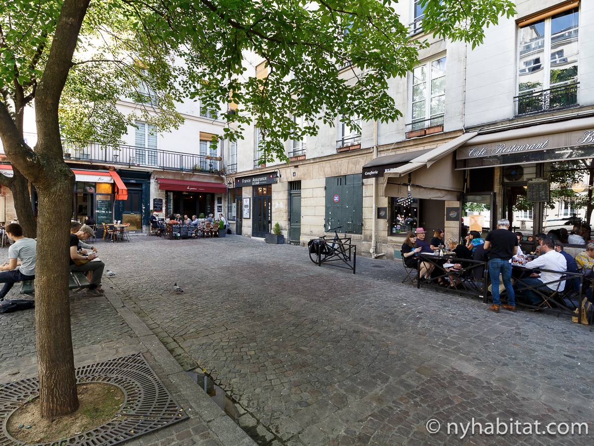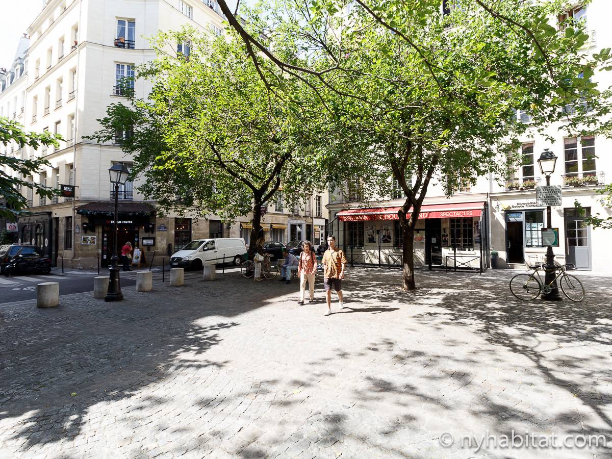 This furnished studio apartment is located on Place du Marché Sainte-Catherine between Rue de Jarente and Rue d'Ormesson.