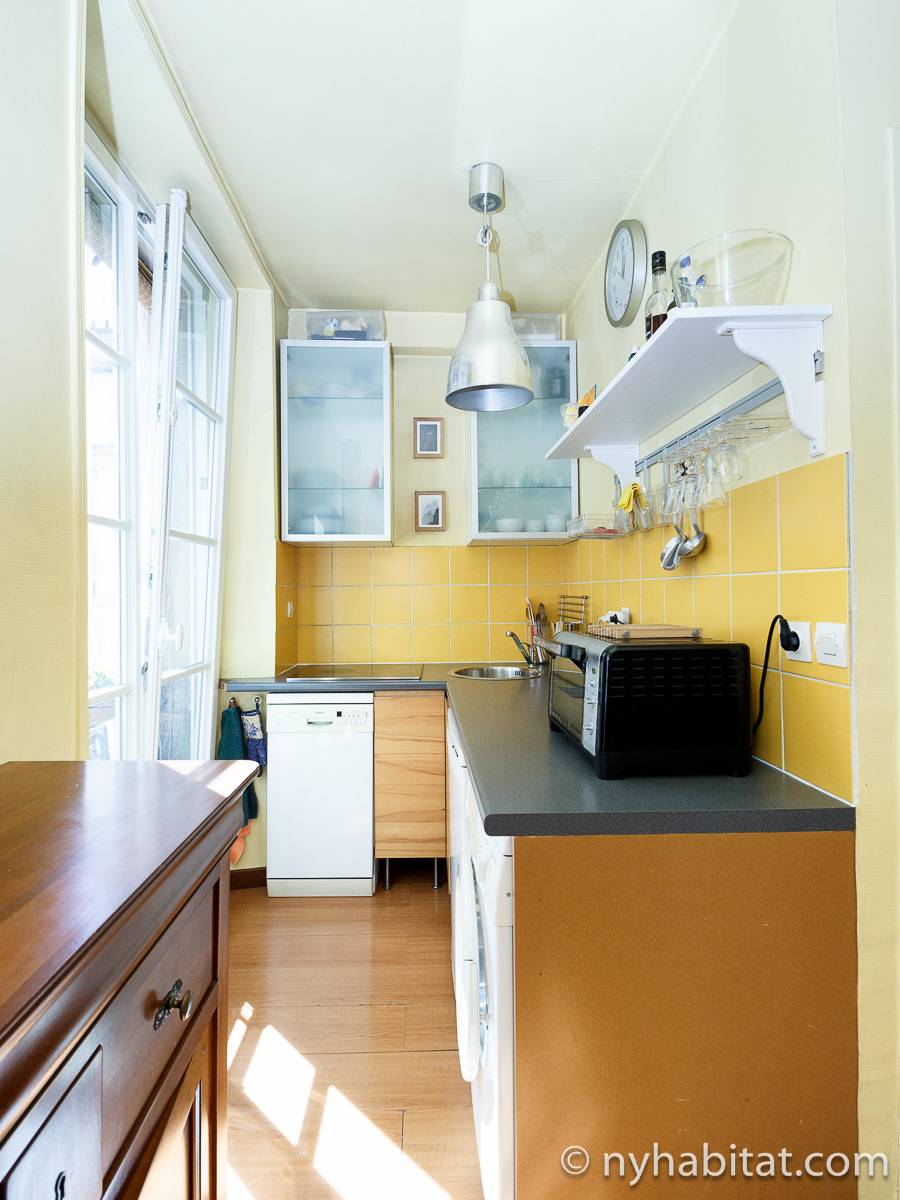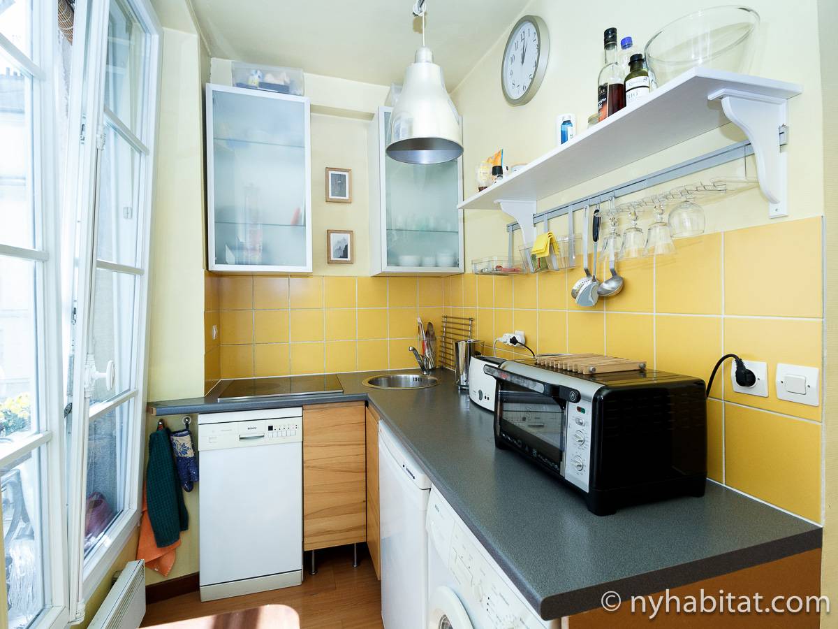 The open kitchen is equipped with four vitro ceramic plates, an oven, a refrigerator, a dishwasher and a toaster. There is also a washing machine.