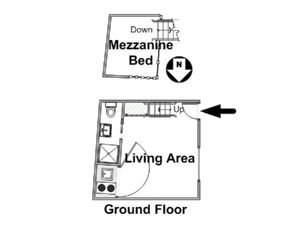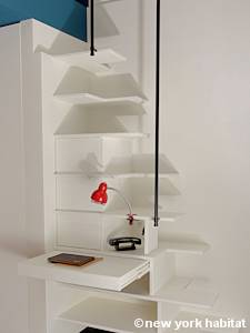 You will have it all in this former convent building dating from the 17th century! In the 1800s, it was converted to an artisan workspace and now houses apartments. Combining modern design elements with vintage furnishings from the '50s, the studio really stands out as an original! Downstairs you have the living area with a loveseat and small dining table that can fold out to provide extra space. The kitchenette can be hidden away behind a door that swings out from the wall, and is equipped with two electric burners and a small sink, as well as a microwave and coffee maker. Shelves provide an open space to put the dishware, and the bathroom and a closet hide behind sliding doors. Around the corner you have the stairs, which also function as shelving and even has a pull out desk to make a workspace! Upstairs is the lofted bed, which is open to the living area below; it is a double size mattress with shelving built into the wall.