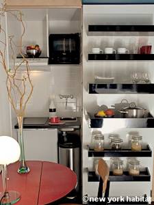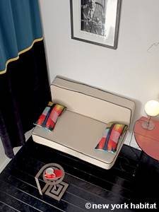 This studio is a marvel in design, equipped with space-saving pieces and carefully chosen furnishings. Located in the Mouffetard area, the apartment is on the ground floor of a 3 story building with a lovely interior courtyard, embellished with plants, a pleasant sight to look upon from your apartment. The very pathway outside of the building has been immortalized by the famous Parisian photographer, Eugène Atget. A digicode system provides entry to the building itself.