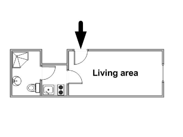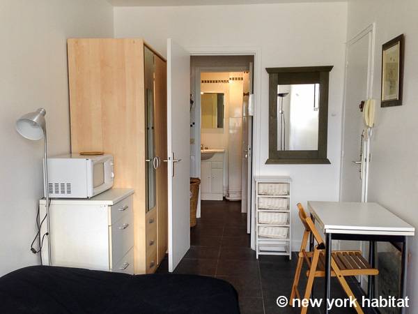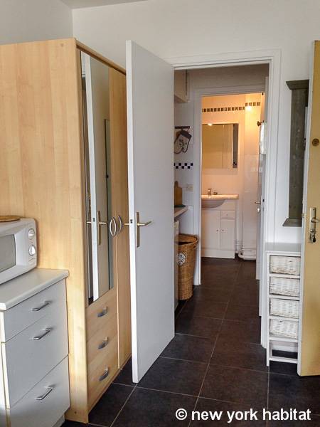 Placed on the residential streets of Avenue Niel and Rue Rennequin, the charming studio apartment sits on the 7th floor (considered 8th in U.S.) of a ten-story 20th century elevator building. An intercom accommodates easy guest entry, and a concierge assures comfort and privacy. For additional convenience, a private laundry washing machine is available in the home!
