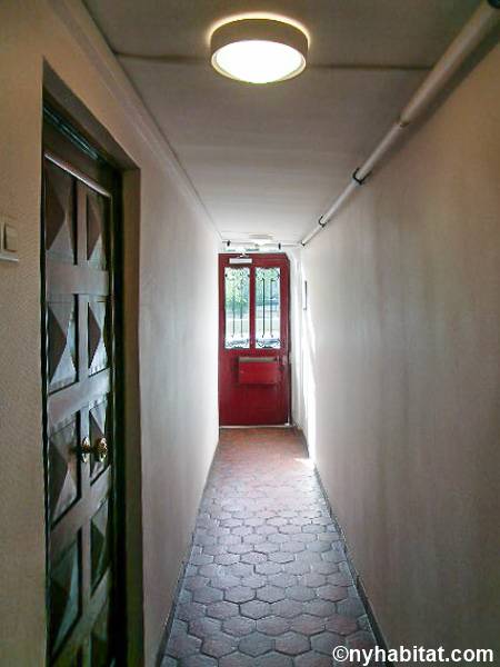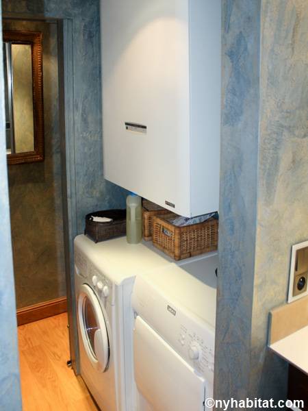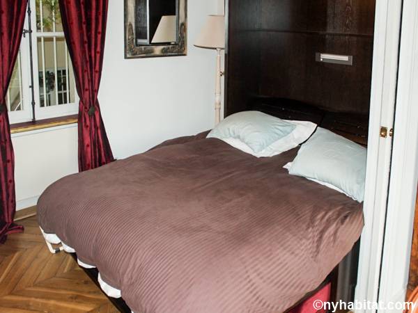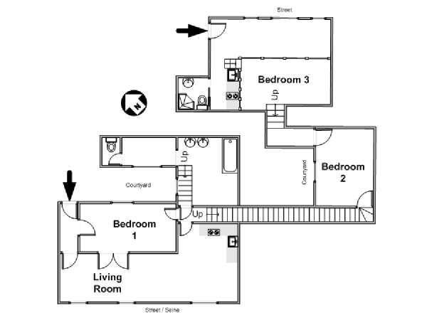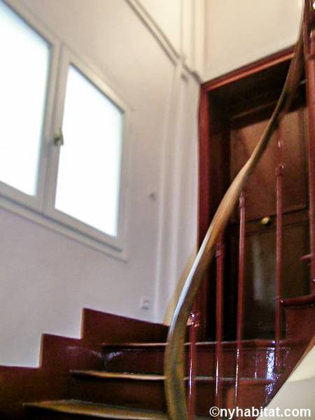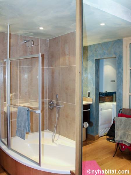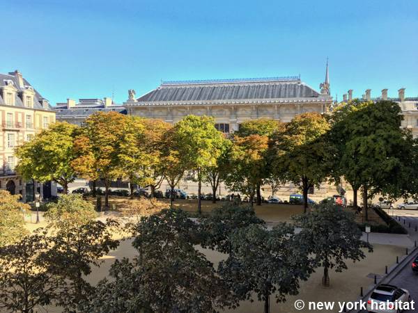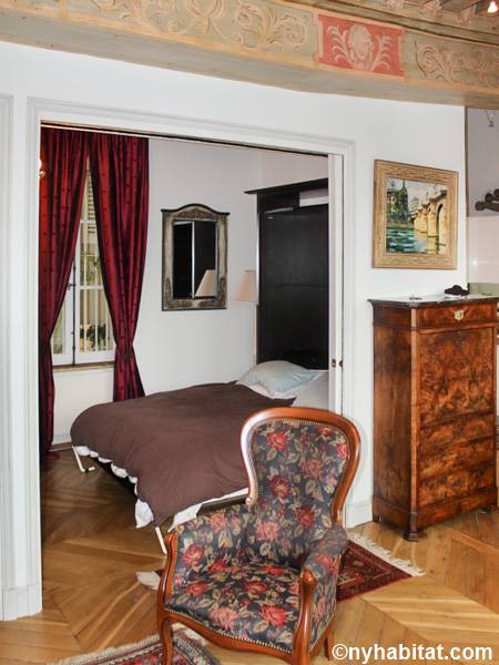 There are two separated entrances through two buildings facing opposite directions. Entering from Quai des Orfèvres on the Seine side, you’ll find an antique-furnished living room complete with French windows, a dining table, and a cable television. A bedroom (#3) with a double bed is located just through a set of French doors, with another bedroom (#2) located up a set of stairs and offering a queen bed. The main kitchen is open to this living room and has all the equipment you’ll need to cook at home, even a real oven and dishwasher for clean-up. One full bathroom is laid out along a hallway down another set of stairs, with a toilet, bathtub, sink, and washer/dryer.